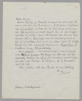 Het is mogelijk - niet waarschijnlijk! - dat ik spoedig naar Holland terugga. Het hangt van Bep af; bel dus zoonoodig daarheen op, als je het vervelend mocht vinden om voor niets hierheen te schrijven, of ik ‘verwacht’ word of niet.