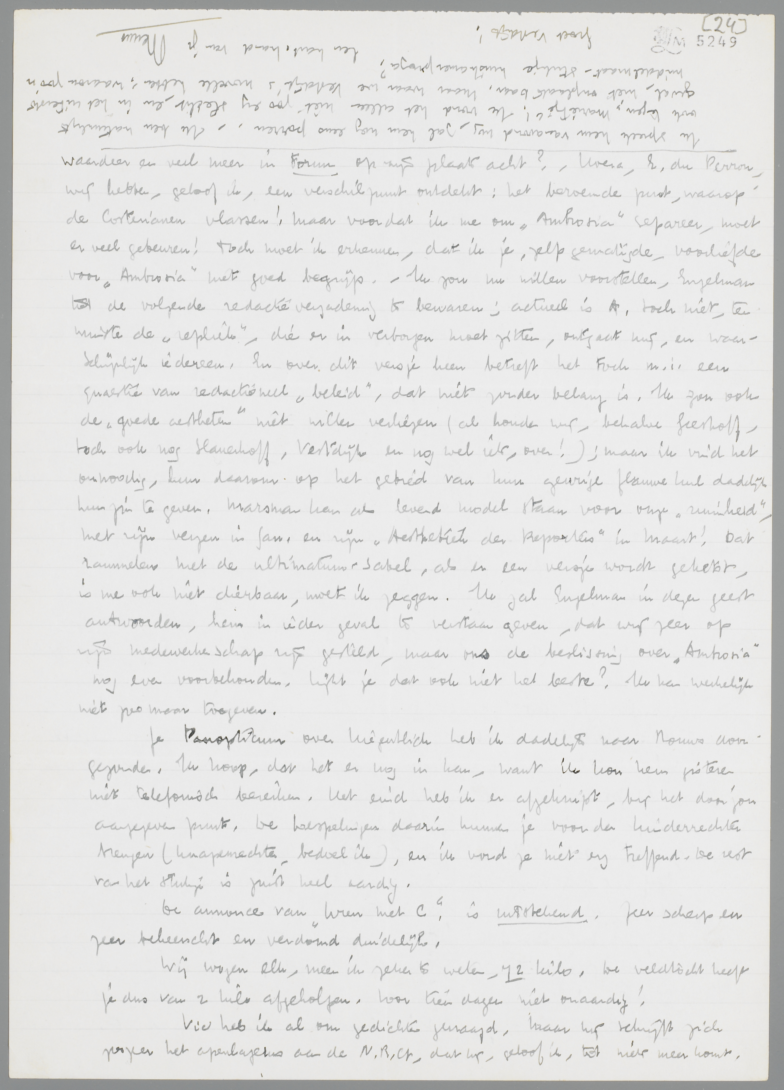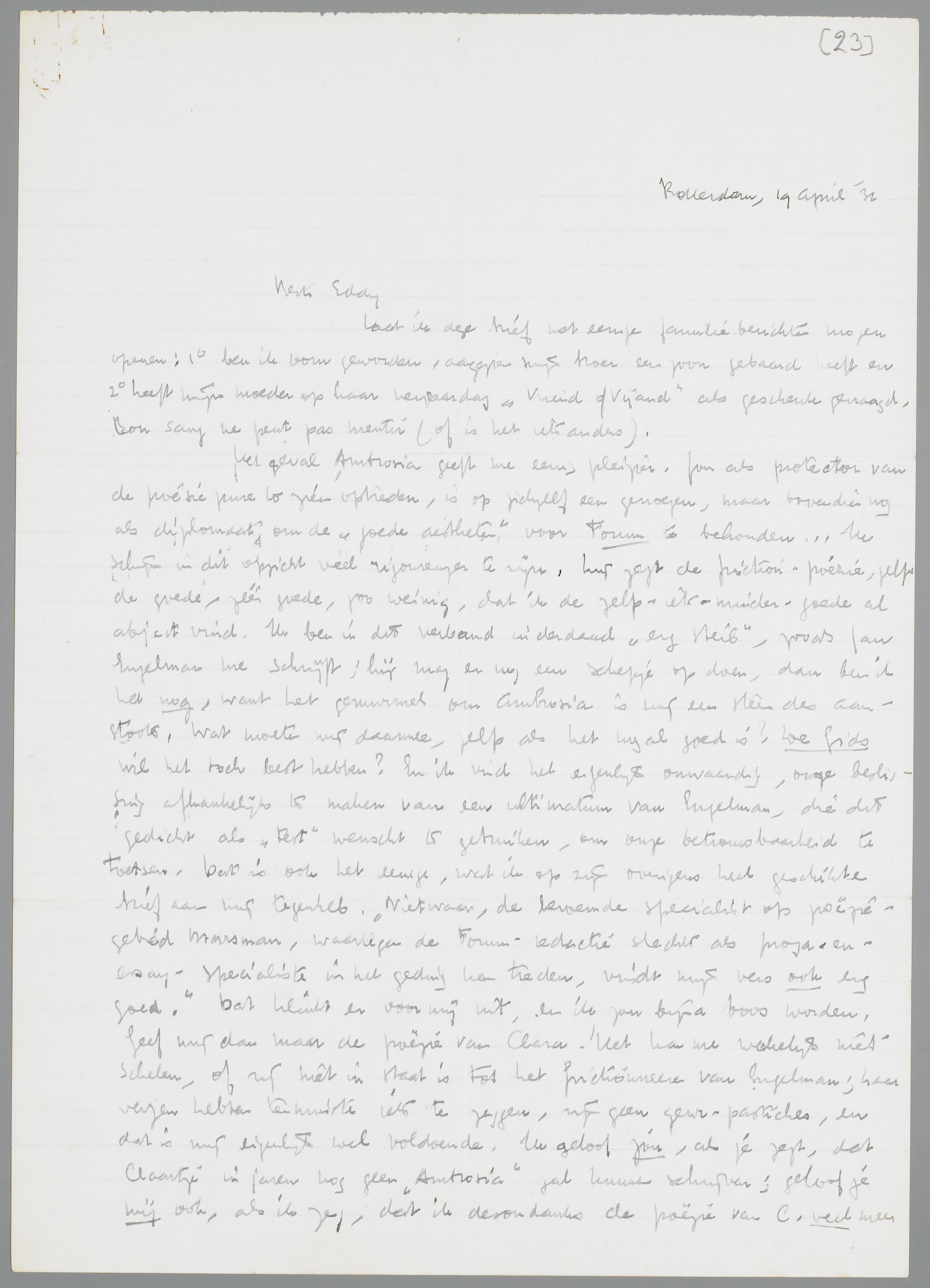 Het geval Ambrosia geeft me eenig pleizier. Jou als protector van de poésie pure te zien optreden, is op zichzelf een genoegen, maar bovendien nog als diplomaat om de ‘goede aestheten’ voor Forum te behouden... Ik schijn in dit opzicht veel rigoureuzer te zijn. Mij zegt de friction-poézie, zelfs de goede, zéér goede, zoo weinig, dat ik de zelfs-iets-minder-goede al abject vind. Ik ben in dit verband ‘erg steil’, zooals Jan Engelman me schrijft; hij mag er nog een schepje op doen, dan ben ik het nog, want het gemurmel om Ambrosia is mij een steen des aanstoots. Wat moeten wij daarmee, zelfs als het nogal goed is? De Gids wil het toch best hebben? En ik vind het eigenlijk onwaardig, onze beslissing afhankelijk te maken van een ultimatum van Engelman, die dit gedicht als ‘test’ wenscht te gebruiken, om onze betrouwbaarheid te toetsen. Dat is ook het eenige, wat ik op zijn overigens heel geschikte brief aan mij tegenheb. ‘Nietwaar, de beroemde specialist op poëzie-gebied Marsman, waartegen de Forum-redactie slechts als proza-en-essay-specialiste in het geding kan treden, vindt mijn vers ook erg goed.’ Dat klinkt er voor mij uit, en ik zou bijna boos worden. Geef mij dan maar de poëzie van Clara! Het kan me werkelijk niet schelen, of zij niet in staat is tot het frictionneeren van Engelman; haar verzen hebben tenminste iets te zeggen, zijn geen geur-pastiches, en dat is mij eigenlijk wel voldoende. Ik geloof jou, als je zegt, dat Claartje in jaren nog geen Ambrosia zal kunnen schrijven; geloof je mij ook, als ik zeg, dat ik desondanks de poëzie van C. veel meer waardeer en veel meer in Forum op zijn plaats acht? Hoera, E. du Perron, wij hebben, geloof ik, een verschilpunt ontdekt: het beroemde punt, waarop de Costerianen vlassen! Maar voordat ik me om Ambrosia separeer, moet er veel gebeuren! Toch moet ik erkennen, dat ik je, zelfs gematigde, voorliefde voor Ambrosia niet goed begrijp. Ik zou nu willen voorstellen, Engelman tot de volgende redactievergadering te bewaren; actueel is A. toch niet, ten minste de ‘repliek’, die er in verborgen moet zitten, ontgaat mij, en waarschijnlijk iedereen. En over dit versje heen betreft het toch m.i. een quaestie van redactioneel ‘beleid’, dat niet zonder belang is. Ik zou ook de ‘goede aestheten’ niet willen verliezen (al houden wij, behalve Greshoff, toch ook nog Slauerhoff, Vestdijk en nog wel iets, over!); maar ik vind het onnoodig, hun daarom op het gebied van hun geurige flauwe kul dadelijk hun zin te geven. Marsman kan als levend model staan voor onze ‘ruimheid’, met zijn verzen in Jan. en zijn Aesthetiek der Reporters in Maart! Dat rammelen met de ultimatum-sabel, als er een versje wordt geketst, is me ook niet dierbaar, moet ik zeggen. Ik zal Engelman in dezen geest antwoorden, hem in ieder geval te verstaan geven, dat wij zeer op zijn medewerkerschap zijn gesteld, maar ons de beslissing over Ambrosia nog even voorbehouden. Lijkt je dat ook niet het beste? Ik kan werkelijk niet zoo maar toegeven.
