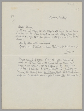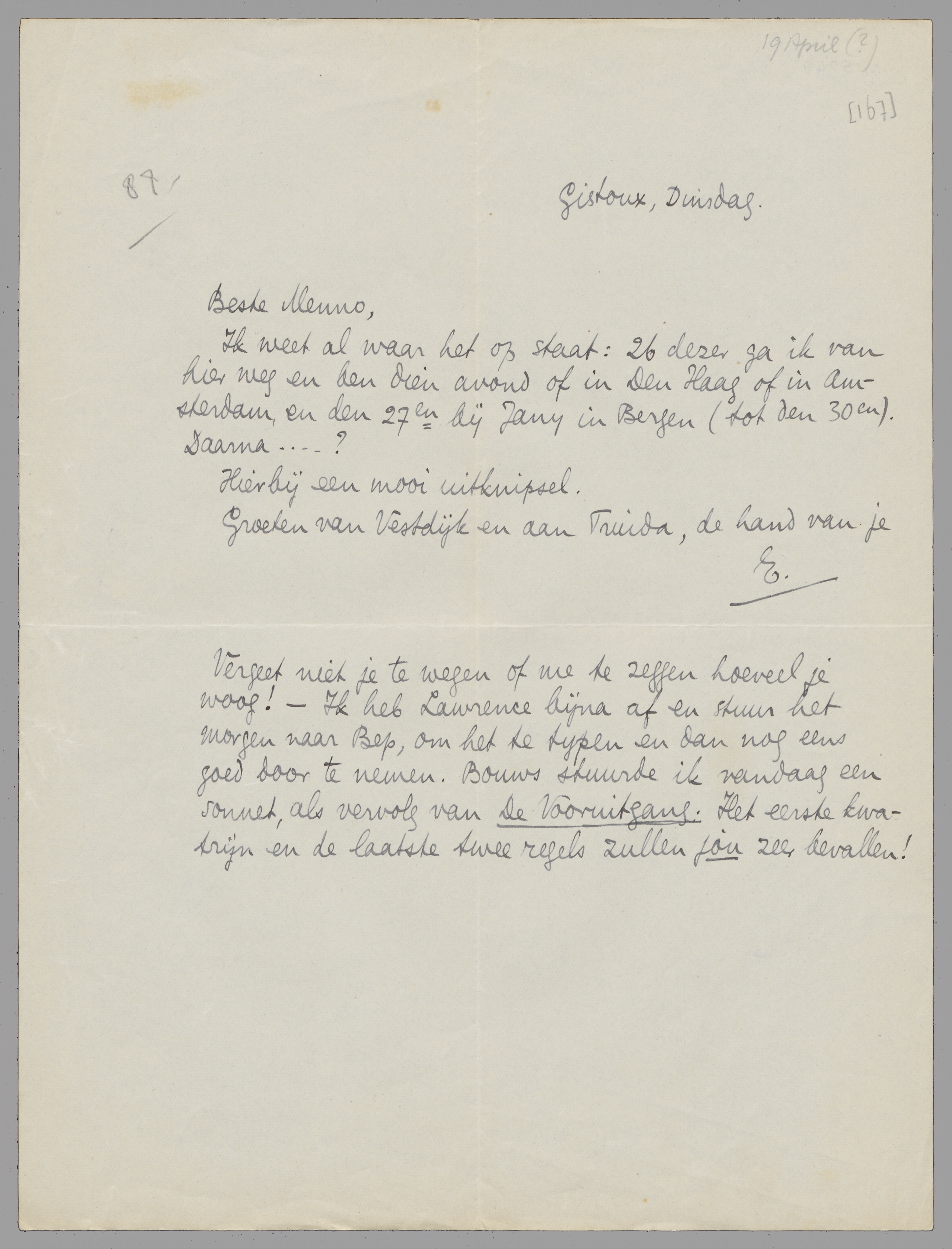 Vergeet niet je te wegen of me te zeggen hoeveel je woog! - Ik heb Lawrence bijna af en stuur het morgen naar Bep, om het te typen en dan nog eens goed door te nemen. Bouws stuurde ik vandaag een sonnet, als vervolg van De Vooruitgang. Het eerste kwatrijn en de laatste twee regels zullen jou zeer bevallen!