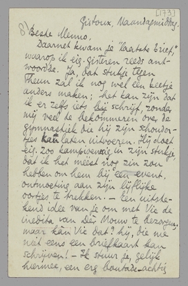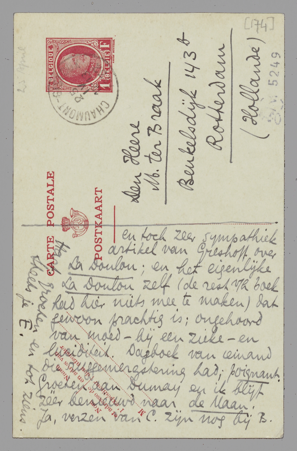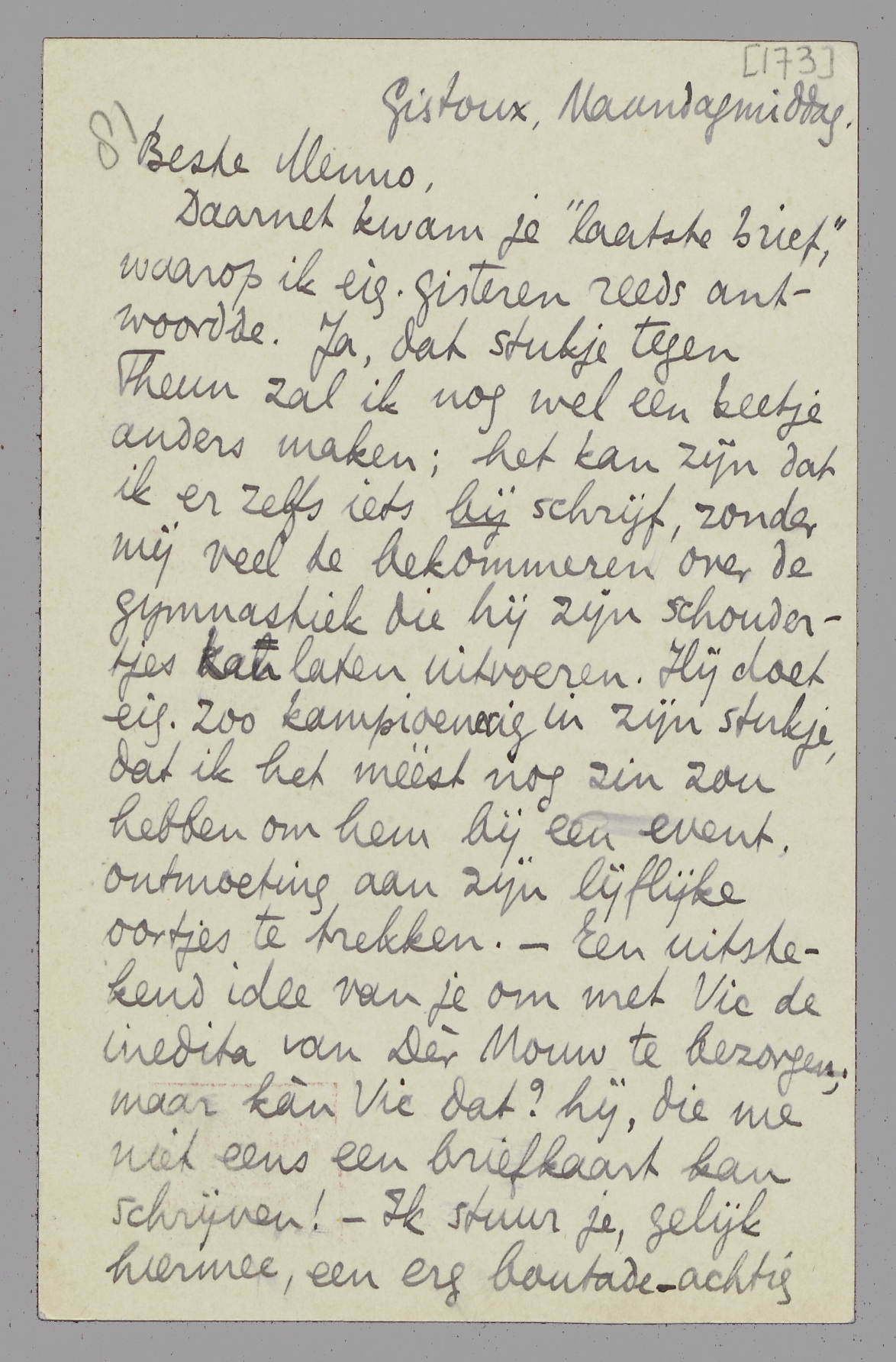Daarnet kwam je ‘laatste brief’, waarop ik eig. gisteren reeds antwoordde. Ja, dat stukje tegen Theun zal ik nog wel een beetje anders maken; het kan zijn dat ik er zelfs iets bij schrijf, zonder mij veel te bekommeren over de gymnastiek die hij zijn schoudertjes kan laten uitvoeren. Hij doet eig. zoo kampioenerig in zijn stukje, dat ik het méést nog zin zou hebben om hem bij een event. ontmoeting aan zijn lijflijke oortjes te trekken. - Een uitstekend idee van je om met Vic de inedita van Dèr Mouw te bezorgen; maar kàn Vic dat? hij, die me niet eens een briefkaart kan schrijven! - Ik stuur je, gelijk hiermee, een erg boutade-achtig en toch zeer sympathiek artikel van Greshoff over La Doulou; en het eigenlijke La Doulou zelf (de rest v/h boek had hier niets mee te maken) dat gewoon prachtig is; ongehoord van moed - bij een zieke - en luciditeit. Dagboek van iemand die ruggemergstering had; poignant. Groeten aan Dumay en ik blijf zéér benieuwd naar de Maan. Ja, verzen van C. zijn nog bij B.