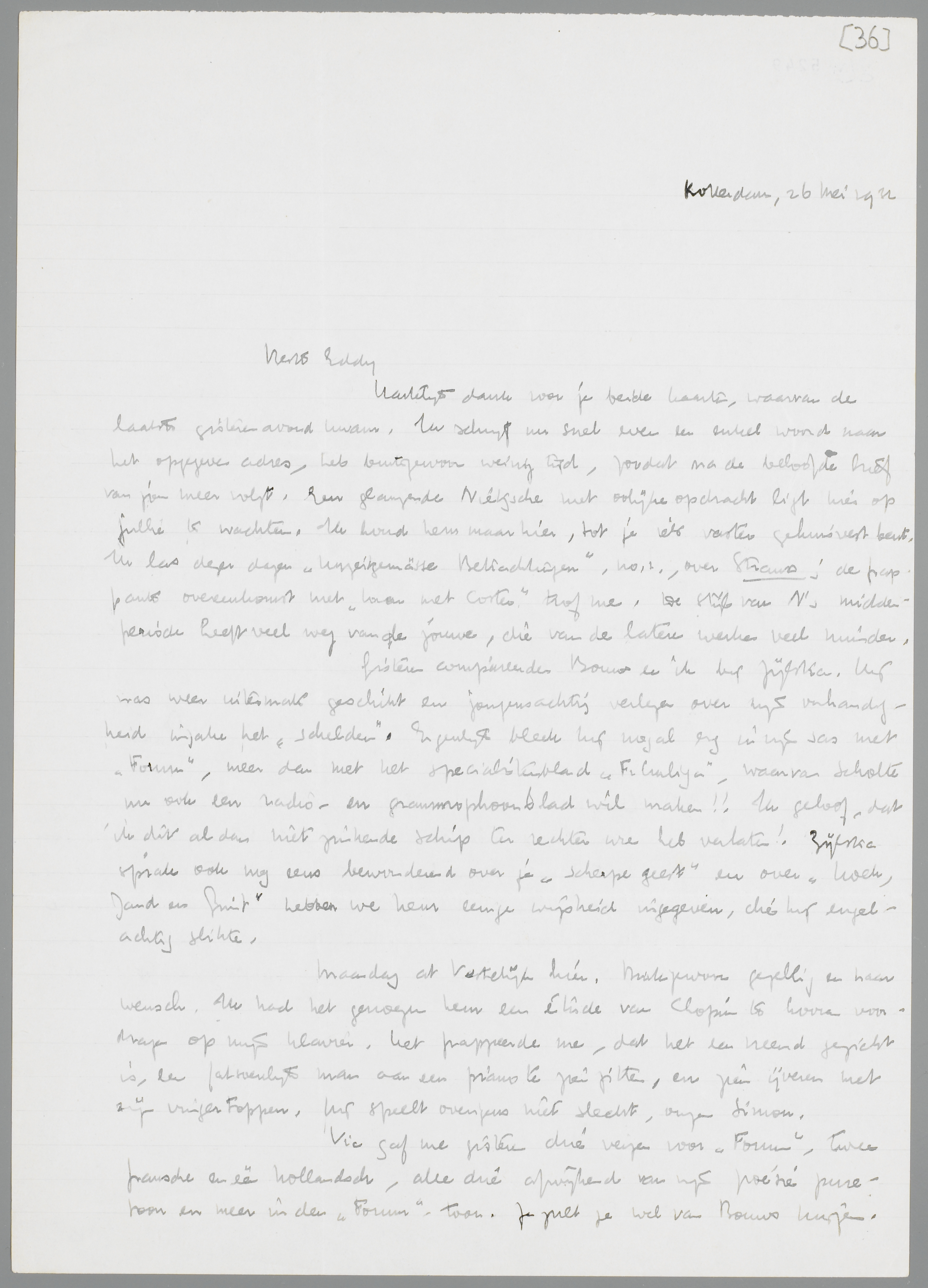Maandag at Vestdijk hier. Buitengewoon gezellig en naar wensch. Ik had het genoegen hem een étude van Chopin te hooren voordragen op mijn klavier. Het frappeerde me, dat het een vreemd gezicht is, een fatsoenlijk man aan een piano te zien zitten, en zien ijveren met zijn vingertoppen. Hij speelde overigens niet slecht, onzen Simon.