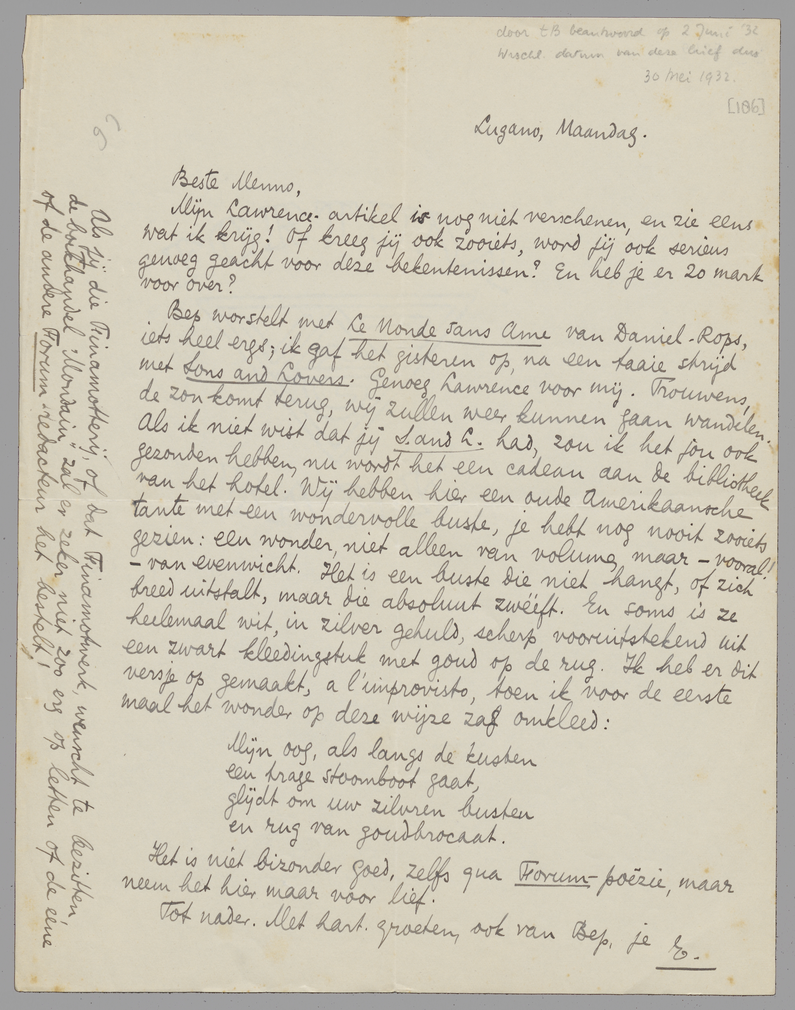Bep worstelt met Le Monde Sans Ame van Daniel-Rops, iets heel ergs; ik gaf het gisteren op, na een taaie strijd met Sons and Lovers. Genoeg Lawrence voor mij. Trouwens, de zon komt terug, wij zullen weer kunnen gaan wandelen. Als ik niet wist dat jij S. and L. had, zou ik het jou ook gezonden hebben, nu wordt het een cadeau aan de bibliotheek van het hotel. Wij hebben hier een oude Amerikaansche tante met een wondervolle buste, je hebt nog nooit zooiets gezien: een wonder, niet alleen van volume, maar - vooral! - van evenwicht. Het is een buste die niet hangt, of zich breed uitstalt, maar die absoluut zwééft. En soms is ze heelemaal wit, in zilver gehuld, scherp vooruitstekend uit een zwart kleedingstuk met goud op de rug. Ik heb er dit versje op gemaakt, a l'improvisto, toen ik voor de eerste maal het wonder op deze wijze zag omkleed: