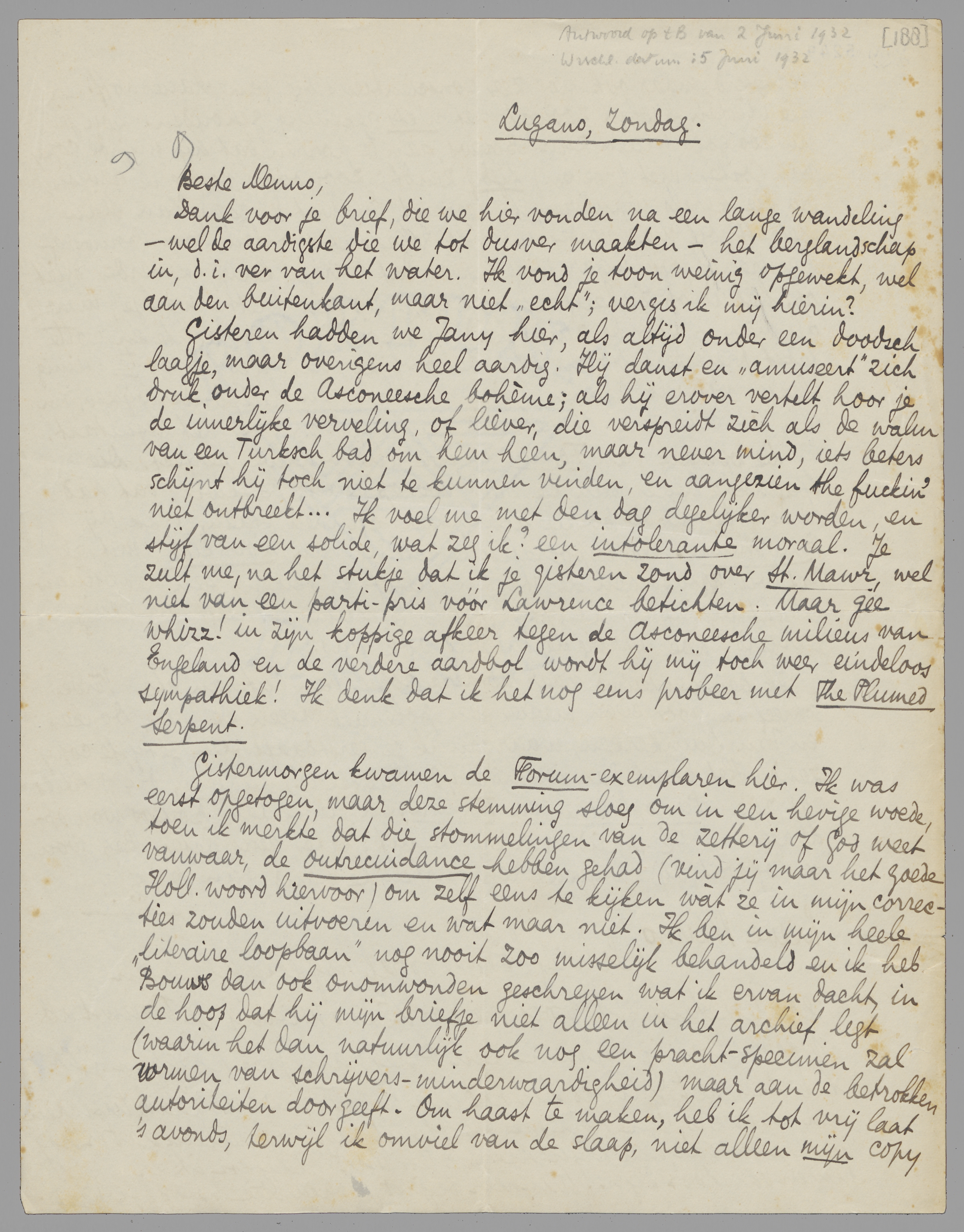 Gisteren hadden we Jany hier, als altijd onder een doodsch laagje, maar overigens heel aardig. Hij danst en ‘amuseert’ zich druk, onder de Asconeesche bohème; als hij er over vertelt hoor je de innerlijke verveling, of liever, die verspreidt zich als de walm van een Turksch bad om hem heen, maar never mind, iets beters schijnt hij toch niet te kunnen vinden, en aangezien the fuckin' niet ontbreekt... Ik voel me met de dag degelijker worden, en stijf van een solide, wat zeg ik? een intolerante moraal. Je zult me, na het stukje dat ik je gisteren zond over St. Mawr, wel niet van een parti-pris vóór Lawrence betichten. Maar gee whizz! in zijn koppige afkeer tegen de Asconeesche milieus van Engeland en de verdere aardbol wordt hij mij toch weer eindeloos sympathiek! Ik denk dat ik het nog eens probeer met The Plumed Serpent.