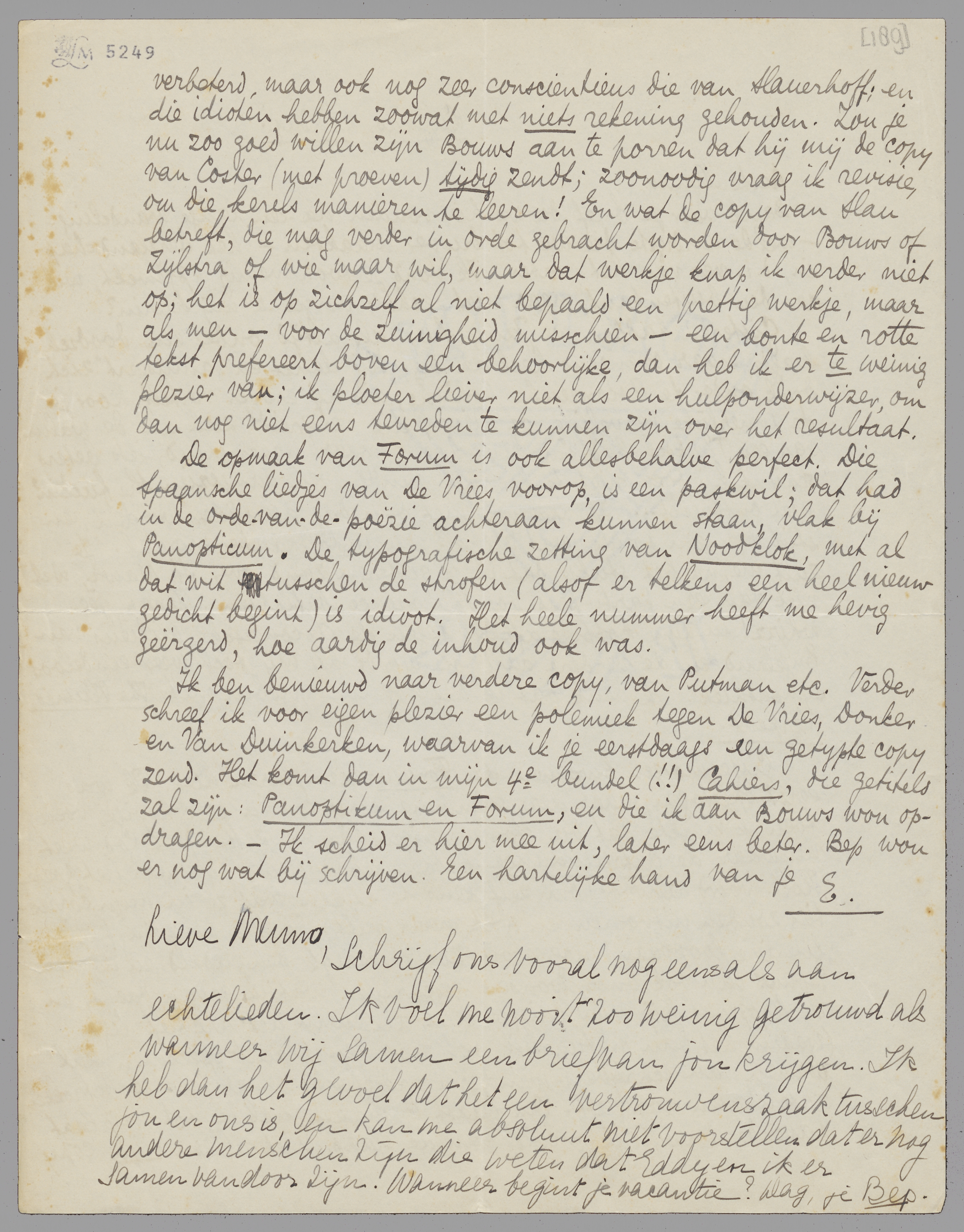 Ik ben benieuwd naar verdere copy, van Putman etc. Verder schreef ik voor eigen plezier een polemiek tegen De Vries, Donker en Van Duinkerken, waarvan ik je eerstdaags een getypte copy zend. Het komt dan in mijn 4e bundel(!!) Cahiers, die getiteld zal zijn: Panoptikum en Forum, en die ik aan Bouws wou opdragen. - Ik scheid er hier mee uit, later eens beter. Bep wou er nog wat bij schrijven. Een hartelijke hand van je