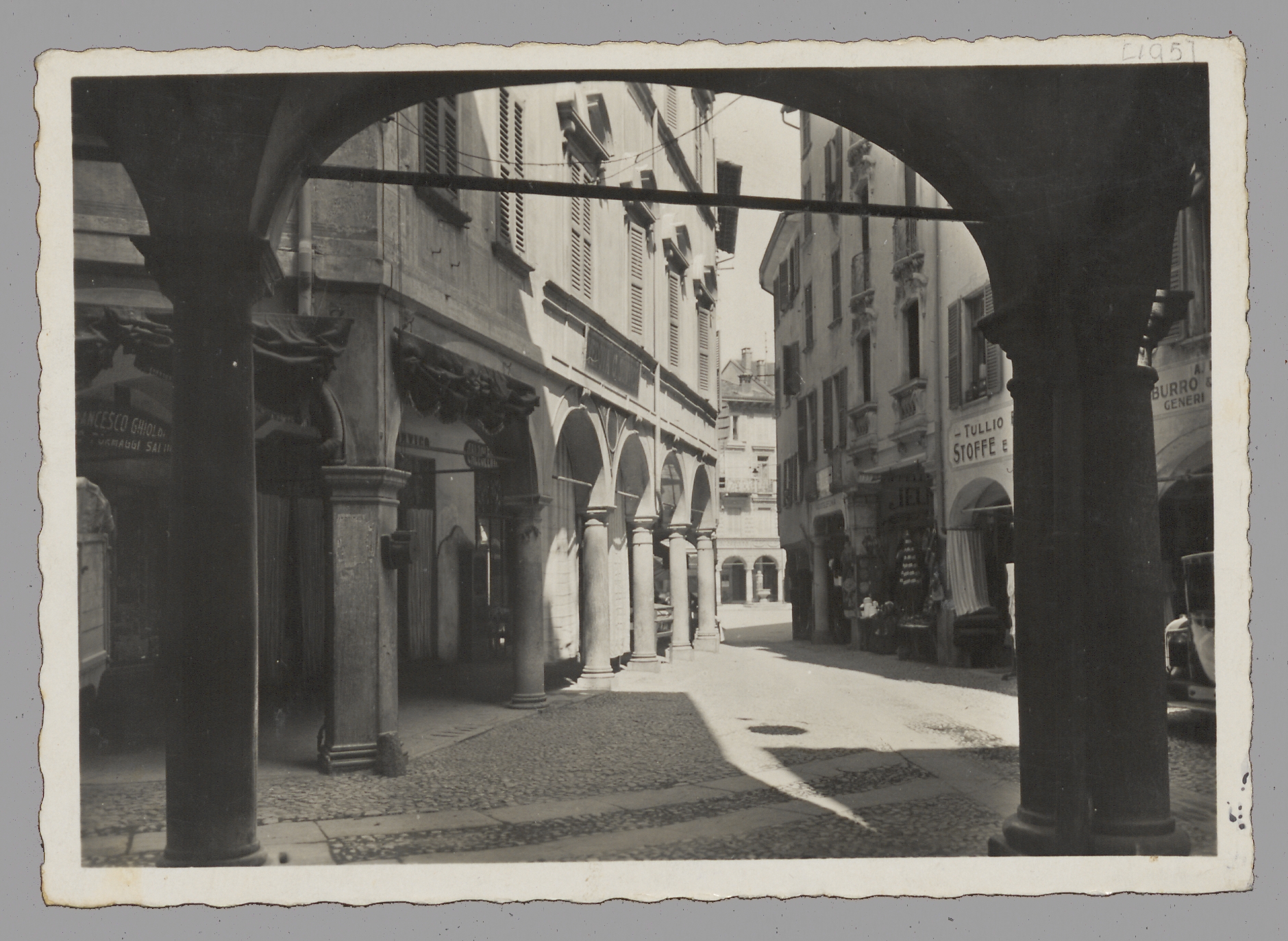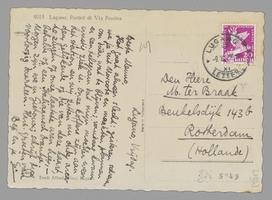 Het gaat alweer slecht: gisteren schreven we je uit Morcote en maakten plannen om dààr wat te blijven; vandaag kwam er een telegram dat mijn moeder weer ernstig ziek is. Onze koffers zijn aan het station en wij zitten nu onder arcaden, gelijkende op die van deze kaart, te zuigen op onze laatste uren hier, - behalve op een Italiaansch drankje. Morgen zijn we in Gistoux; schrijf dus voorloopig daarheen. Hart. Groeten van Bep en je