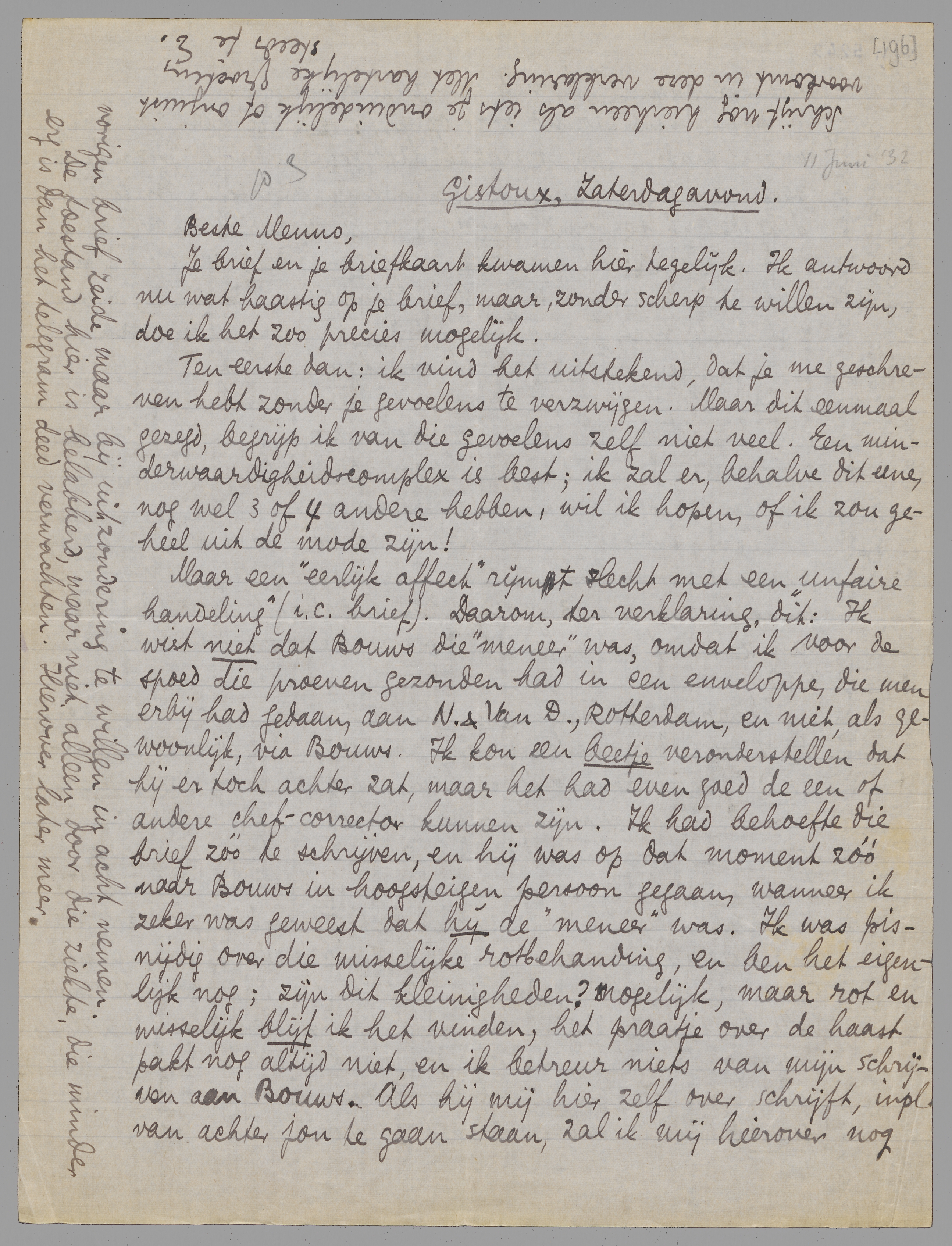 Maar een ‘eerlijk affect’ rijmt slecht met een ‘unfaire handeling’ (i.c. brief). Daarom, ter verklaring, dit: Ik wist niet dat Bouws die ‘meneer’ was, omdat ik voor de spoed die proeven gezonden had in een enveloppe, die men erbij had gedaan, aan N. & Van D., Rotterdam, en niet, als gewoonlijk, via Bouws. Ik kon een beetje veronderstellen dat hij er toch achter zat, maar het had even goed de een of andere chef-corrector kunnen zijn. Ik had behoefte die brief zóó te schrijven, en hij was op dat moment zóó naar Bouws in hoogsteigen persoon gegaan, wanneer ik zeker was geweest dat hij de ‘meneer’ was. Ik was pisnijdig over die misselijke rotbehandeling, en ben het eigenlijk nog; zijn dit kleinigheden? mogelijk, maar rot en misselijk blijf ik het vinden, het praatje over de haast pakt nog altijd niet, en ik betreur niets van mijn schrijven aan Bouws. Als hij mij hier zelf over schrijft, inpl. van achter jou te gaan staan, zal ik mij hierover nog verder, en duidelijk, met hemzelf verstaan.