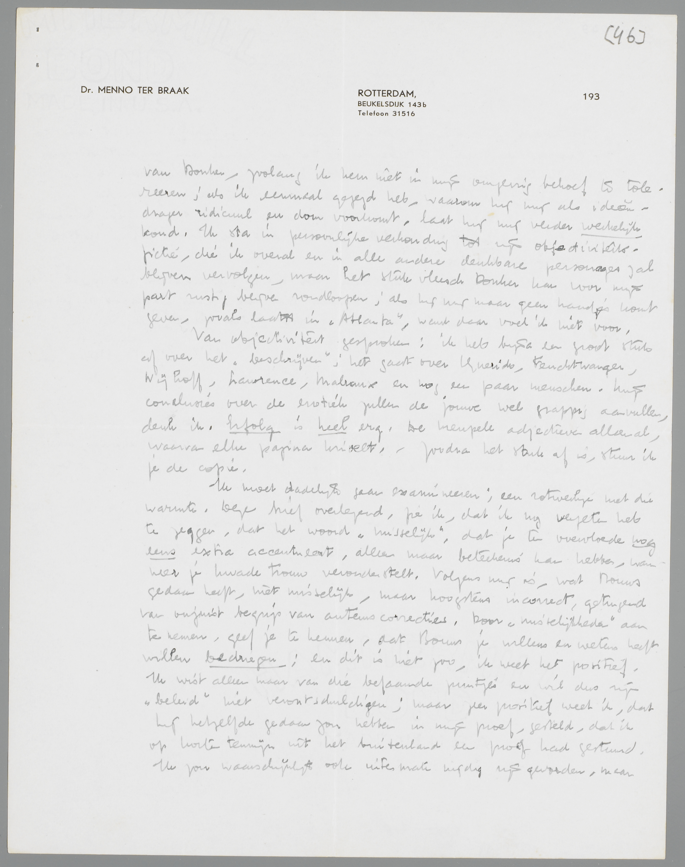 Van objectiviteit gesproken: ik heb bijna een groot stuk af over het ‘beschrijven’; het gaat over Querido, Feuchtwanger, Nijhoff, Lawrence, Malraux en nog een paar menschen. Mijn conclusies over de erotiek zullen de jouwe wel grappig aanvullen, denk ik. Erfolg is heel erg. De kreupele adjectieven alleen al, waarvan elke pagina krioelt. - Zoodra het stuk af is, stuur ik je de copie.