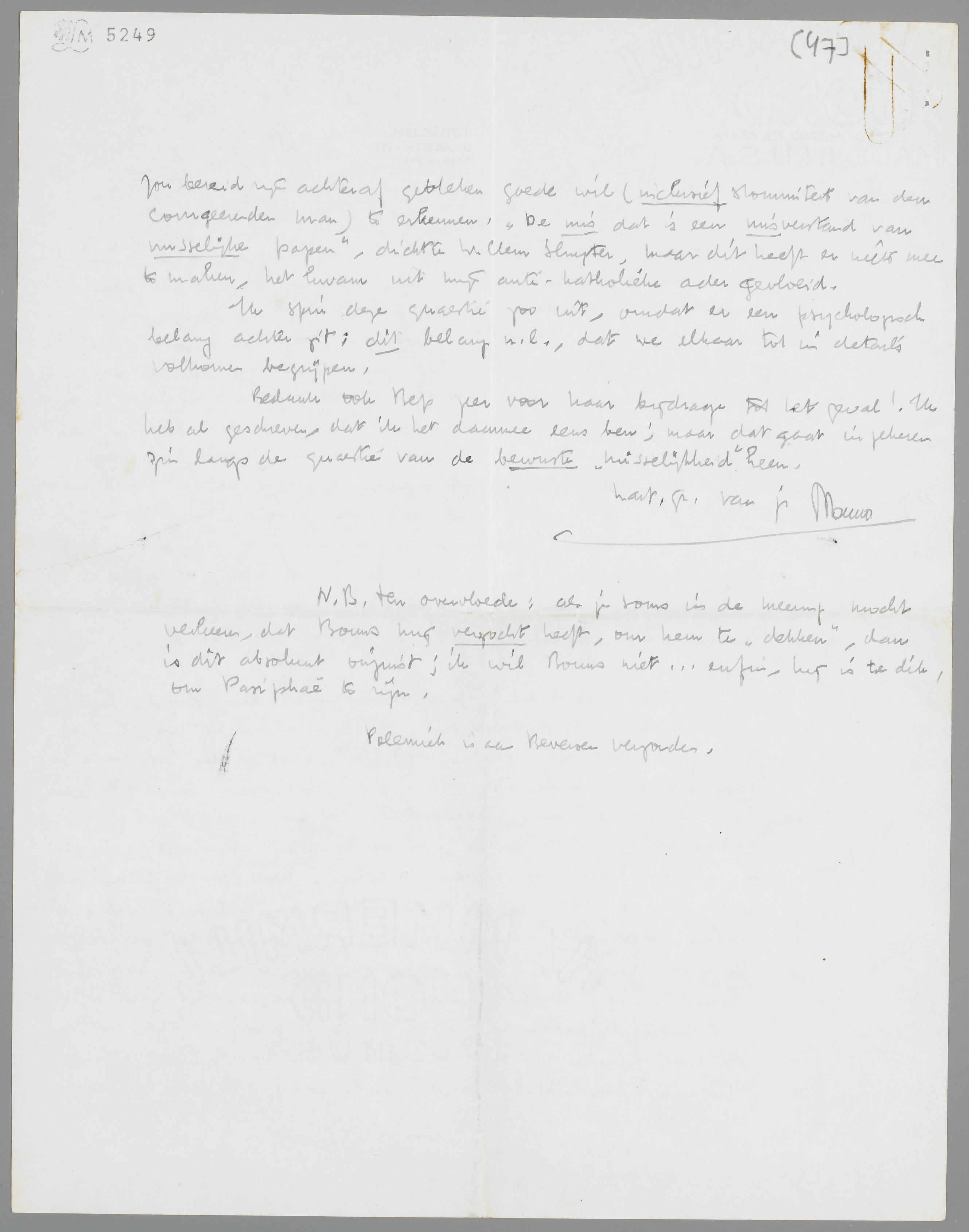 N.B. ten overvloede: als je soms in de meening mocht verkeeren, dat Bouws mij verzocht heeft, om hem te ‘dekken’, dan is dit absoluut onjuist; ik wil Bouws niet... enfin, hij is te dik, om Pasiphaë te zijn.