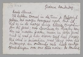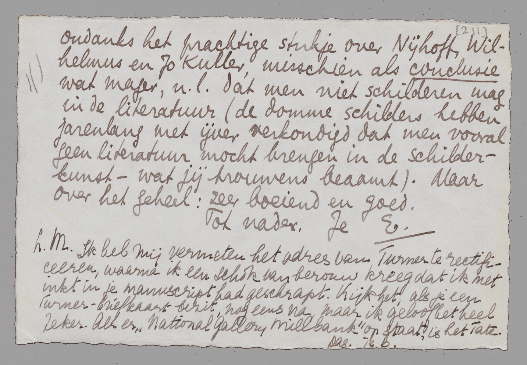 We hebben zoonet in den tuin je Paletstuk gelezen, dat morgen doorgaat naar Ant. Ik heb er in de marge eenige kleine opmerkingen bij gezet; over Lawrence en Huxley zouden we moeten praten, maar in ieder geval vind ik wat je hier erover zegt heel grappig. Het stuk is misschien wat lang voor het onderwerp, en ondanks vele heele aardige opmerkingen over ons bête noire: de domheid, ondanks het prachtige stukje over Nijhoff, Wilhelmus en Jo Kuller, misschien als conclusie wat mager, n.l. dat men niet schilderen mag in de literatuur (de domme schilders hebben jarenlang met ijver verkondigd dat men vooral geen literatuur mocht brengen in de schilderkunst - wat jij trouwens beaamt). Maar over het geheel: zeer boeiend en goed.