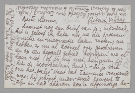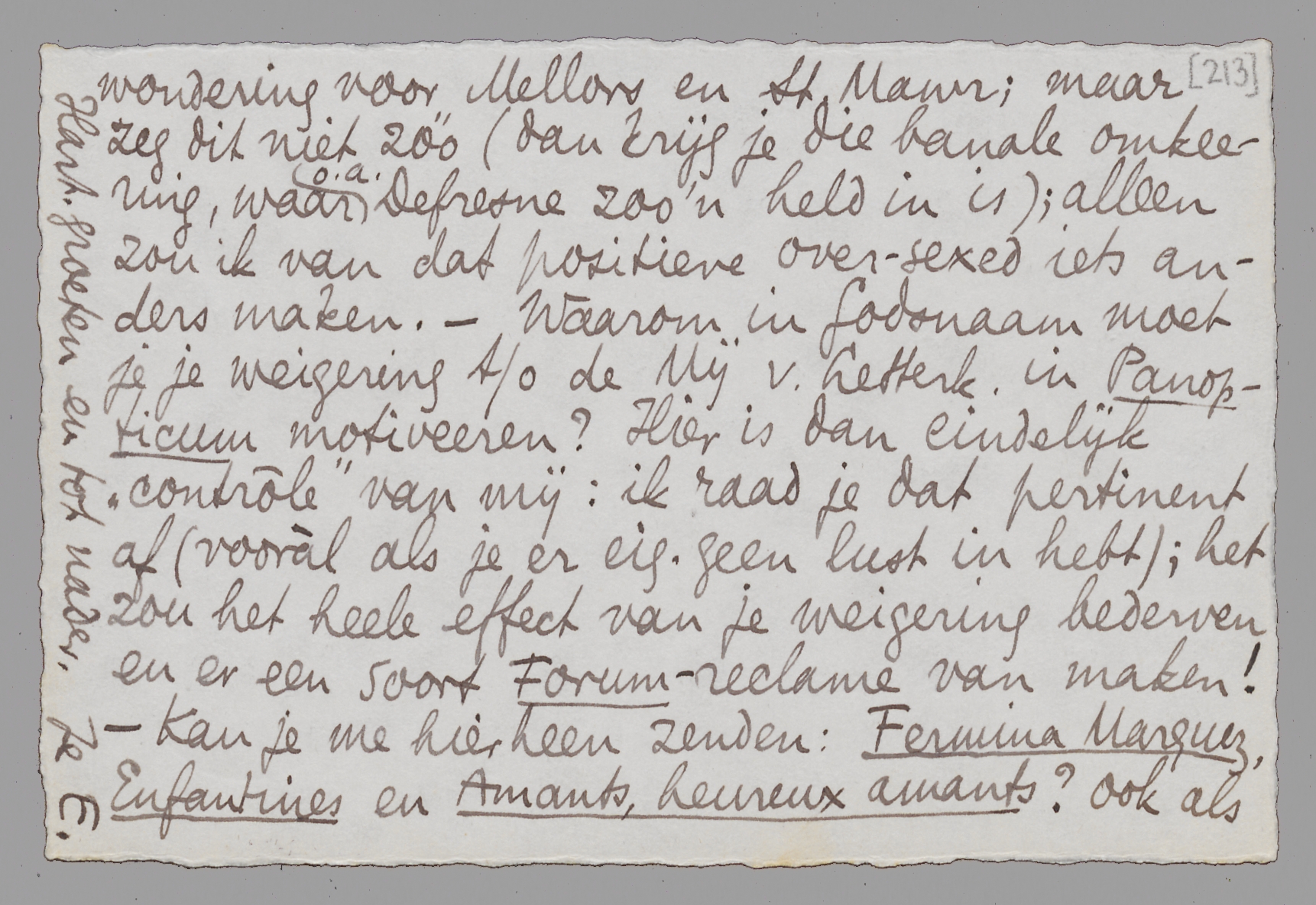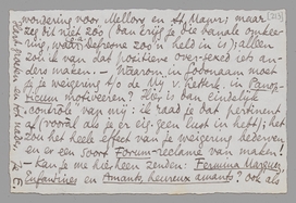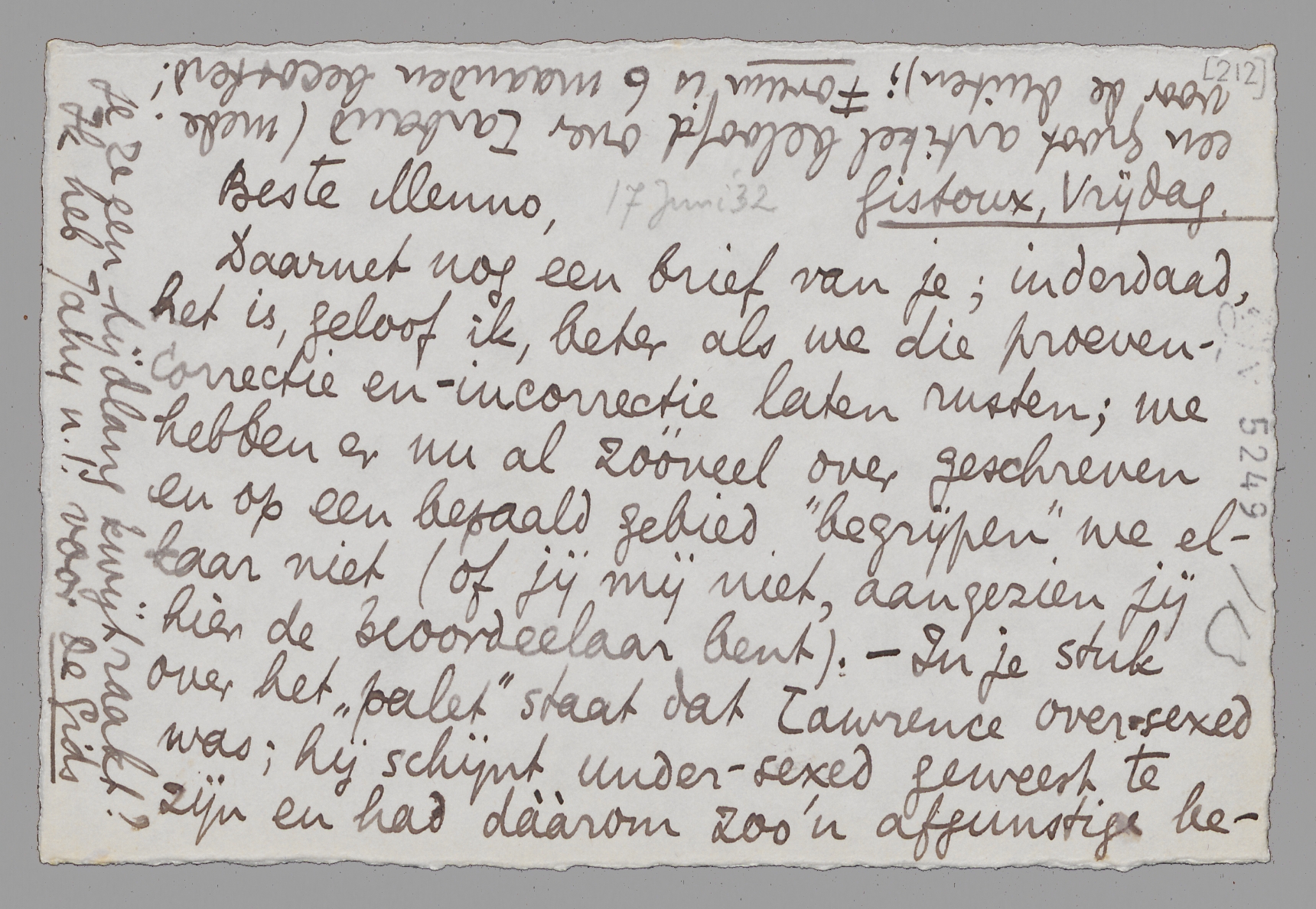 Daarnet nog een brief van je; inderdaad, het is, geloof ik, beter als we die proeven-correctie en -incorrectie laten rusten; we hebben er nu al zóóveel over geschreven en op een bepaald gebied ‘begrijpen’ we elkaar niet (of jij mij niet, aangezien jij hier de beoordeelaar bent). - In je stuk over het ‘palet’ staat dat Lawrence over-sexed was; hij schijnt undersexed geweest te zijn en had dààrom zoo'n afgunstige bewondering voor Mellors en St. Mawr; maar zeg dit niet zóó (dan krijg je die banale omkeering, waar o.a. Defresne zoo'n held in is); alleen zou ik van dat positieve over-sexed iets anders maken. - Waarom in Godsnaam moet je je weigering t/o de Mij. v. Letterk. in Panopticum motiveeren? Hier is dan eindelijk ‘contrôle’ van mij: ik raad je dat pertinent af (vooràl als je er eig. geen lust in hebt;) het zou het heele effect van je weigering bederven en er een soort Forum-reclame van maken! - Kan je me hierheen zenden: Fermina Marquez, Enfantines en Amants, heureux amants? ook als je ze een tijdlang kwijt raakt? Ik heb Jany n.l. voor De Gids een groot artikel beloofd over Larbaud (mede voor de duiten); Forum is 6 maanden becosterd!