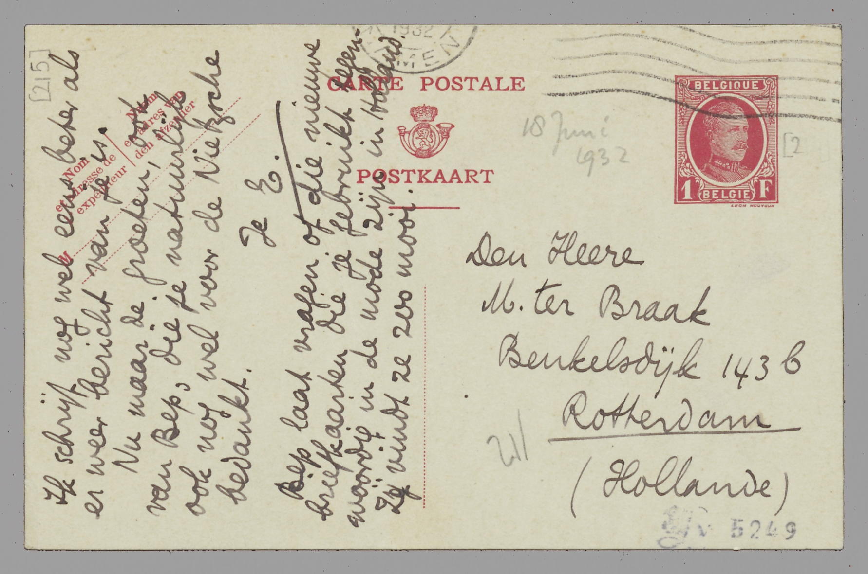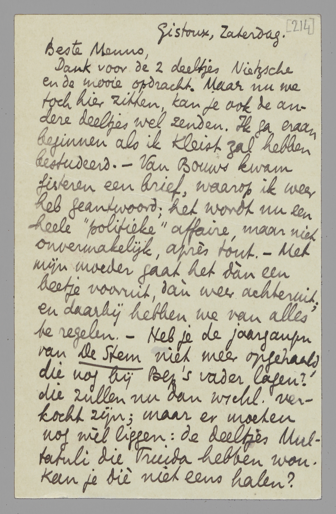 Dank voor de 2 deeltjes Nietzsche en de mooie opdracht. Maar nu we toch hier zitten, kan je ook de andere deeltjes wel zenden. Ik ga eraan beginnen als ik Kleist zal hebben bestudeerd. - Van Bouws kwam gisteren een brief, waarop ik weer heb geantwoord; het wordt nu een heele ‘politieke’ affaire, maar niet onvermakelijk, après tout. - Met mijn moeder gaat het dàn een beetje vooruit, dàn weer achteruit; en daarbij hebben we van alles te regelen. - Heb je de jaargangen van De Stem niet meer opgehaald, die nog bij Bep's vader lagen? die zullen nu dan wschl. verkocht zijn; maar er moeten nog wèl liggen: de deeltjes Multatuli die Truida hebben wou. Kan je diè niet eens halen? Ik schrijf nog wel eens beter als er weer bericht van je is.