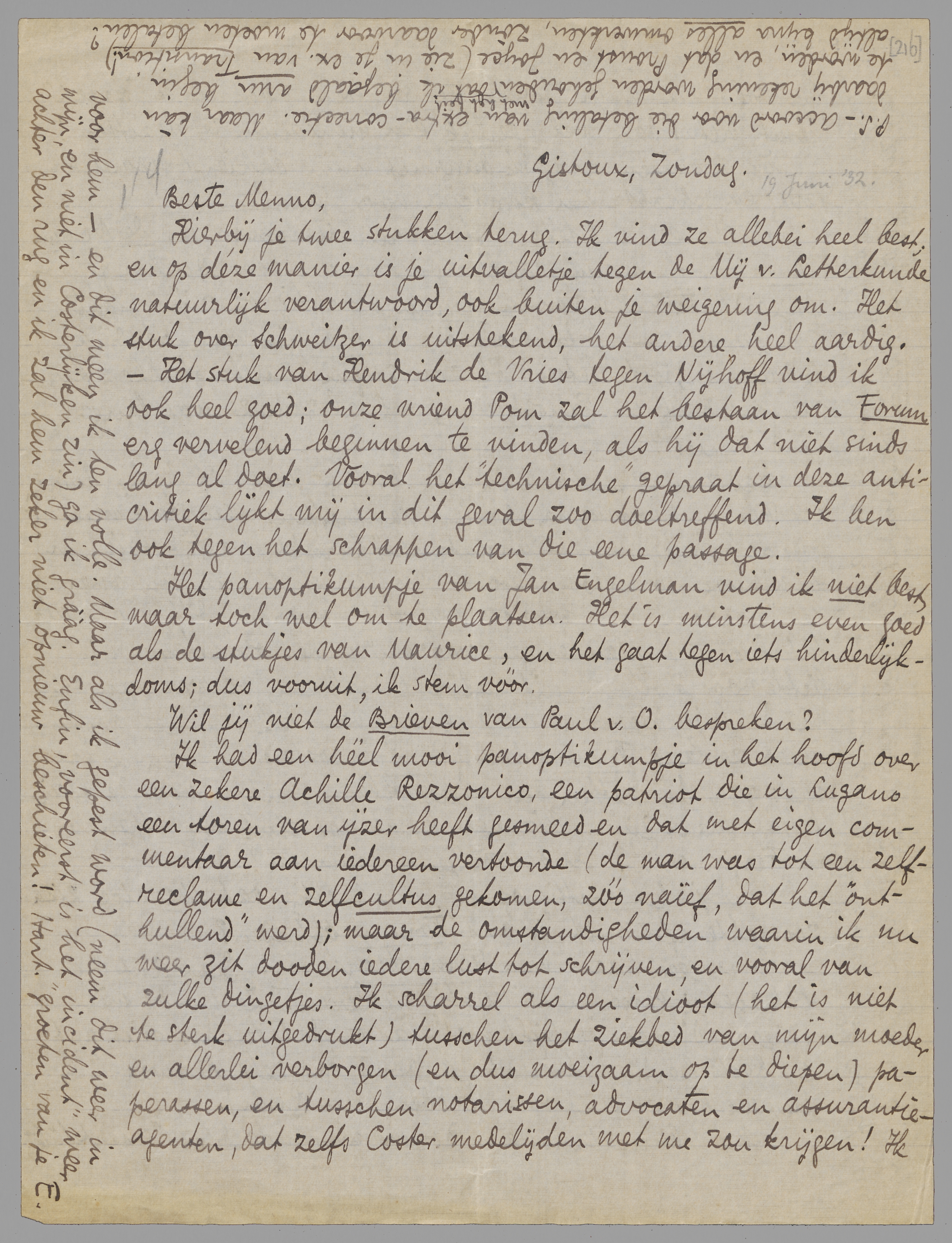 Hierbij je twee stukken terug. Ik vind ze allebei heel best; en op déze manier is je uitvalletje tegen de Mij. v. Letterkunde natuurlijk verantwoord, ook buiten je weigering om. Het stuk over Schweitzer is uitstekend, het andere heel aardig. - Het stuk van Hendrik de Vries tegen Nijhoff vind ik ook heel goed; onze vriend Pom zal het bestaan van Forum erg vervelend beginnen te vinden, als hij dat niet sinds lang al doet. Vooral het ‘technische’ gepraat in deze anti-critiek lijkt mij in dit geval zoo doeltreffend. Ik ben ook tegen het schrappen van die eene passage.