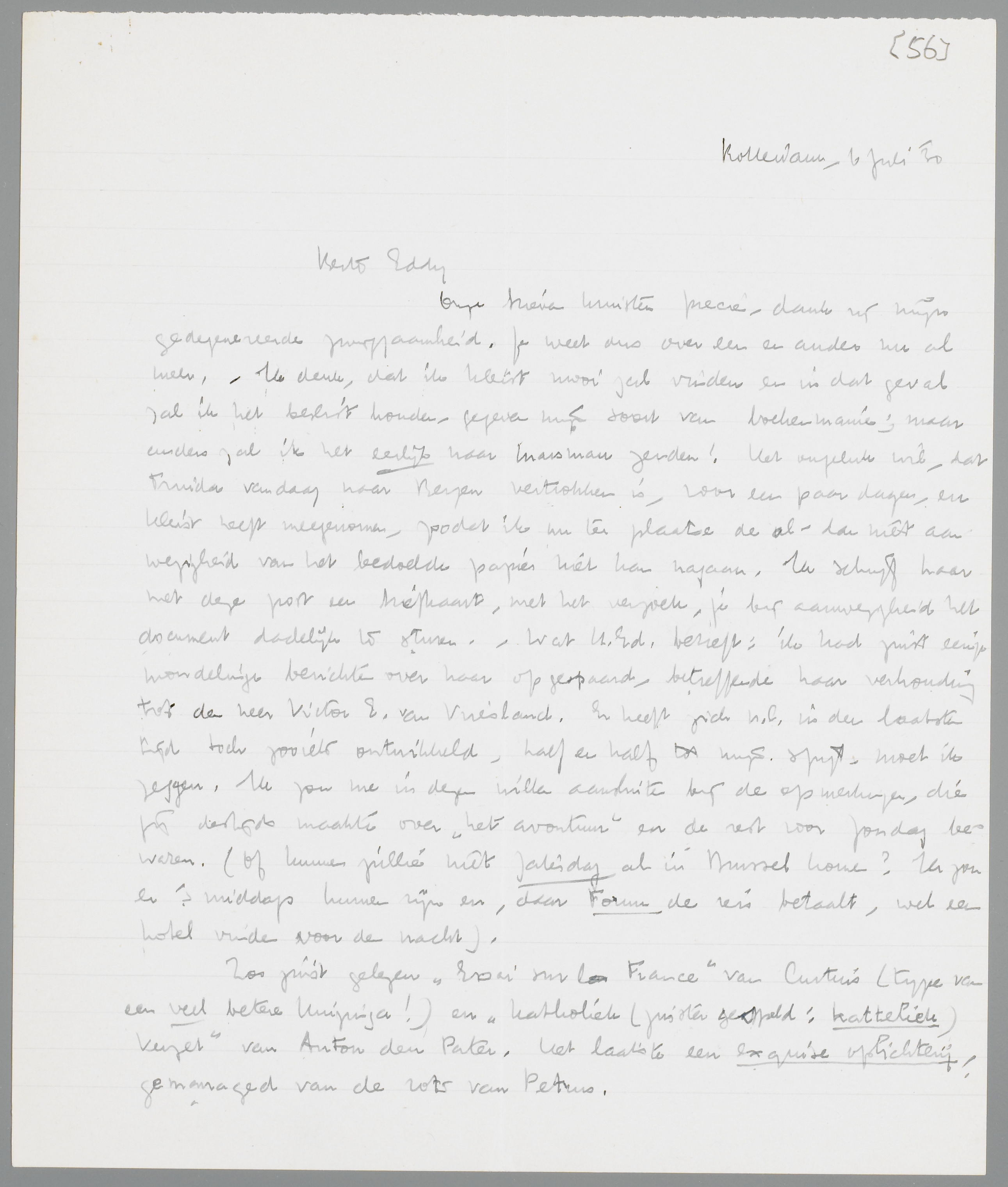 Onze brieven kruisten precies, dank zij mijn gedegenereerde zwijgzaamheid. Je weet dus over een en ander nu al meer. - Ik denk, dat ik Kleist mooi zal vinden en in dat geval zal ik het beslist houden, gegeven mijn soort van boekenmanie; maar anders zal ik het eerlijk naar Marsman zenden! Het ongeluk wil, dat Truida vandaag naar Bergen vertrokken is, voor een paar dagen, en Kleist heeft meegenomen, zoodat ik nu ter plaatse de al- dan niet aanwezigheid van het bedoelde papier niet kan nagaan. Ik schrijf haar met deze post een briefkaart, met het verzoek, je bij aanwezigheid het document dadelijk te sturen. – Wat U.Ed, betreft: ik had juist eenige mondelinge berichten over haar opgespaard, betreffende haar verhouding tot den heer Victor E. van Vriesland. Er heeft zich n.l. in den laatsten tijd toch zooiets ontwikkeld, half en half tot mijn spijt, moet ik zeggen. Ik zou me in dezen willen aansluiten bij de opmerkingen, die jij destijds maakte over ‘het avontuur’ en de rest voor Zondag bewaren. (Of kunnen jullie niet Zaterdag al in Brussel komen? Ik zou er ’s middags kunnen zijn en, daar Forum de reis betaalt, wel een hotel vinden voor de nacht ).