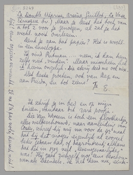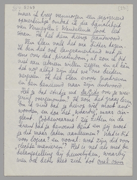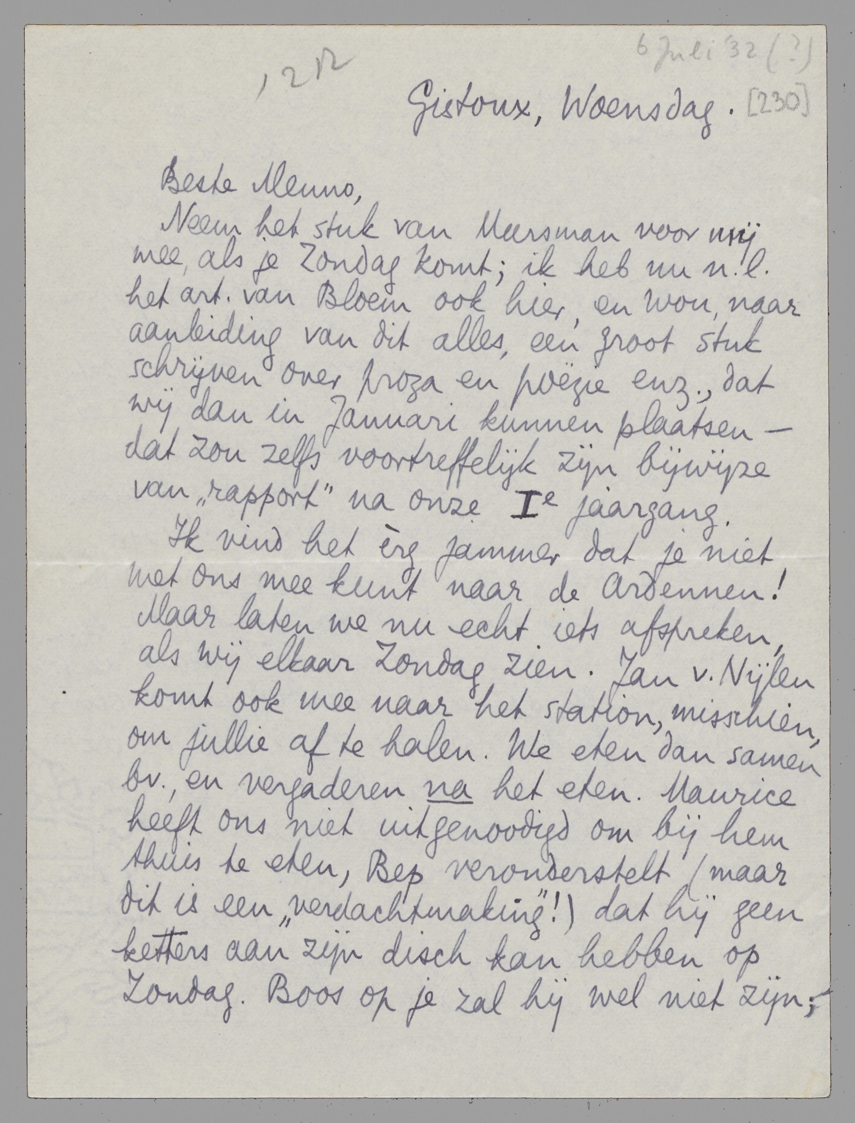 Ik vind het èrg jammer dat je niet met ons mee kunt naar de Ardennen! Maar laten we nu echt iets afspreken, als wij elkaar Zondag zien. Jan v. Nijlen komt ook mee naar het station, misschien, om jullie af te halen. We eten dan samen bv., en vergaderen na het eten. Maurice heeft ons niet uitgenoodigd om bij hem thuis te eten, Bep veronderstelt (maar dit is een ‘verdachtmaking’!) dat hij geen ketters aan zijn disch kan hebben op Zondag. Boos op je zal hij wel niet zijn; maar ik kreeg vanmorgen een gepiqueerd opmerkinkje omdat ik die banaliteit van Vermeylen's Wandelende Jood liet staan. Ik heb hem hierop geantwoord.