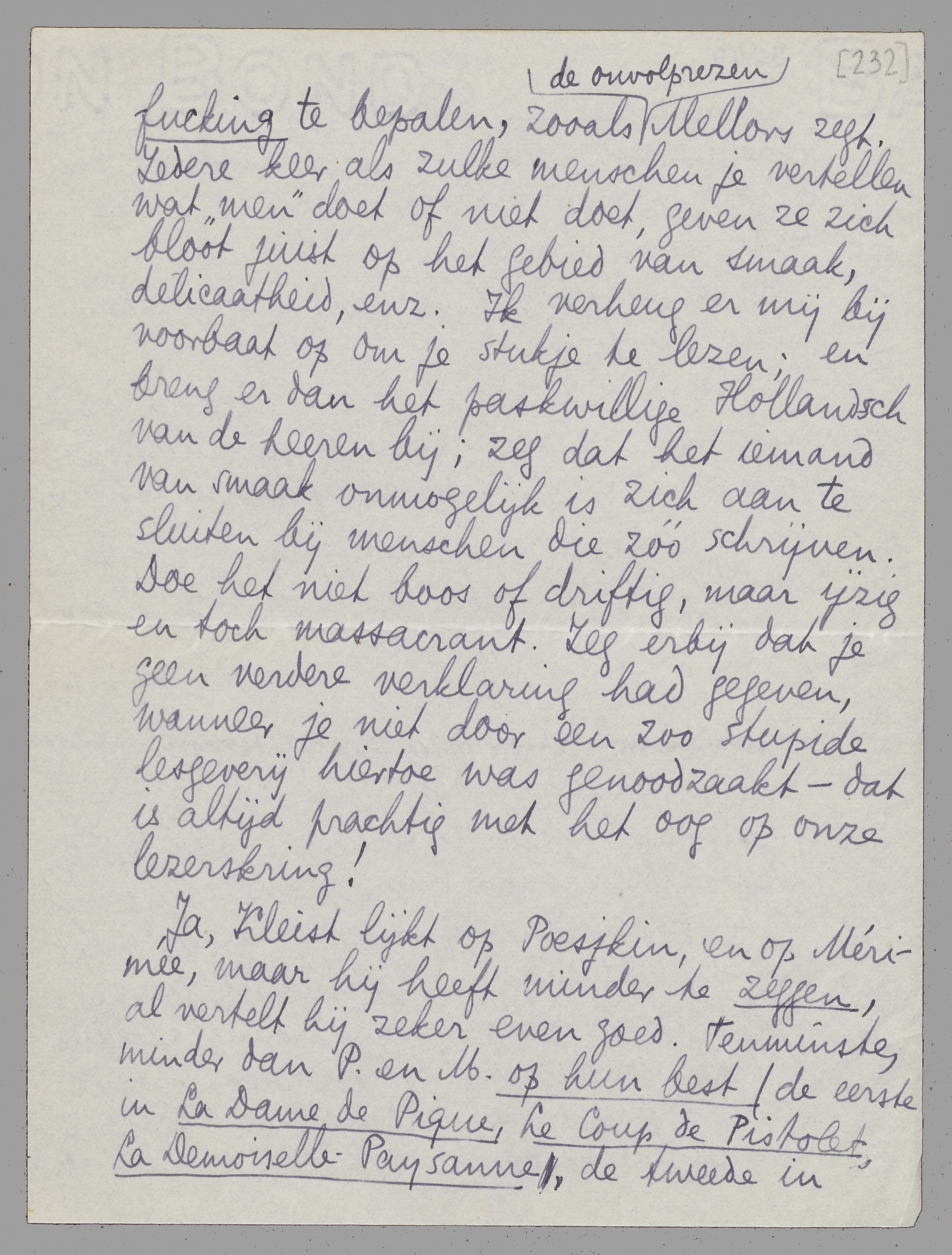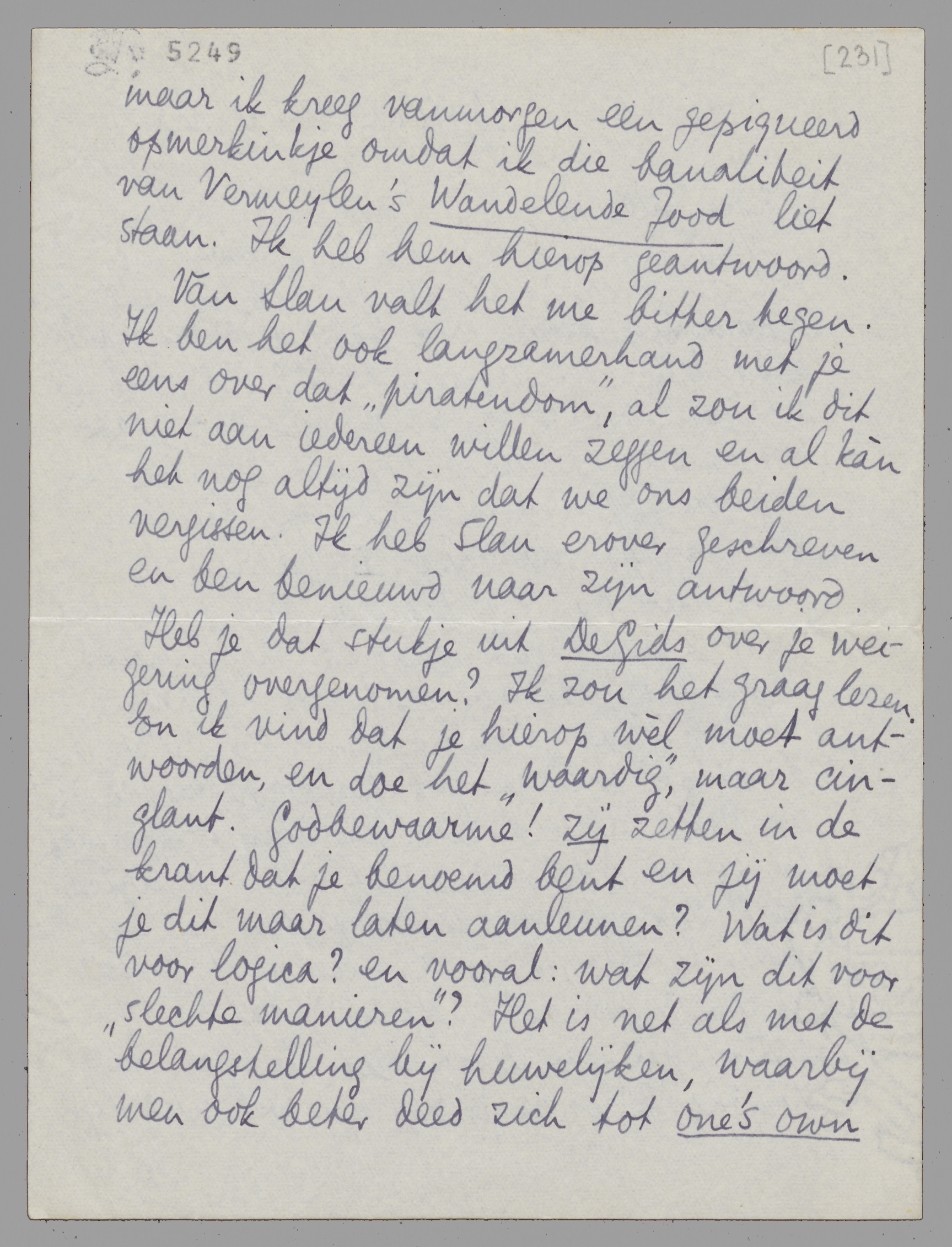 Heb je dat stukje uit De Gids over je weigering overgenomen? Ik zou het graag lezen. En ik vind dat je hierop wèl moet antwoorden, en doe het ‘waardig’, maar cinglant. Godbewaarme! zij zetten in de krant dat je benoemd bent en jij moet je dit maar laten aanleunen? Wat is dit voor logica? en vooral: wat zijn dit voor ‘slechte manieren’? Het is net als met de belangstelling bij huwelijken, waarbij men ook beter deed zich tot one's own fucking te bepalen, zooals de onvolprezen Mellors zegt. Iedere keer als zulke menschen je vertellen wat ‘men’ doet of niet doet, geven ze zich bloot juist op het gebied van smaak, delicaatheid, enz. Ik verheug er mij bij voorbaat op om je stukje te lezen; en breng er dan het paskwillige Hollandsch van de heeren bij; zeg dat het iemand van smaak onmogelijk is zich aan te sluiten bij menschen die zóó schrijven. Doe het niet boos of driftig, maar ijzig en toch massacrant. Zeg erbij dat je geen verdere verklaring had gegeven, wanneer je niet door een zoo stupide lesgeverij hiertoe was genoodzaakt - dat is altijd prachtig met het oog op onze lezerskring!