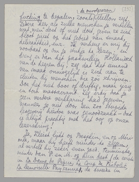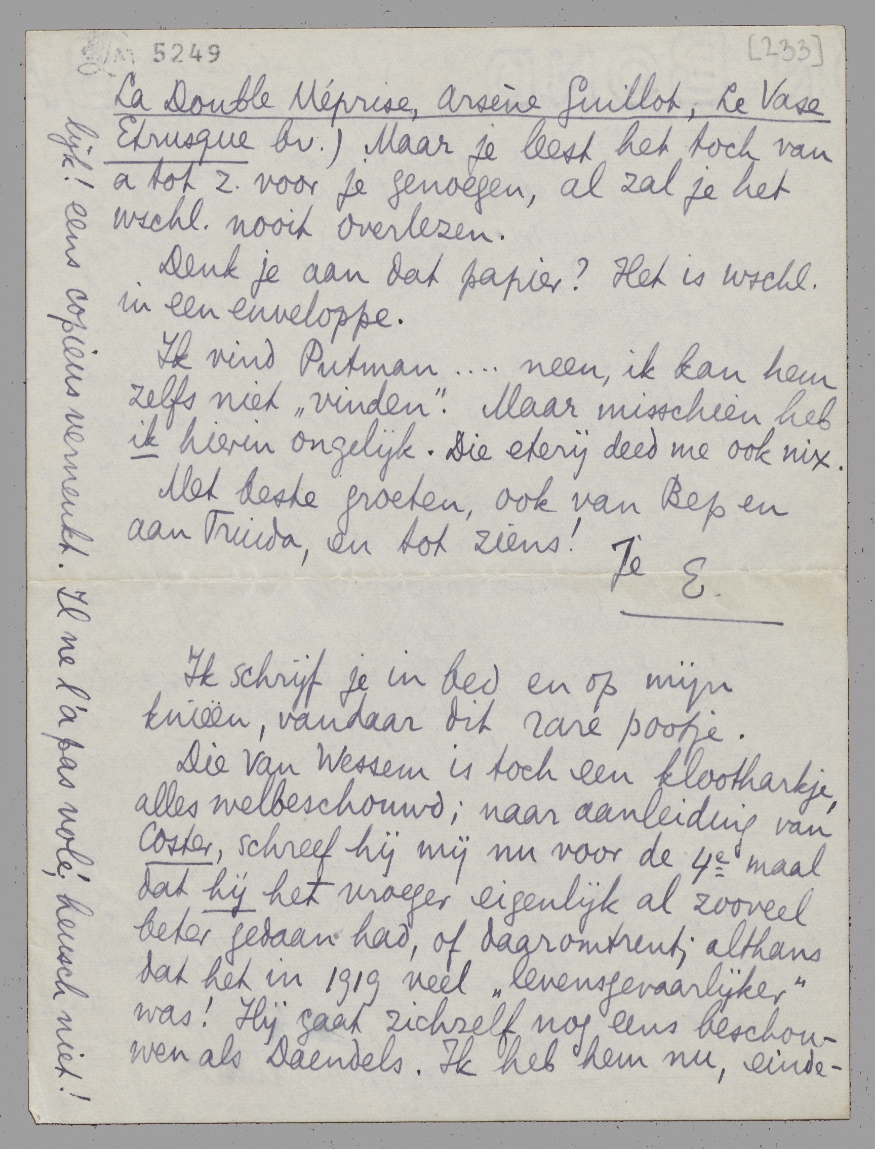 Die Van Wessem is toch een klootharkje, alles welbeschouwd; naar aanleiding van Coster, schreef hij mij nu voor de 4e maal dat hij het vroeger eigenlijk al zooveel beter gedaan had, of daaromtrent; althans dat het in 1919 veel ‘levensgevaarlijker’ was! Hij gaat zichzelf nog eens beschouwen als Daendels. Ik heb hem nu, eindelijk! eens copieus verneukt. Il ne l'a pas volé, heusch niet!