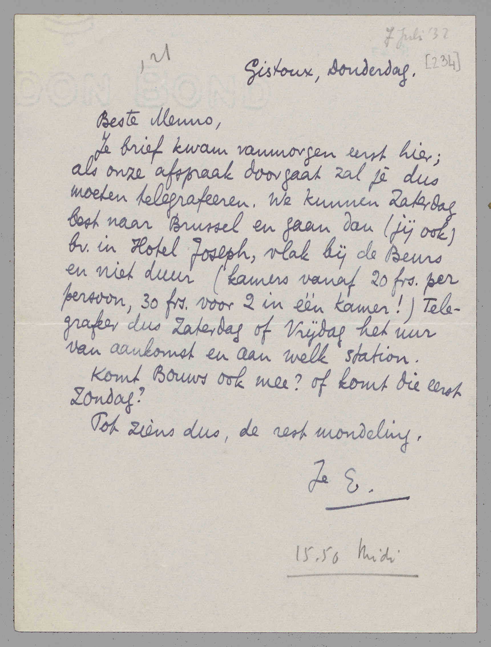 Je brief kwam vanmorgen eerst hier; als onze afspraak doorgaat zal je dus moeten telegrafeeren. We kunnen Zaterdag best naar Brussel en gaan dan (jij ook) bv. in Hotel Joseph, vlak bij de Beurs en niet duur (kamers vanaf 20 frs. per persoon, 30 frs, voor 2 in één kamer!) Telegrafeer dus Zaterdag of Vrijdag het uur van aankomst en aan welk station.