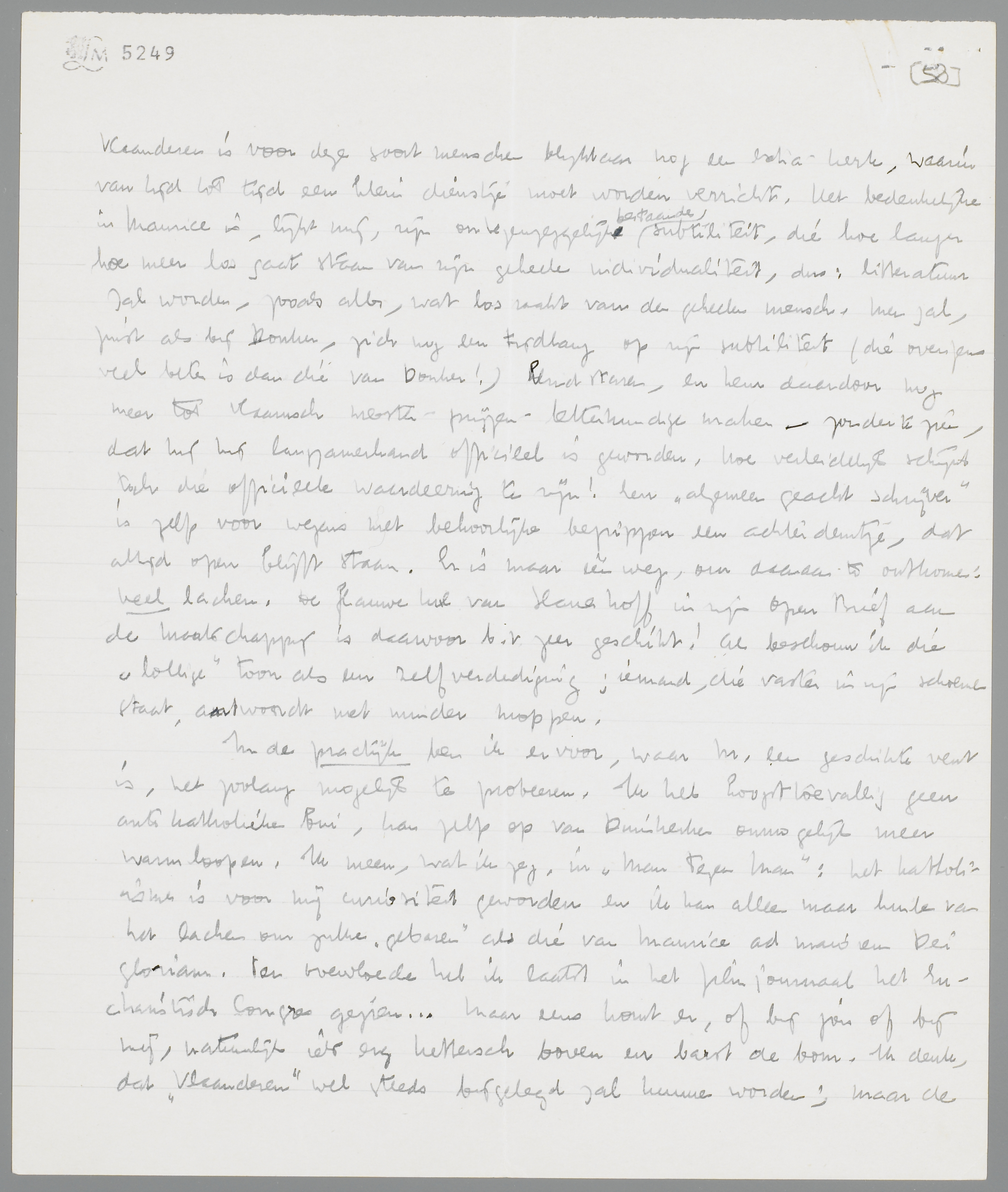 In de practijk ben ik er voor, waar M. een geschikte vent is, het zoolang mogelijk te probeeren. Ik heb hoogst toevallig geen anti katholieke bui, kan zelfs op van Duinkerken onmogelijk meer warm loopen. Ik meen, wat ik zeg, in Man tegen Man: het katholicisme is voor mij curiositeit geworden en ik kan alleen maar huilen van het lachen om zulke ‘gebaren’ als die van Maurice ad maiorem Dei gloriam. Ten overvloede heb ik laatst in het filmjournaal het Eucharistisch Congres gezien... Maar eens komt er, of bij jou of bij mij, natuurlijk iets erg kettersch boven en barst de bom. Ik denk, dat ‘Vlaanderen’ wel steeds bijgelegd zal kunnen worden; maar de rots van Petrus? Pasce oves meas, weid mijne schapen, sprak de Heer tot Maurice; etiam in Foro paganorum! - Toch heb ik geen onprettige nasmaak van de vergadering, omdat wij tenslotte van ons hart geen moordkuil hebben gemaakt en Maurice nog niet ‘bitter’ wordt, als er een hard woord over den paus valt. Quo usque tandem? Zal hij eindigen als van Eeden, opgestopt met crucifixen?