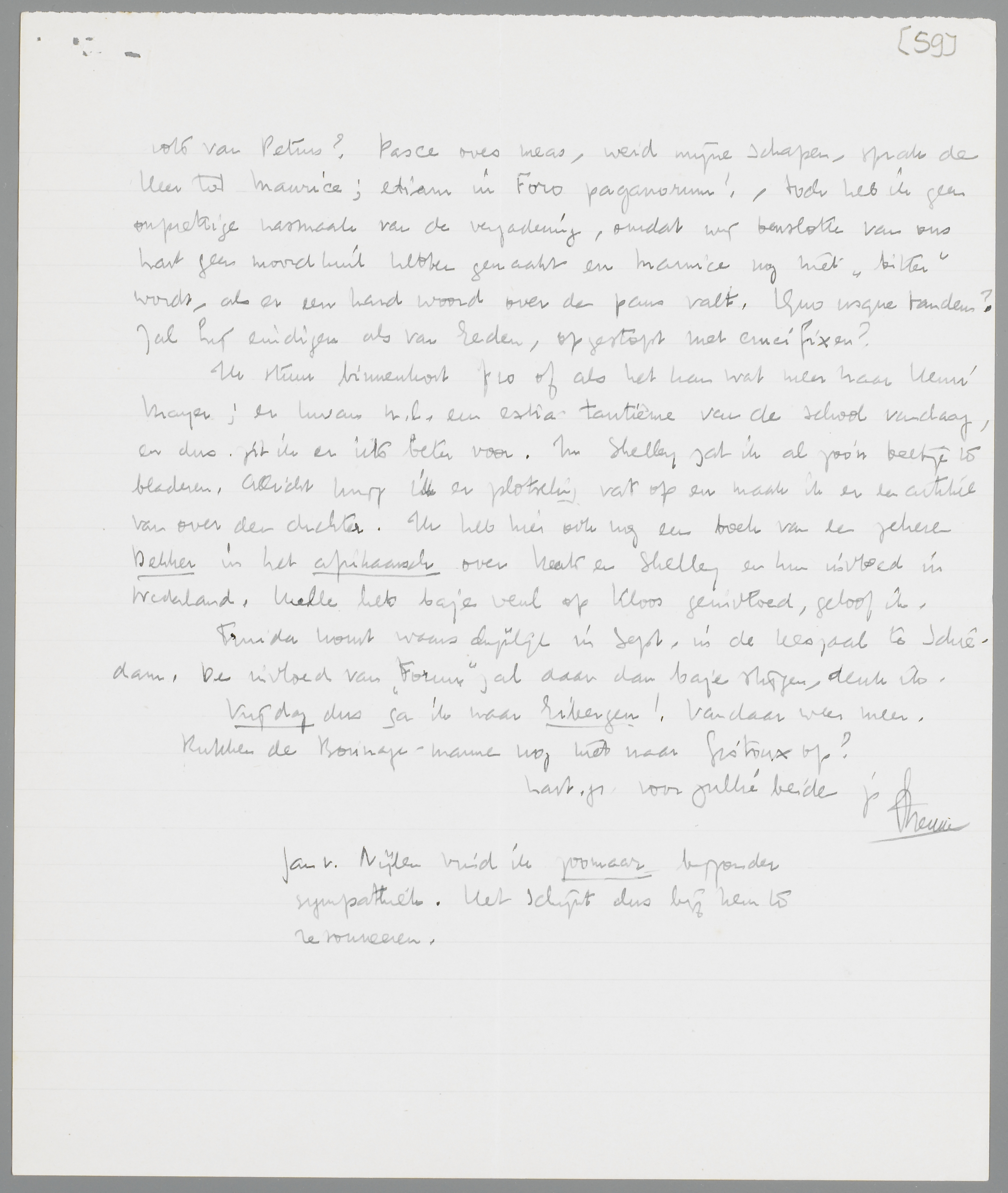 Ik stuur binnenkort f 10 of als het kan wat meer naar Henri Mayer; er kwam n.l. een extra-tantième van de school vandaag, en dus zit ik er iets beter voor. In Shelley zat ik al zoo'n beetje te bladeren. Allicht krijg ik er plotseling vat op en maak ik er een artikel van over den dichter. Ik heb hier ook nog een boek van een zekeren Dekker in het afrikaansch over Keats en Shelley en hun invloed in Nederland. Hulle heb baje veul op Kloos geinvloed, geloof ik.