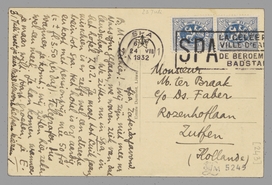 Ziehier! - Wij zijn niet meer nr Nassogne gegaan, we waren ziek van dat landschap. We zitten nu in Spa, in het hotel Z.O.Z. Je moet tot Luik gaan, misschien is er zelfs wel een directe trein tot Spa. Het hotel is erg aardig, en kost met pensionprijs mee 50 frs (= ± fl. 3.50 per dag). Telegrafeer dus wanneer je komt; wij zitten hier zeker wel een week. Je kan komen wanneer je maar wilt. Hart. groeten, je