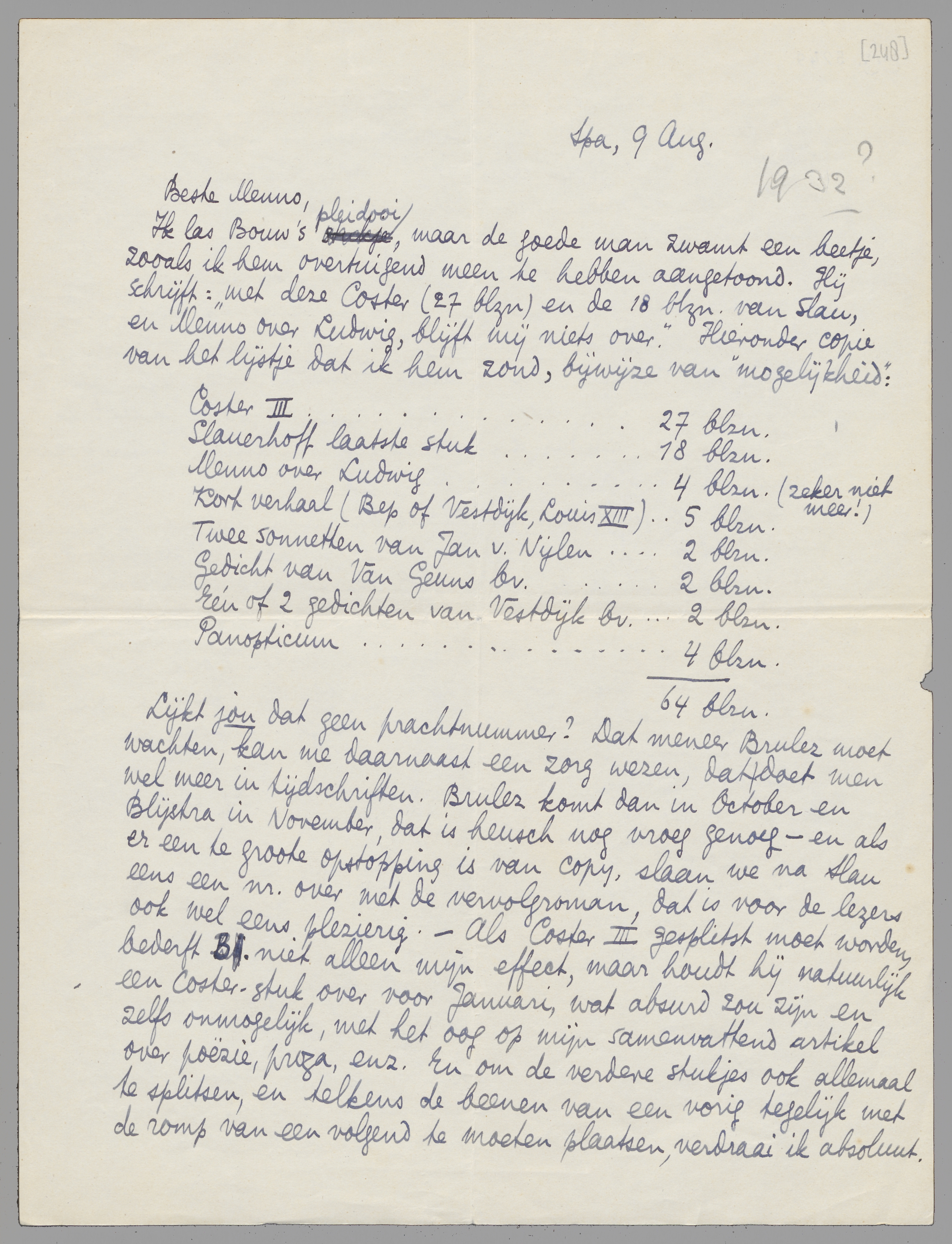 Lijkt jou dat geen prachtnummer? Dat meneer Brulez moet wachten, kan me daarnaast een zorg wezen, dat doet men wel meer in tijdschriften. Brulez komt dan in October en Blijstra in November, dat is heusch nog vroeg genoeg - en als er een te groote opstopping is van copy, slaan we na Slau eens een nr. over met de vervolgroman, dat is voor de lezers ook wel eens plezierig. - Als Coster III gesplitst moet worden, bederft B. niet alleen mijn effect, maar houdt hij natuurlijk een Coster-stuk over voor Januari, wat absurd zou zijn en zelfs onmogelijk, met het oog op mijn samenvattend artikel over poëzie, proza, enz. En om de verdere stukjes ook allemaal te splitsen, en telkens de beenen van een vorig tegelijk met de romp van een volgend te moeten plaatsen, verdraai ik absoluut.