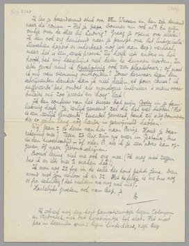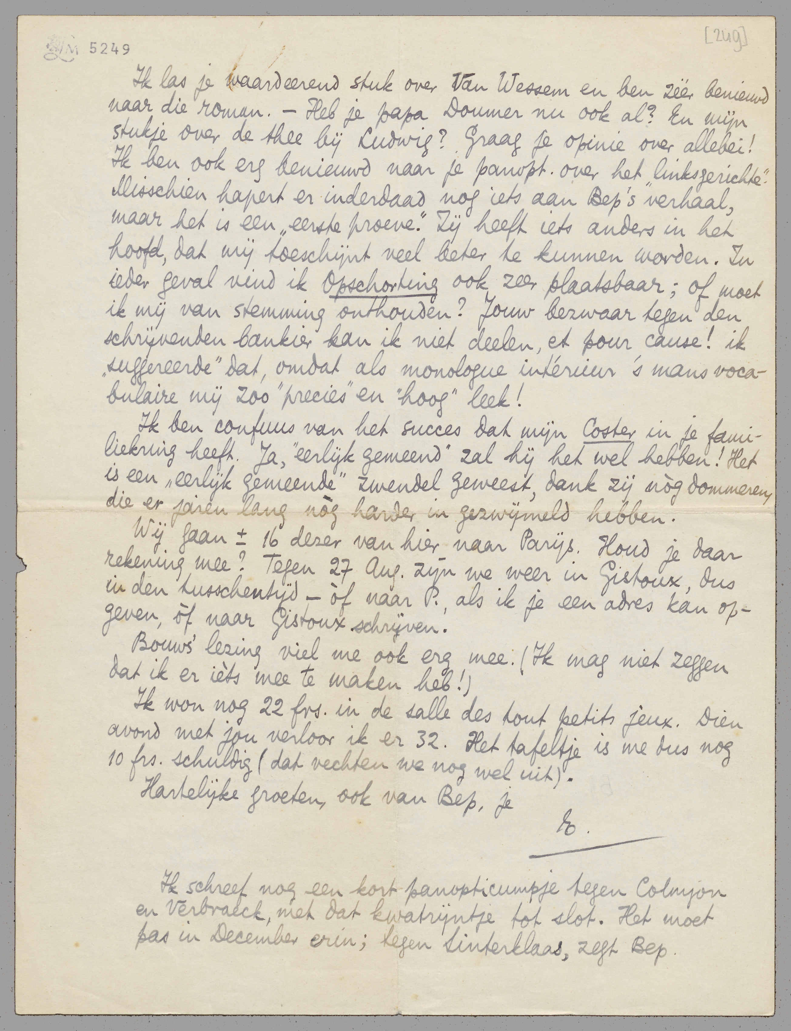 Wij gaan ± 16 dezer van hier naar Parijs. Houd je daar rekening mee? Tegen 27 Aug. zijn we weer in Gistoux, dus in den tusschentijd - òf naar P., als ik je een adres kan opgeven, òf naar Gistoux schrijven.