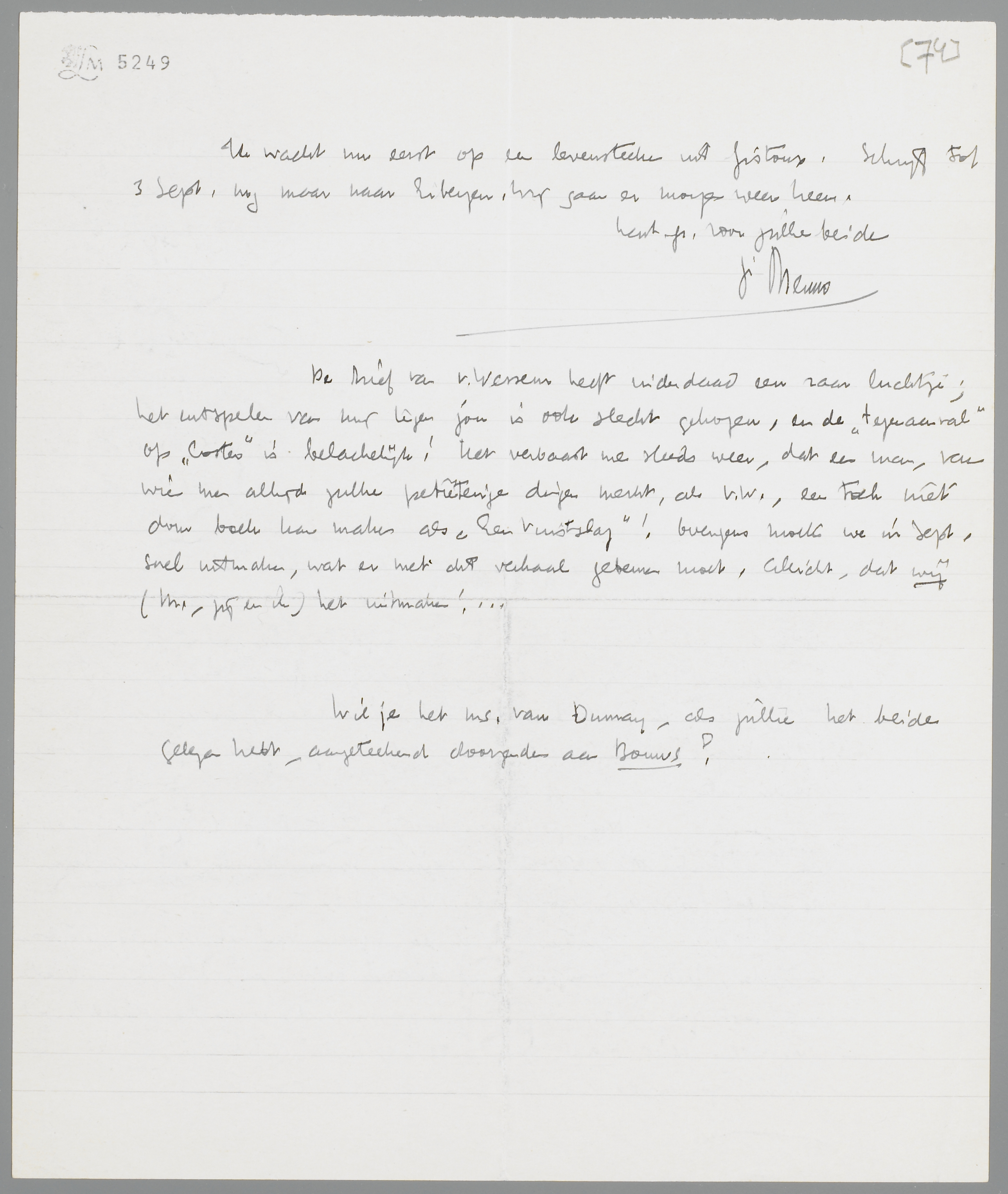 Inmiddels maakte ik Dumay af en gisteren zond ik het manuscript aangeteekend naar Gistoux. Het zijn 253 pag. geworden; het laatste hoofdstuk vloog eruit en komt mezelf voor, het beste te zijn. Overigens heb ik nog geen afstand kunnen krijgen. Volgens Ant is het veel beter dan Hampton Court; ik zelf kan wel zien, dat het minder ‘kaal’ is, maar voor de rest wacht ik eerst af, tot er tijd tusschen schrijven en overlezen is gekomen. Jullie zult wel zoo spoedig mogelijk over je indrukken berichten, denk ik? Ik ben er erg benieuwd naar; als ik weet, wat Ant, jij, Bep en Wim ervan zeggen, heb ik zoo voor mijn eigen gevoel wel in de gaten, wat het ding ‘is’.