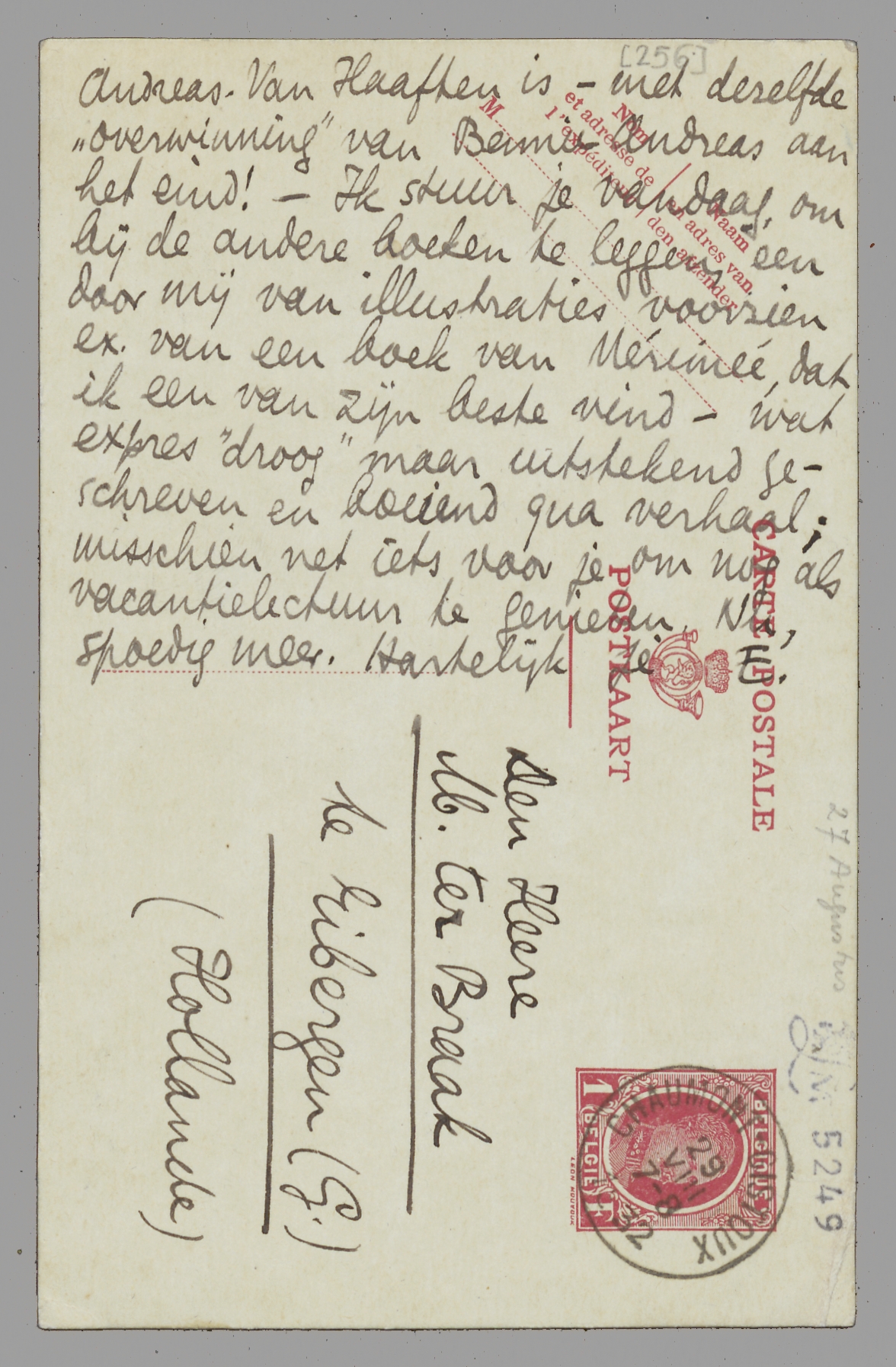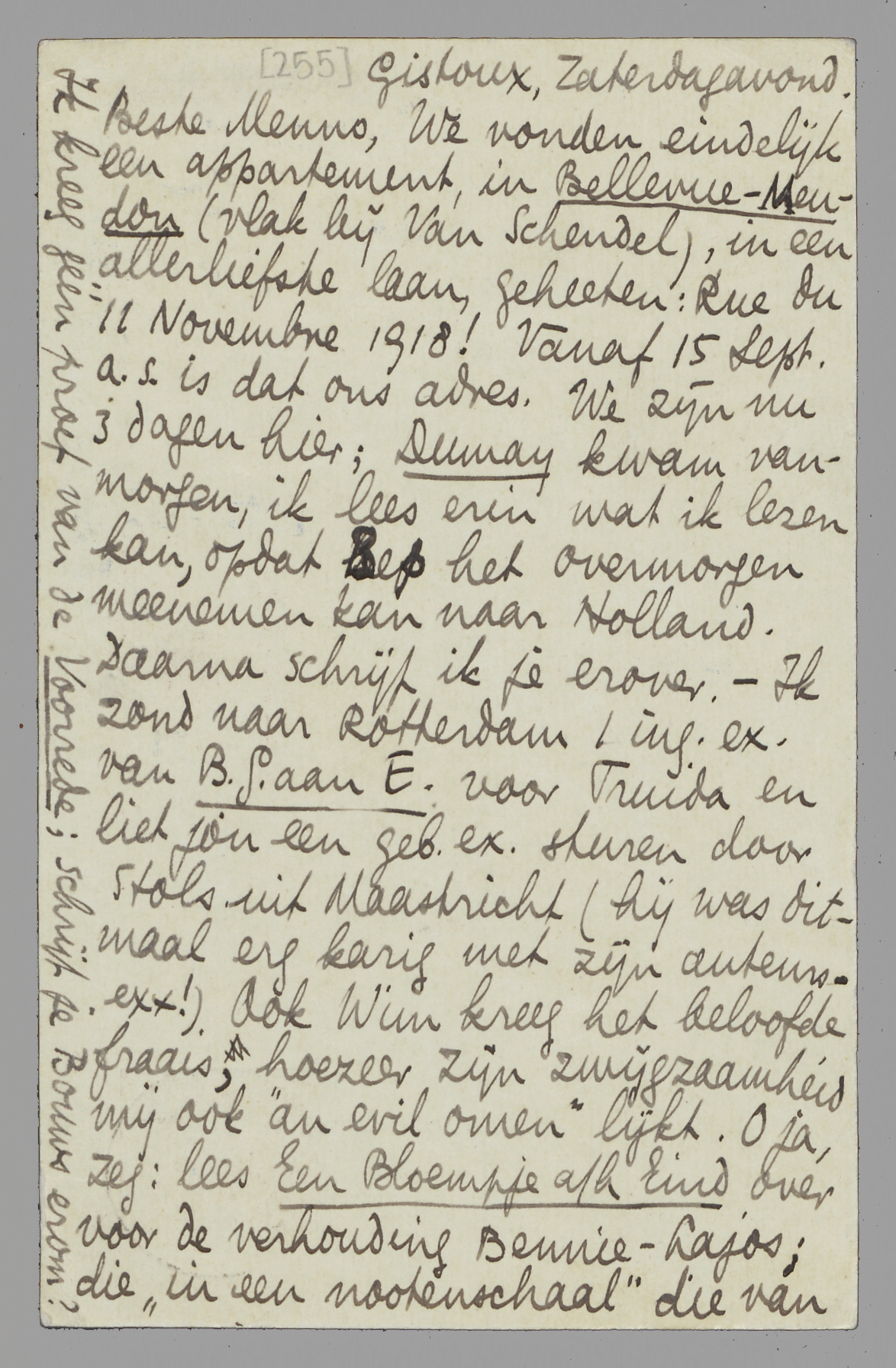 We vonden eindelijk een appartement, in Bellevue-Meudon (vlak bij Van Schendel), in een allerliefste laan, geheeten: Rue du 11 Novembre 1918! Vanaf 15 Sept. a.s. is dat ons adres. We zijn nu 3 dagen hier; Dumay kwam vanmorgen, ik lees erin wat ik lezen kan, opdat Bep het overmorgen meenemen kan naar Holland. Daarna schrijf ik je erover. - Ik zond naar Rotterdam 1 ing. ex. van B.G. aan E. voor Truida en liet jou een geb. ex. sturen door Stols uit Maastricht (hij was ditmaal erg karig met zijn auteursexx!) Ook Wim kreeg het beloofde fraais, hoezeer zijn zwijgzaamheid mij ook ‘an evil omen’ lijkt. O ja, zeg: lees Een Bloempje a/h Eind over voor de verhouding Bennie - Lajos; die ‘in een nootenschaal’ die van Andreas - Van Haaften is - met dezelfde ‘overwinning’ van Bennie Andreas aan het eind! - Ik stuur je vandaag, om bij de andere boeken te leggen, een door mij van illustraties voorzien ex. van een boek van Mérimeé, dat ik een van zijn beste vind - wat expres ‘droog’ maar uitstekend geschreven en boeiend qua verhaal; misschien net iets voor je om nog als vacantielectuur te genieten. Nu, spoedig meer. Hartelijk je