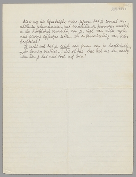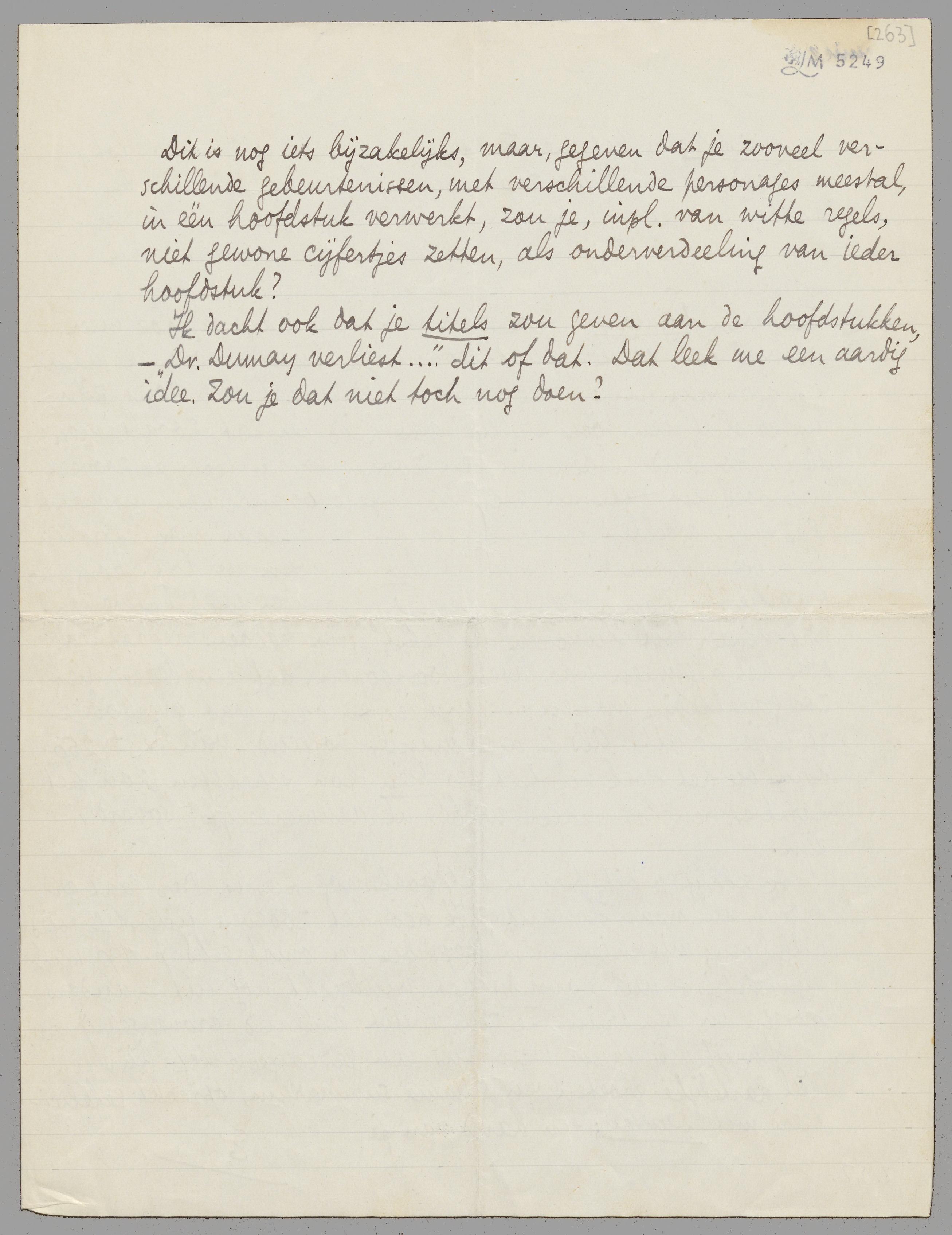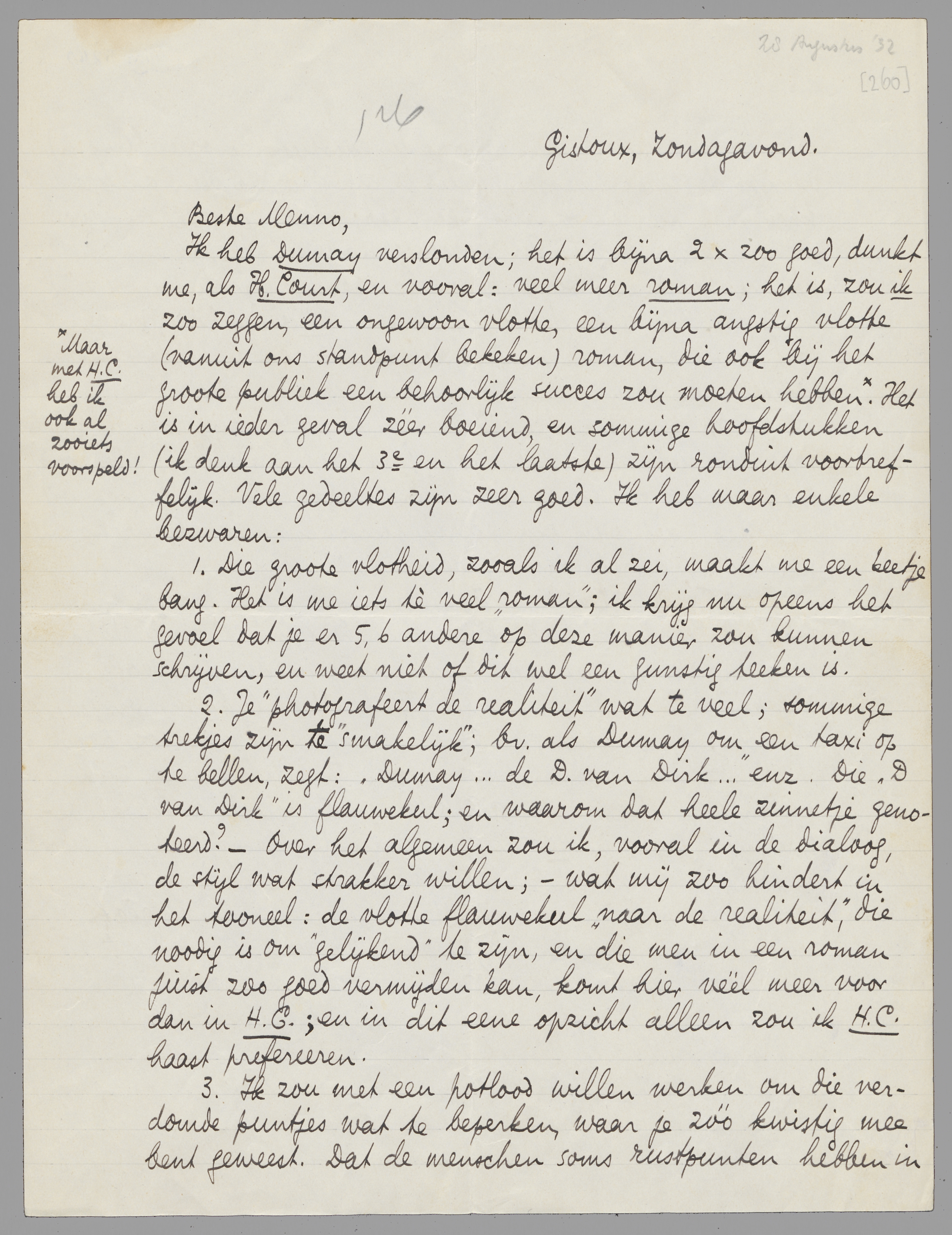 Meer zou ik vooreerst niet weten te vinden; eig. zijn hierin ook alleen 1-3 van belang. De rest is al detailbespreking. (O ja, ‘in de gang’, en ‘aan den gang’, zegt het woordenboek; jij maakt telkens de vrouwelijke gang mannelijk). - Nog iets. De scène waarin Marie George een klap geeft, vind ik zwak, maakt hier de indruk van onnoodig te zijn; de andere gesprekken daarentegen met George vind ik alleraardigst. Ik zou met je over het heele boek willen spreken, stuk voor stuk zeggen wat ik erg goed vind, wat minder, wat bijna niet. Maar over het geheel is het een knap stuk werk, dat ook psychologisch veel subtieler en belangrijker is dan H. Court, dat lijdt niet den minsten twijfel. Met Een Vuistslag is het niet te vergelijken: het is 2 × zoo vlot en ‘goedgeschreven’, 3 × zoo belangrijk en intelligent. Ik voel er op het oogenblik voor om heusch, alleen maar enkele fragmenten van Van Wessem op te nemen (de John-Jacques-historie) - hoogstens 3 nummers! en dan alles van Dumay. Hoe meer ik erover nadenk, hoe meer ik voel dat, buiten puur-technische kwesties om, ik maar één bezwaar heb: het boek zou heelemaal van ‘ons’ zijn, als er niet die tòch ‘gezellige’ vlotheid in zat, zooals ‘men’ die in Holland hebben wil, en zooals er nu toch al zóóveel in je boek zit, dat men zich op enkele oogenblikken afvraagt (Bep en ik voelden hetzelfde zonder er elkaar over gesproken te hebben): ‘waarin verschilt dit nu van de Holl. romantraditie?’ Kan je dat bij herlezing er niet wat uitwerken? Wat minder wit tusschen de ‘tekst’; ik bedoel: de alinea's over het algemeen wat laten doorloopen, het den lezer niet zóó gemakkelijk maken...; en hier en daar wat overbodige zinnetjes er uit. Als je, deze manier volgend, van de ± 250 blzn. die het boek nu telt, er tien kon schrappen, zou het karakter van het geheel wschl. al aanmerkelijk ‘soberder’ zijn.