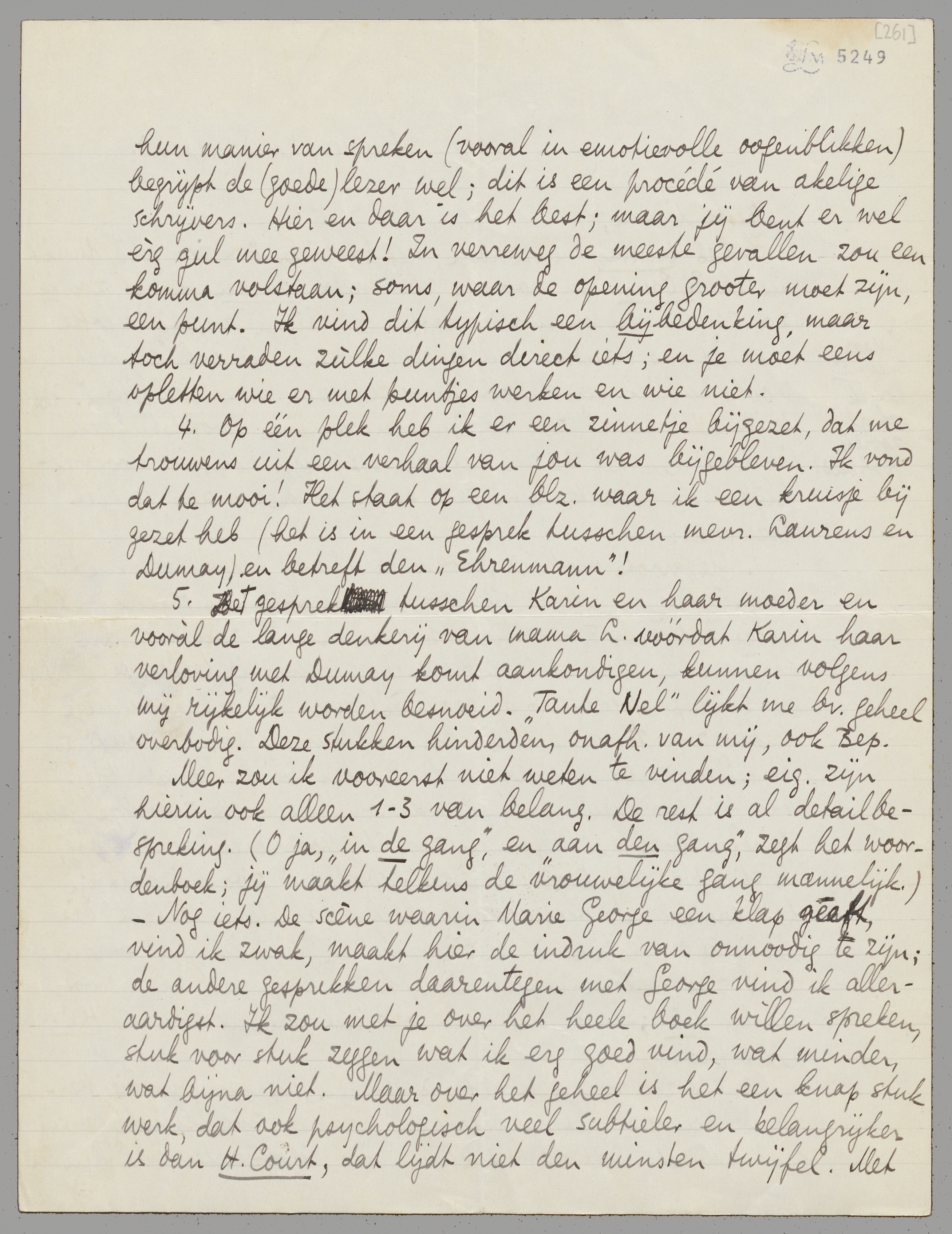 5. Het gesprek tusschen Karin en haar moeder en vooràl de lange denkerij van mama L. vóórdat Karin haar verloving met Dumay komt aankondigen, kunnen volgens mij rijkelijk worden besnoeid. ‘Tante Nel’ lijkt me bv. geheel overbodig. Deze stukken hinderden, onafh. van mij. ook Bep.