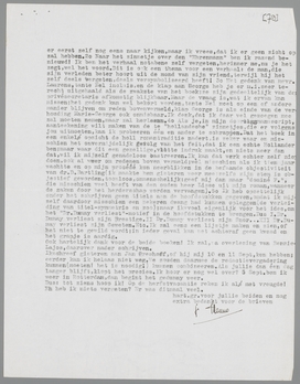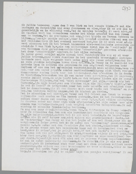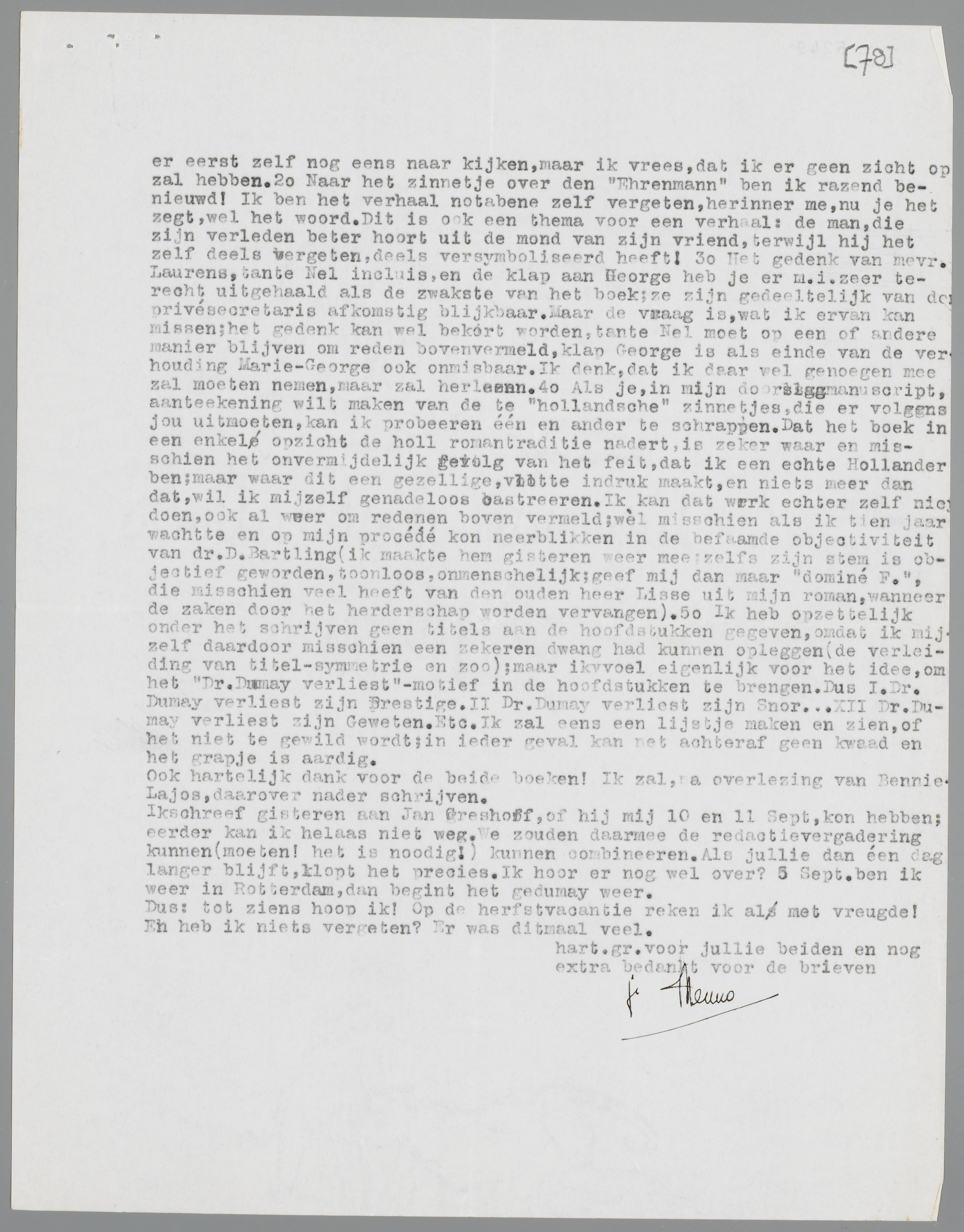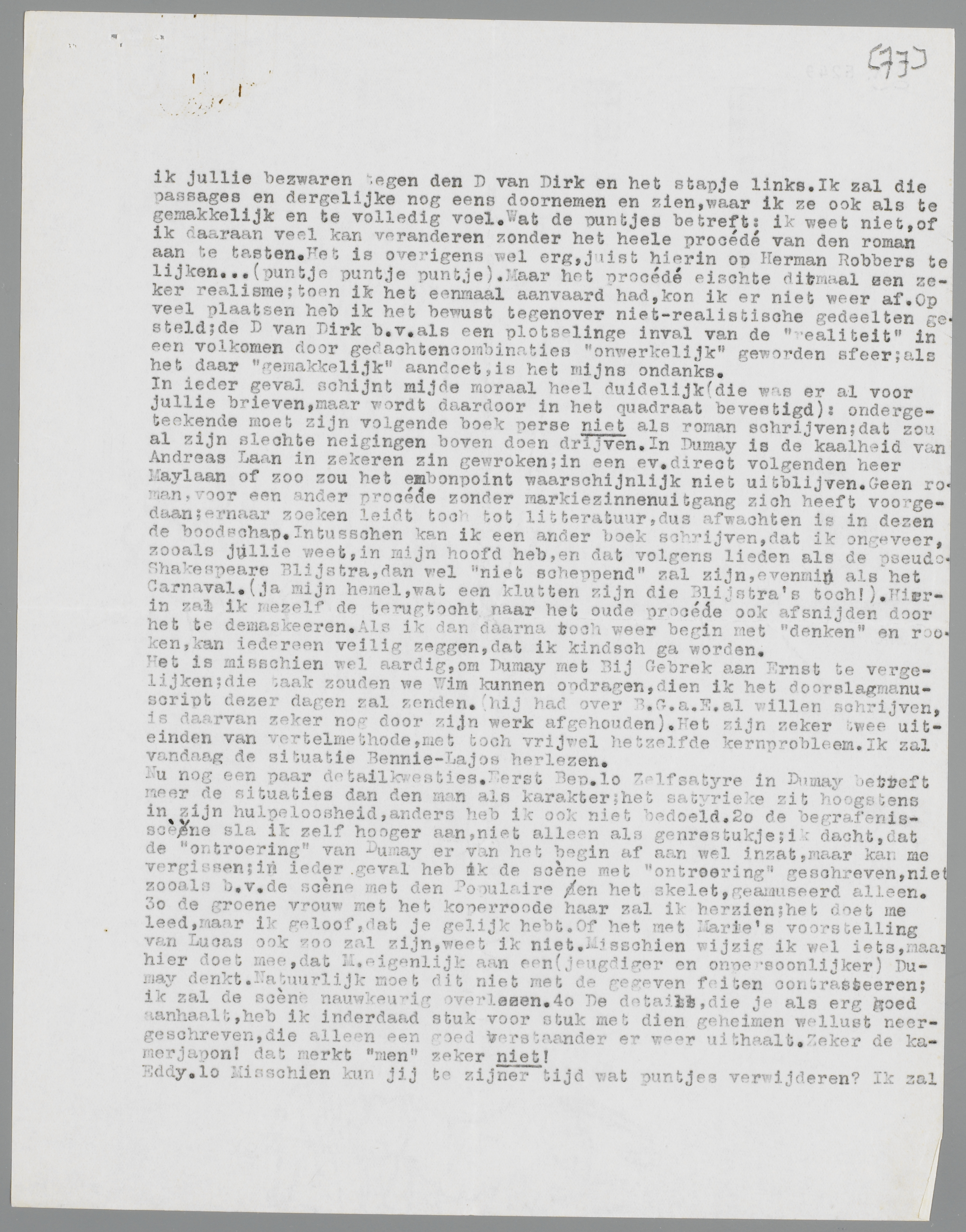 Eddy. 1o Misschien kun jij te zijner tijd wat puntjes verwijderen? Ik zal er eerst zelf nog eens naar kijken, maar ik vrees, dat ik er geen zicht op zal hebben. 2o Naar het zinnetje over den ‘Ehrenmann’ ben ik razend benieuwd! Ik ben het verhaal notabene zelf vergeten, herinner me, nu je het zegt, wel het woord. Dit is ook een thema voor een verhaal: de man, die zijn verleden beter hoort uit de mond van zijn vriend, terwijl hij het zelf deels vergeten, deels versymboliseerd heeft! 3o Het gedenk van mevr. Laurens, tante Nel incluis, en de klap aan George heb je er m.i. zeer terecht uitgehaald als de zwakste van het boek; ze zijn gedeeltelijk van den privésecretaris afkomstig blijkbaar. Maar de vraag is, wat ik ervan kan missen; het gedenk kan wel bekort worden, tante Nel moet op een of andere manier blijven om reden bovenvermeld, klap George is als einde van de verhouding Marie-George ook onmisbaar. Ik denk, dat ik daar wel genoegen mee zal moeten nemen, maar zal herlezen. 4o Als je, in mijn doorslagmanuscript, aanteekening wilt maken van de te ‘hollandsche’ zinnetjes, die er volgens jou uitmoeten, kan ik probeeren één en ander te schrappen. Dat het boek in een enkel opzicht de holl. romantraditie nadert, is zeker waar en misschien het onvermijdelijk gevolg van het feit, dat ik een echte Hollander ben; maar waar dit een gezellige, vlotte indruk maakt, en niets meer dan dat, wil ik mijzelf genadeloos castreeren. Ik kan dat werk echter zelf niet doen, ook al weer om redenen boven vermeld; wèl misschien als ik tien jaar wachtte en op mijn procédé kon neerblikken in de befaamde objectiviteit van dr. D. Bartling. (ik maakte hem gisteren weer mee; zelfs zijn stem is objectief geworden, toonloos, onmenschelijk; geef mij dan maar ‘dominé F.’, die misschien veel heeft van den ouden heer Lisse uit mijn roman, wanneer de zaken door het herderschap worden vervangen). 5o Ik heb opzettelijk onder het schrijven geen titels aan de hoofdstukken gegeven, omdat ik mijzelf daardoor misschien een zekeren dwang had kunnen opleggen (de verleiding van titel-symmetrie en zoo); maar ik voel eigenlijk voor het idee, om het ‘Dr. Dumay verliest’-motief in de hoofdstukken te brengen. Dus I. Dr. Dumay verliest zijn prestige. II. Dr. Dumay verliest zijn Snor... XII. Dr. Dumay verliest zijn Geweten. Etc. Ik zal eens een lijstje maken en zien, of het niet te gewild wordt; in ieder geval kan het achteraf geen kwaad en het grapje is aardig.