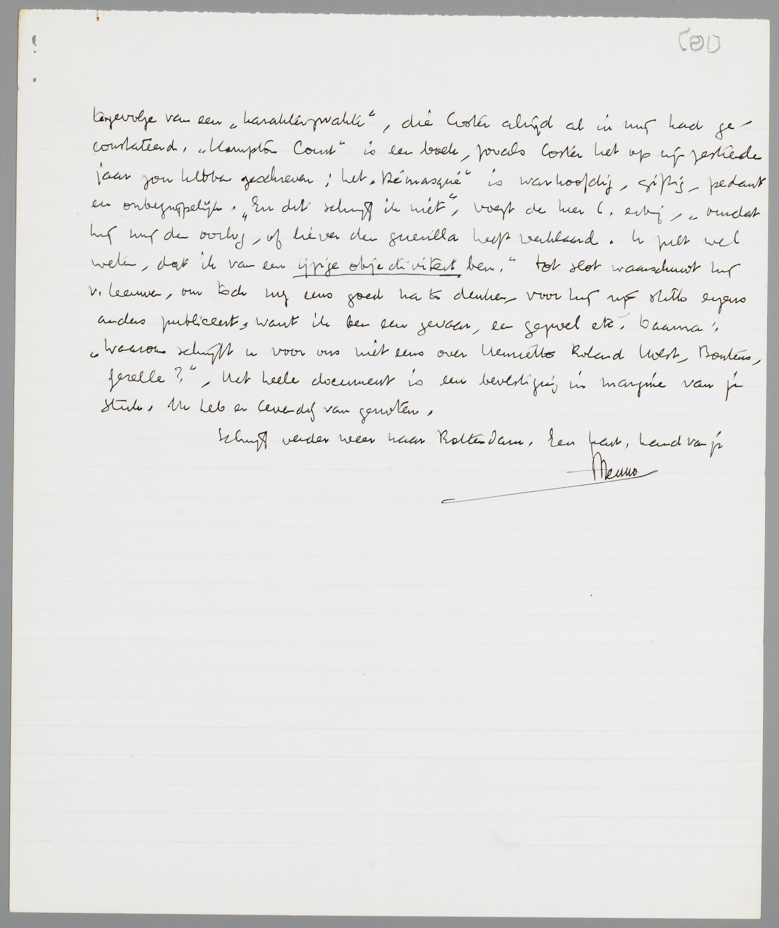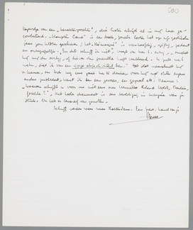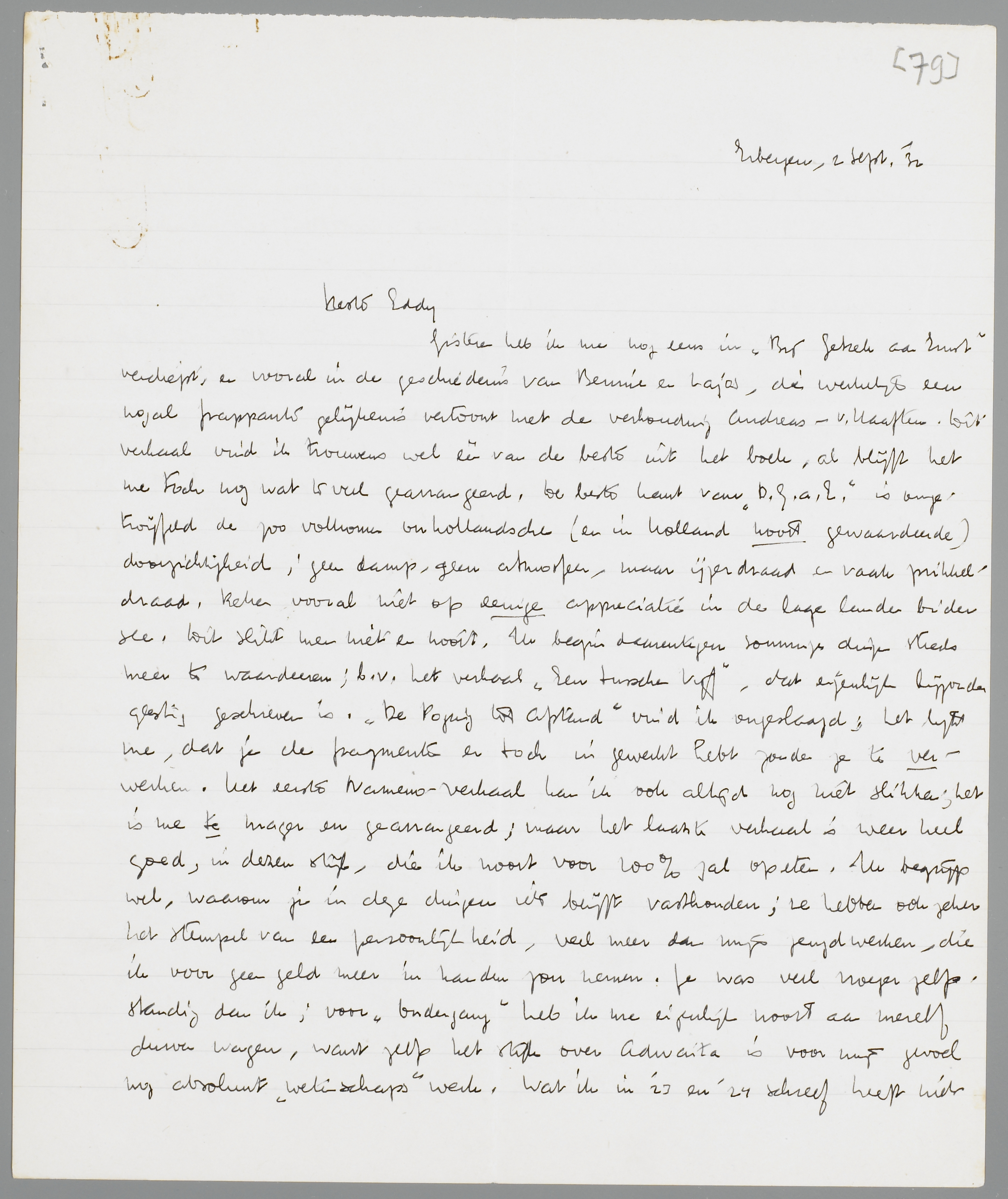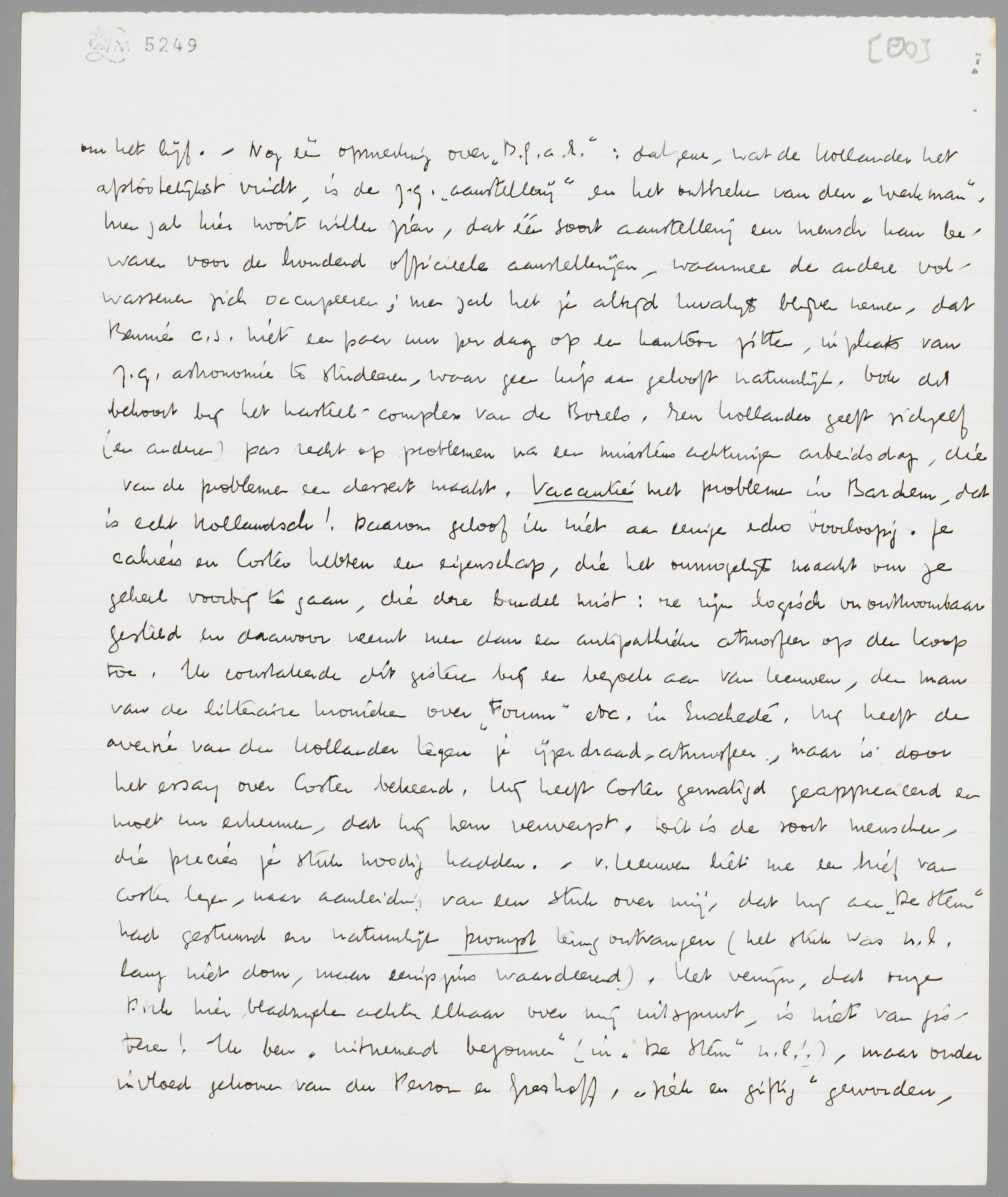 Gisteren heb ik me nog eens in Bij Gebrek aan Ernst verdiept, en vooral in de geschiedenis van Bennie en Lajos, die werkelijk een nogal frappante gelijkenis vertoont met de verhouding Andreas-v. Haaften. Dit verhaal vind ik trouwens wel één van de beste uit het boek, al blijft het me toch nog wat te veel gearrangeerd. De beste kant van B.G.a.E. is ongetwijfeld de zoo volkomen onhollandsche (en in Holland nooit gewaardeerde) doorzichtigheid; geen damp, geen atmosfeer, maar ijzerdraad en vaak prikkeldraad. Reken vooral niet op eenige appreciatie in de lage landen bi der see. Dit slikt men niet en nooit. Ik begin daarentegen sommige dingen steeds meer te waardeeren; b.v. het verhaal Een tusschen Vijf, dat eigenlijk bijzonder geestig geschreven is. De Poging tot Afstand vind ik ongeslaagd; het lijkt me, dat je de fragmenten er toch in gewerkt hebt zonder ze te verwerken. Het eerste Nameno-verhaal kan ik ook altijd nog niet slikken; het is me te mager en gearrangeerd; maar het laatste verhaal is weer heel goed, in dezen stijl, die ik nooit voor 100% zal opeten. Ik begrijp wel, waarom je in deze dingen iets blijft vasthouden; ze hebben ook zeker het stempel van een persoonlijkheid, veel meer dan mijn jeugdwerken, die ik voor geen geld meer in handen zou nemen. Je was veel vroeger zelfstandig dan ik; voor Ondergang heb ik me eigenlijk nooit aan mezelf durven wagen, want zelfs het stuk over Adwaita is voor mijn gevoel nog absoluut ‘wetenschaps’werk. Wat ik in '23 en '24 schreef heeft niets om het lijf. - Nog één opmerking over B.G.a.E.: datgene, wat de Hollander het afstootelijkst vindt, is de z.g. ‘aanstellerij’ en het ontbreken van den ‘werkman’. Men zal hier nooit willen zien, dat één soort aanstellerij een mensch kan bewaren voor de honderd officieele aanstellerijen, waarmee de andere volwassenen zich occupeeren; men zal het je altijd kwalijk blijven nemen, dat Bennie c.s. niet een paar uur per dag op een kantoor zitten, in plaats van z.g. astronomie te studeeren, waar geen kip aan gelooft natuurlijk. Ook dit behoort bij het kasteel-complex van de Borels. Een hollander geeft zichzelf (en anderen) pas recht op problemen na een minstens achturigen arbeidsdag, die van de problemen een dessert maakt. Vacantie met problemen in Barchem, dat is echt Hollandsch! Daarom geloof ik niet aan eenige echo voorloopig. Je cahiers en Coster hebben een eigenschap, die het onmogelijk maakt om ze geheel voorbij te gaan, die deze bundel mist: ze zijn logisch onontkoombaar gesteld en daarvoor neemt men dan een antipathieke atmosfeer op den koop toe. Ik constateerde dit gisteren bij een bezoek aan van Leeuwen, den man van de litteraire kronieken over Forum etc. in Enschedé. Hij heeft de aversie van den Hollander tegen je ijzerdraad-atmosfeer, maar is door het essay over Coster bekeerd. Hij heeft Coster gematigd geapprecieerd en moet nu erkennen, dat hij hem verwerpt. Dit is de soort menschen, die precies je stuk noodig hadden. - v. Leeuwen liet me een brief van Coster lezen, naar aanleiding van een stuk over mij, dat hij aan De Stem had gestuurd en natuurlijk prompt terug ontvangen (het stuk was n.l. lang niet dom, maar eenigszins waardeerend). Het venijn, dat onze Dirk hier bladzijden achter elkaar over mij uitspuwt, is niet van gisteren! Ik ben ‘uitnemend begonnen’ (in De Stem n.l.!), maar onder invloed gekomen van du Perron en Greshoff, ‘ziek en giftig’ geworden, tengevolge van een ‘karakterzwakte’, die Coster altijd al in mij had geconstateerd. Hampton Court is een boek, zooals Coster het op zijn zestiende jaar zou hebben geschreven; het Démasqué is warhoofdig, giftig, pedant en onbegrijpelijk. ‘En dit schrijf ik niet’, voegt de heer C. erbij, ‘omdat hij mij den oorlog, of liever den guerilla heeft verklaard. U zult wel weten, dat ik van een ijzige objectiviteit ben.’ Tot slot waarschuwt hij v. Leeuwen, om toch nog eens goed na te denken, voor hij zijn stuk ergens anders publiceert, want ik ben een gevaar, een gezwel etc. Daarna: Waarom schrijft U voor ons niet eens over Henriette Roland Holst, Boutens, Gezelle? - Het heele document is een bevestiging in margine van je stuk. Ik heb er levendig van genoten.