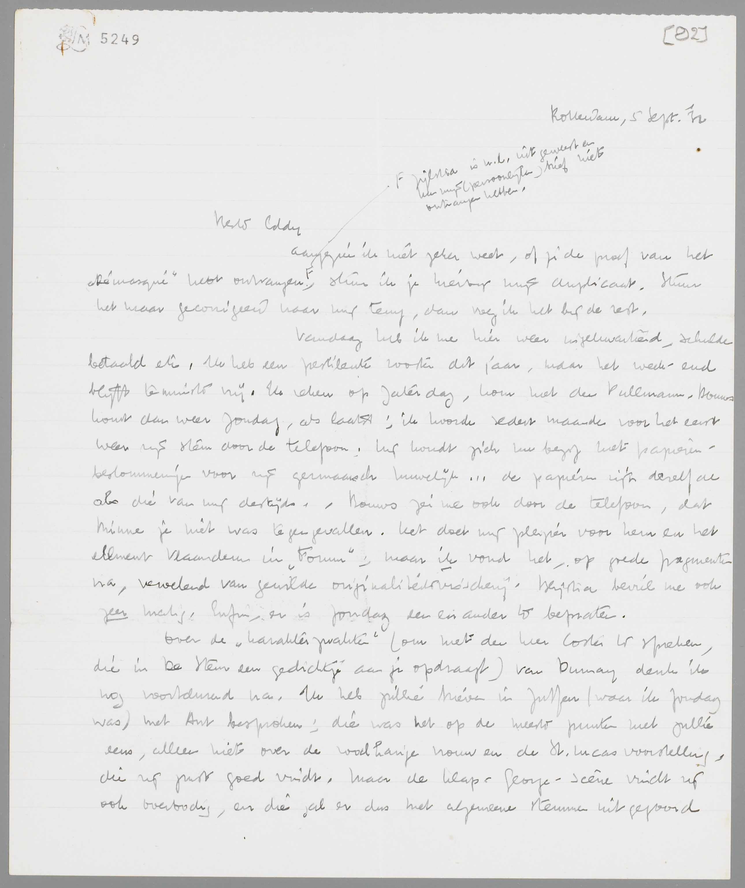 Over de ‘karakterzwakte’ (om met den heer Coster te spreken, die in De Stem een gedichtje aan je opdraagt) van Dumay denk ik nog voortdurend na. Ik heb jullie brieven in Zutfen (waar ik Zondag was) met Ant besproken; die was het op de meeste punten met jullie eens, alleen niet over de roodharige vrouw en de St. Lucas voorstelling, die zij juist goed vindt. Maar de klap-George-scène vindt zij ook overbodig, en die zal er dus met algemeene stemmen uitgegooid moeten worden. Het is waar, dat George onnoodig in waarde verminderd wordt en er zit in de klap iets gewilds-analoogs. Alleen: voor de spuugscène Lucas-Karin (die jij n.l. ‘niet erg gelukkig’ noemt) neem ik het nu eens met 100% auteurswoede op! Dat lijkt mij zelf één van de beste stukken van het heele boek.
