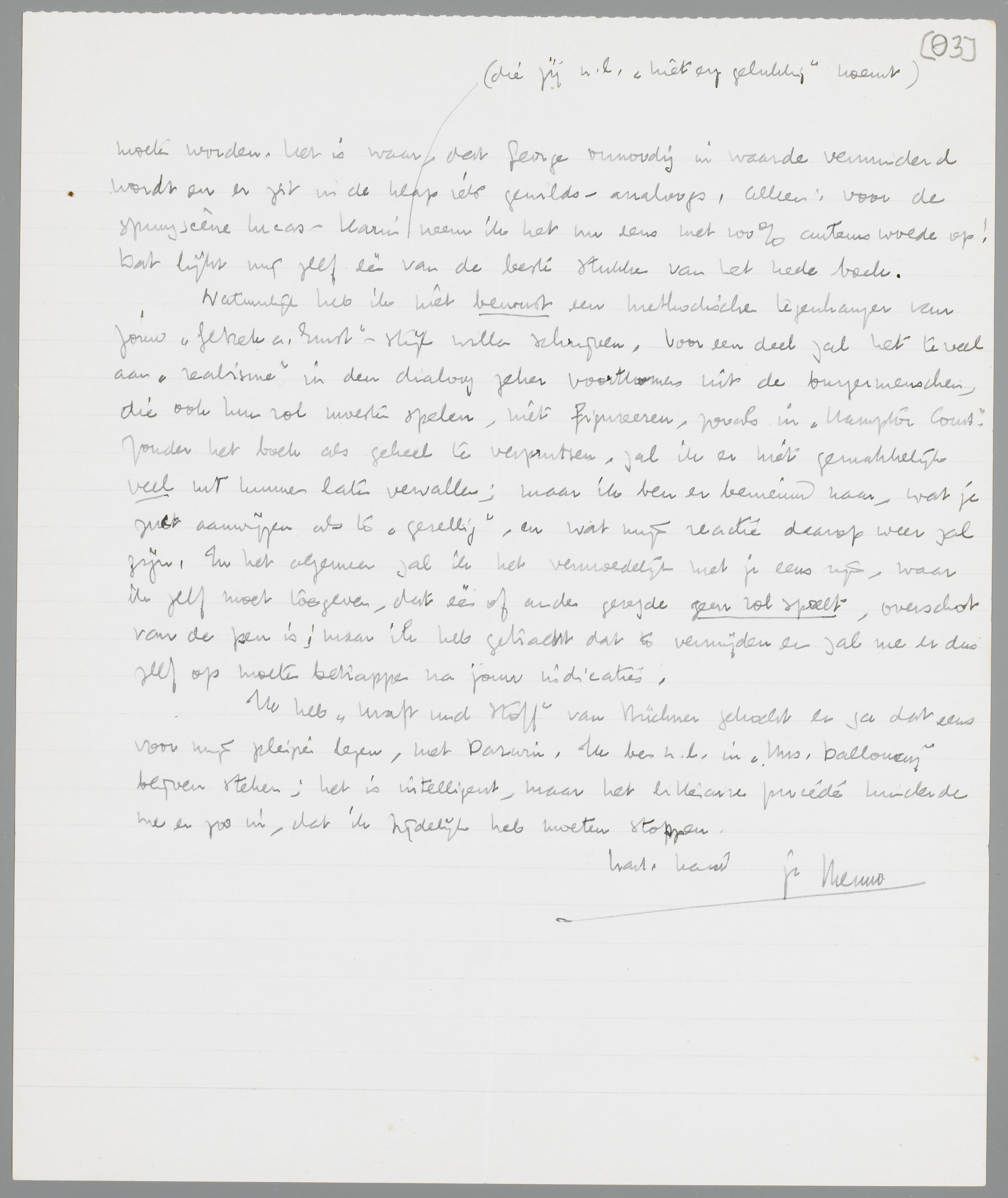 Natuurlijk heb ik niet bewust een methodische tegenhanger van jouw Gebrek a. Ernst-stijl willen schrijven. Voor een deel zal het te veel aan ‘realisme’ in den dialoog zeker voortkomen uit de burgermenschen, die ook hun rol moesten spelen, niet figureeren, zooals in Hampton Court. Zonder het boek als geheel te verprutsen, zal ik er niet gemakkelijk veel uit kunnen laten vervallen; maar ik ben er benieuwd naar, wat je zult aanwijzen als te ‘gezellig’, en wat mijn reactie daarop weer zal zijn. In het algemeen zal ik het vermoedelijk met je eens zijn, waar ik zelf moet toegeven, dat één of ander gezegde geen rol speelt, overschot van de pen is; maar ik heb getracht dat te vermijden en zal me er dus zelf op moeten betrappen na jouw indicaties.