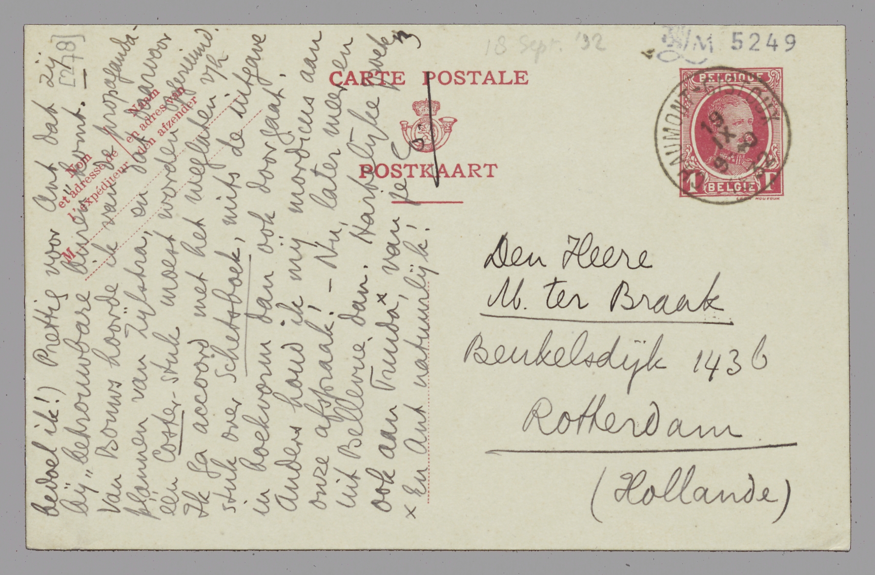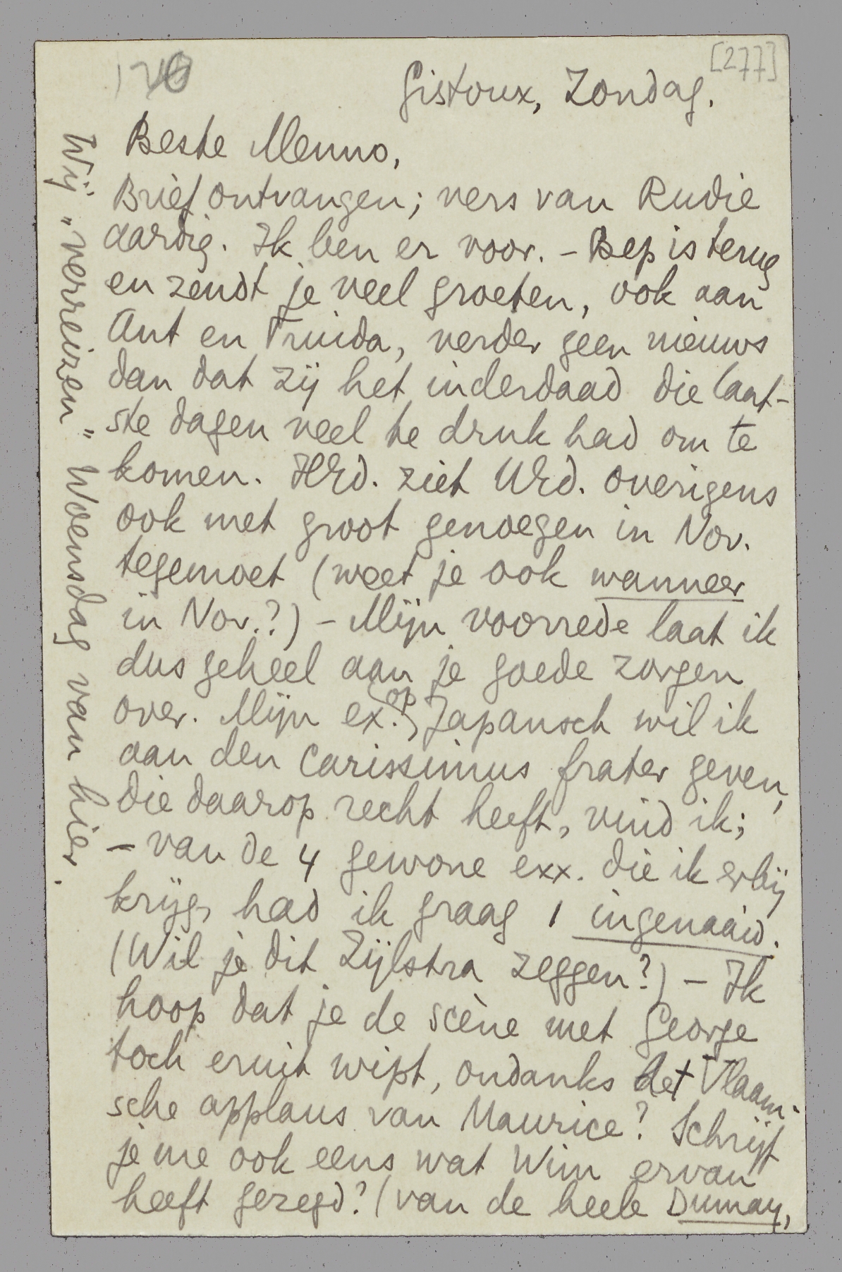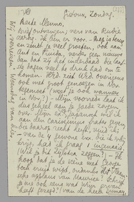 Brief ontvangen; vers van Rudie aardig. Ik ben er voor. - Bep is terug en zendt je veel groeten, ook aan Ant en Truida, verder geen nieuws dan dat zij het inderdaad die laatste dagen veel te druk had om te komen. HEd. ziet UEd. overigens ook met groot genoegen in Nov. tegemoet (weet je ook wanneer in Nov.?) - Mijn voorrede laat ik dus geheel aan je goede zorgen over. Mijn ex. op Japansch wil ik aan den carissimus frater geven die daarop recht heeft, vind ik; - van de 4 gewone exx. die ik erbij krijg, had ik graag 1 ingenaaid. (Wil je dit Zijlstra zeggen?) - Ik hoop dat je de scène met George toch eruit wipt, ondanks het Vlaamsche applaus van Maurice? Schrijf je me ook eens wat Wim ervan heeft gezegd? (van de heele Dumay, bedoel ik!) Prettig voor Ant dat zij bij ‘betrouwbare buren’ komt. - Van Bouws hoorde ik van de propagandaplannen van Zijlstra, en dat daarvoor één Coster-stuk moest worden opgeruimd. Ik ga accoord met het weglaten v/h stuk over Schetsboek, mits de uitgave in boekvorm dan ook doorgaat. Anders houd ik mij mordicus aan onze afspraak! - Nu, later meer en uit Bellevue dan. Hartelijke groeten, ook aan Truida*, van je