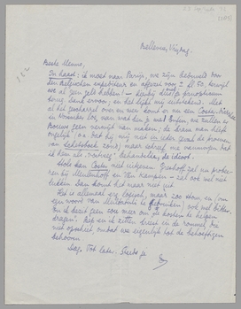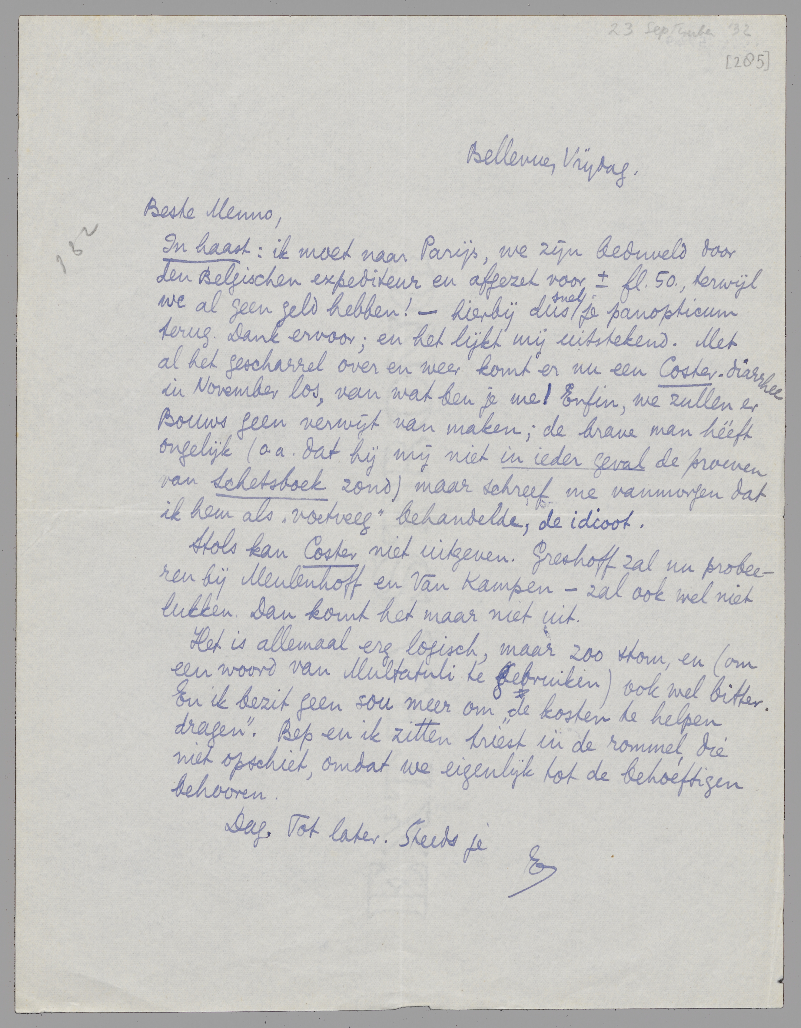 In haast: ik moet naar Parijs, we zijn beduveld door den Belgischen expediteur en afgezet voor ± fl. 50., terwijl we al geen geld hebben! - hierbij dus snel je panopticum terug. Dank ervoor; en het lijkt mij uitstekend. Met al het gescharrel over en weer komt er nu een Coster-diarrhee in November los, van wat ben je me! Enfin, we zullen er Bouws geen verwijt van maken; de brave man hééft ongelijk (o.a. dat hij mij niet in ieder geval de proeven van Schetsboek zond) maar schreef me vanmorgen dat ik hem als ‘voetveeg’ behandelde, de idioot. Stols kan Coster niet uitgeven. Greshoff zal nu probeeren bij Meulenhoff en Van Kampen - zal ook wel niet lukken. Dan komt het maar niet uit.