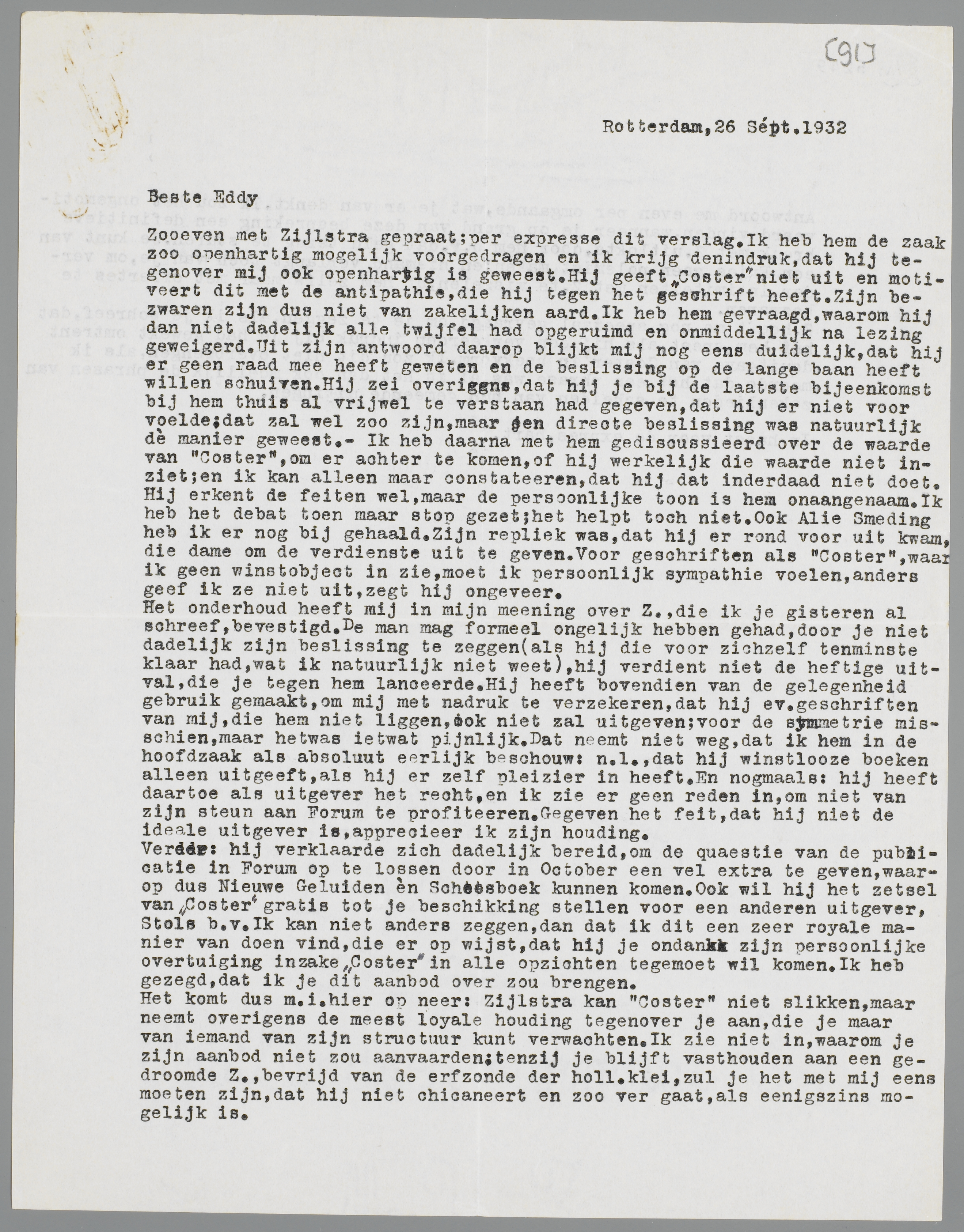 Zooeven met Zijlstra gepraat; per expresse dit verslag. Ik heb hem de zaak zoo openhartig mogelijk voorgedragen en ik krijg den indruk, dat hij tegenover mij ook openhartig is geweest. Hij geeft Coster niet uit en motiveert dit met de antipathie, die hij tegen het geschrift heeft. Zijn bezwaren zijn dus niet van zakelijken aard. Ik heb hem gevraagd, waarom hij dan niet dadelijk alle twijfel had opgeruimd en onmiddellijk na lezing geweigerd. Uit zijn antwoord daarop blijkt mij nog eens duidelijk, dat hij er geen raad mee heeft geweten en de beslissing op de lange baan heeft willen schuiven. Hij zei overigens, dat hij je bij de laatste bijeenkomst bij hem thuis al vrijwel te verstaan had gegeven, dat hij er niet voor voelde; dat zal wel zoo zijn, maar een directe beslissing was natuurlijk dè manier geweest. - Ik heb daarna met hem gediscussieerd over de waarde van Coster, om er achter te komen, of hij werkelijk die waarde niet inziet; en ik kan alleen maar constateeren, dat hij dat inderdaad niet doet. Hij erkent de feiten wel, maar de persoonlijke toon is hem onaangenaam. Ik heb het debat toen maar stop gezet; het helpt toch niet. Ook Alie Smeding heb ik er nog bij gehaald. Zijn repliek was, dat hij er rond voor uit kwam, die dame om de verdienste uit te geven. Voor geschriften als Coster, waar ik geen winstobject in zie, moet ik persoonlijk sympathie voelen, anders geef ik ze niet uit, zegt hij ongeveer.