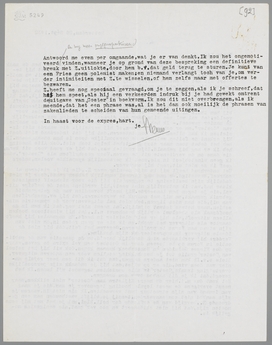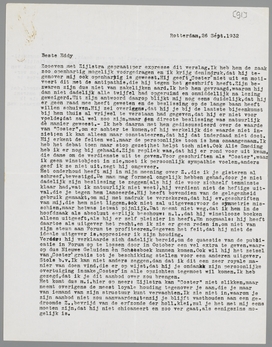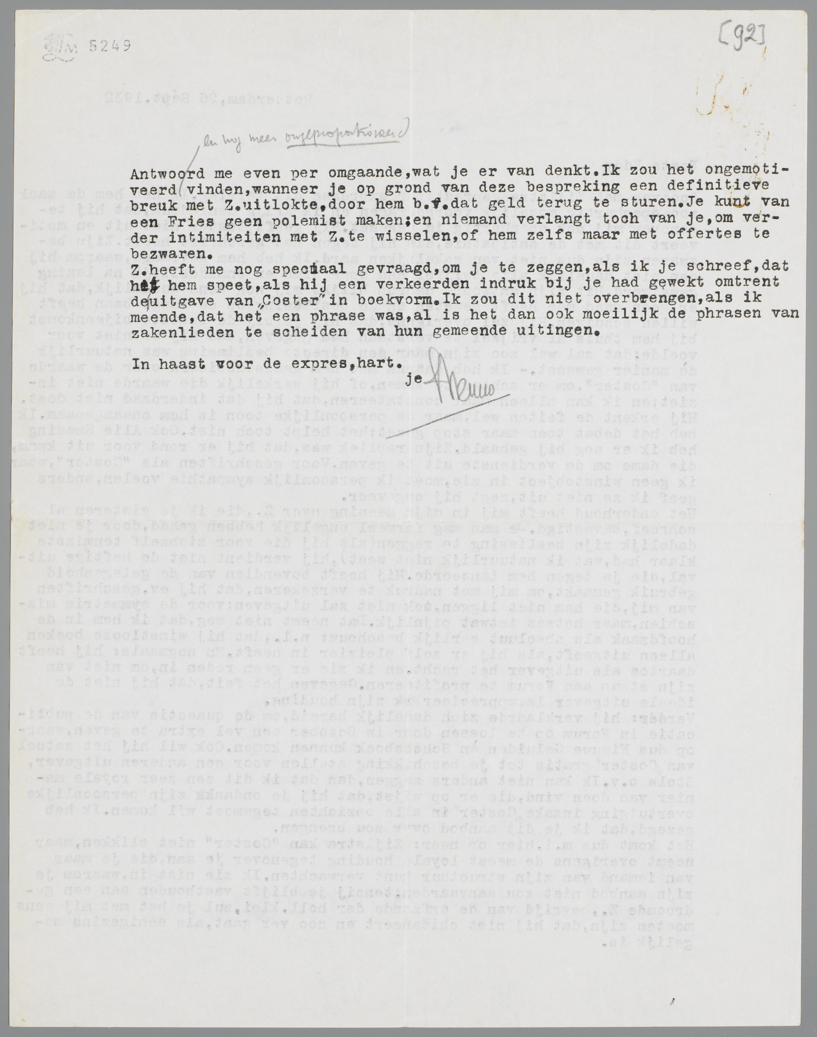 Z. heeft me nog speciaal gevraagd, om je te zeggen, als ik je schreef, dat het hem speet, als hij een verkeerden indruk bij je had gewekt omtrent de uitgave van Coster in boekvorm. Ik zou dit niet overbrengen, als ik meende, dat het een phrase was, al is het dan ook moeilijk de phrasen van zakenlieden te scheiden van hun gemeende uitingen.