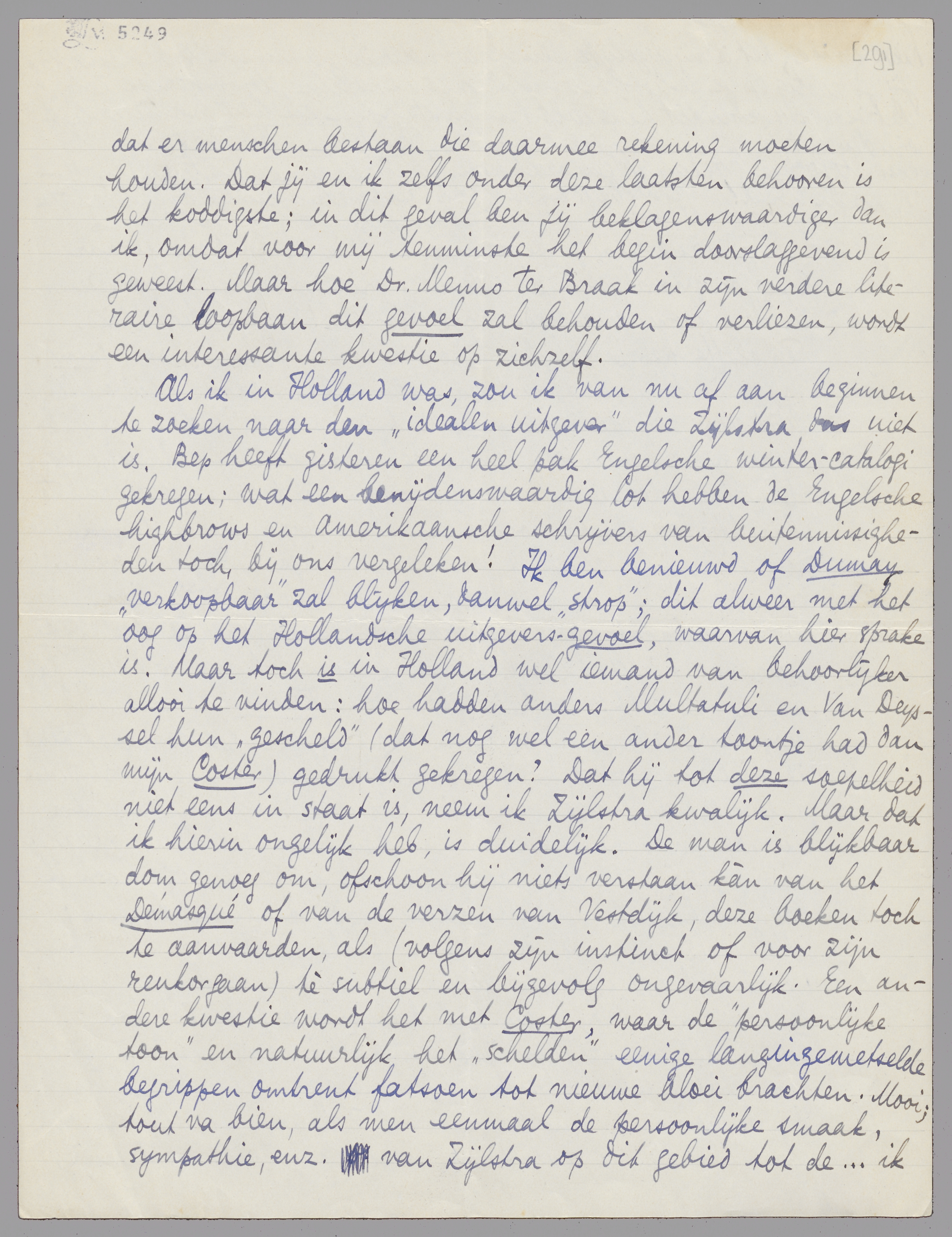 Ik verwacht van Stols antwoord wat betreft die Coster-uitgave. Liefst had ik het boek dan ook maar heelemaal anders gedrukt. In het zetsel van Forum zou ik n.l. nog verscheidene wijzigingen willen; ook het formaat vind ik niet zoo aardig - en vooral, waarom deze soort gunst aanvaarden in een kwestie als deze? Ik wil Zijlstra nu niet meer kwetsen en zal hem dat geld dus maar niet ‘in zijn gezicht gooien’, zooals jij zegt, ofschoon ik het gemakkelijk van Malraux had kunnen krijgen; alles welbeschouwd is Zijlstra inderdaad voor zijn doen wschl. tot het uiterste gegaan! Er zijn 2 dingen waarin ik mij wschl. vergis en zal blijven vergissen: dat er zooiets als een persoonlijke sympathie van Zijlstra voor geschriften bestaat (maar het is waar, hij plengt tranen bij de romans van Maurice en Helman, en siddert van spanning bij de avonturen van Camoës) - en daarnà, dat er menschen bestaan die daarmee rekening moeten houden. Dat jij en ik zelfs onder deze laatsten behooren is het koddigste; in dit geval ben jij beklagenswaardiger dan ik, omdat voor mij tenminste het begin doorslaggevend is geweest. Maar hoe Dr. Menno ter Braak in zijn verdere literaire loopbaan dit gevoel zal behouden of verliezen, wordt een interessante kwestie op zichzelf.