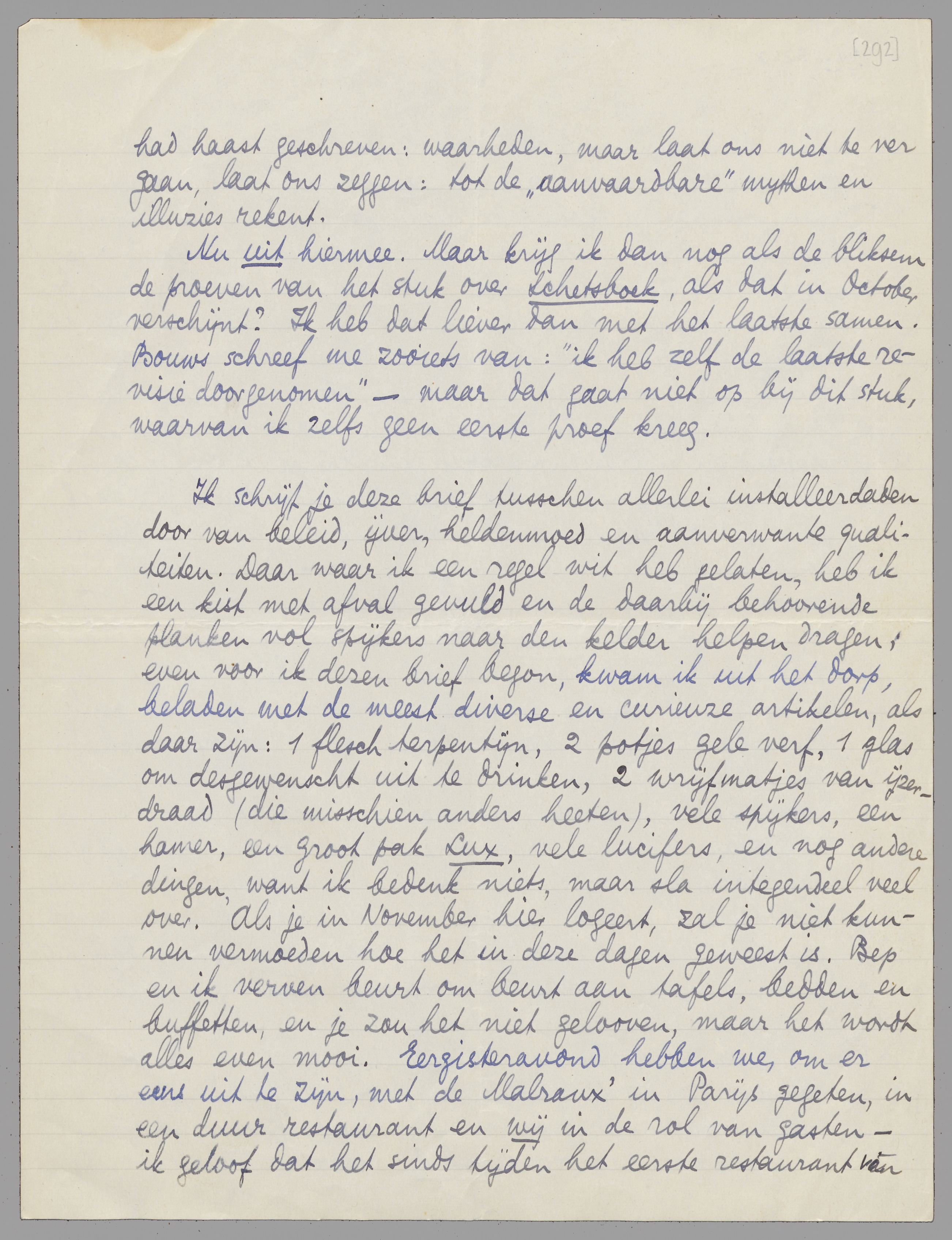 Ik schrijf je deze brief tusschen allerlei installeerdaden door van beleid, ijver, heldenmoed en aanverwante qualiteiten. Daar waar ik een regel wit heb gelaten, heb ik een kist met afval gevuld en de daarbij behoorende planken vol spijkers naar den kelder helpen dragen; even voor ik dezen brief begon, kwam ik uit het dorp, beladen met de meest diverse en curieuze artikelen, als daar zijn: 1 flesch terpentijn, 2 potjes gele verf, 1 glas om desgewenscht uit te drinken, 2 wrijfmatjes van ijzerdraad (die misschien anders heeten), vele spijkers, een hamer, een groot pak Lux, vele lucifers, en nog andere dingen, want ik bedenk niets, maar sla integendeel veel over. Als je in November hier logeert, zal je niet kunnen vermoeden hoe het in deze dagen geweest is. Bep en ik verven beurt om beurt aan tafels, bedden en buffetten, en je zou het niet gelooven, maar het wordt alles even mooi. Eergisteravond hebben we, om er eens uit te zijn, met de Malraux' in Parijs gegeten, in een duur restaurant en wij in de rol van gasten - ik geloof dat het sinds tijden het eerste restaurant van dit soort is, waar wij ons ‘attableerden’; Bep heeft zéér gesmuld van een visch in een roomig sausje, en ik heb 2 X genomen van een pâté de foie gras die gegarandeerd uit Périgord kwam; dit alles, en de dingen die ik weer oversla, doorgespoeld met een uitgezochte Vouvray, en overstroomd door een conversatie van Malraux over Shakespeare, over de karakters van Pia en Germaine Chevasson, over Lawrence, over Huxley, over nog 1000 dingen die ik ditmaal niet oversla omdat ik ze vergeten ben, maar die allemaal boeiend en intelligent waren en briljant en overdonderend snel afgedraaid. Malraux herinnert zich jou nog heel goed en houdt zich voorbereid om in November de conversatie over Stalin met je te hervatten, precies dáár waar ze 2 jaar geleden werd afgebroken, omdat ‘cette question doit être vidée’. Hij was alleraardigst en maakte zich van het 1e oogenblik af al ideeën over het plaatsen in de een of andere betrekking van Bep en van mij! Clara daarentegen is moe en niet goed op dreef, ofschoon ook als altijd aardig en nog meer dan intelligent, zelfs voor wat Dumay een ‘intellectueele vrouw’ noemt.