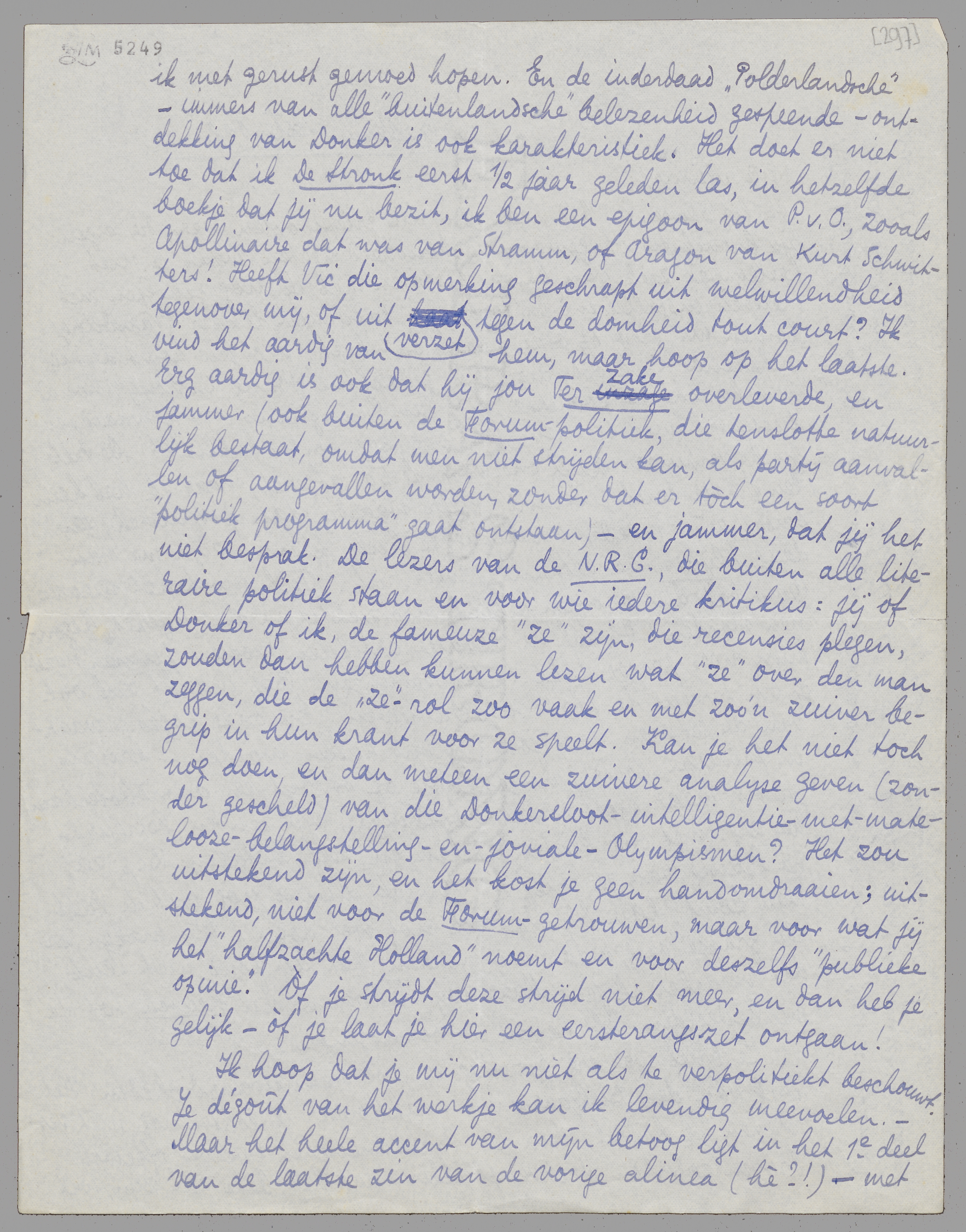 Je brief was erg gezellig en vol wetenswaardigheden. Het stuk van den Bulgaarschen naaktlooper is echter nog niet verschenen, ik bedoel: van den Balkaneeschen zwerver oftewel Provençaalschen druivenplukker; dat het bête zal zijn, wil ik met gerust gemoed hopen. En de inderdaad ‘Polderlandsche’ - immers van alle ‘buitenlandsche’ belezenheid gespeende - ontdekking van Donker is ook karakteristiek. Het doet er niet toe dat ik De Stronk eerst 1/2 jaar geleden las, in hetzelfde boekje dat jij nu bezit, ik ben een epigoon van P.v.O., zooals Apollinaire dat was van Stramm, of Aragon van Kurt Schwitters! Heeft Vic die opmerking geschrapt uit welwillendheid tegenover mij, of uit verzet tegen de domheid tout court? Ik vind het aardig van hem, maar hoop op het laatste. Erg aardig is ook dat hij jou Ter zake overleverde, en jammer (ook buiten de Forum-politiek, die tenslotte natuurlijk bestaat, omdat men niet strijden kan, als partij aanvallen of aangevallen worden, zonder dat er tòch een soort ‘politiek programma’ gaat ontstaan) - en jammer, dat jij het niet besprak. De lezers van de N.R.C., die buiten alle literaire politiek staan en voor wie iedere kritikus: jij of Donker of ik, de fameuze ‘ze’ zijn, die recensies plegen, zouden dan hebben kunnen lezen wat ‘ze’ over den man zeggen, die de ‘ze-’rol zoo vaak en met zoo'n zuiver begrip in hun krant voor ze speelt. Kan je het niet toch nog doen, en dan meteen een zuivere analyse geven (zonder gescheld) van die Donkersloot-intelligentie-met-matelooze-belangstelling-en-joviale-Olympismen? Het zou uitstekend zijn, en het kost je geen handomdraaien; uitstekend, niet voor de Forum-getrouwen, maar voor wat jij het ‘halfzachte Holland’ noemt en voor deszelfs ‘publieke opinie’. Òf je strijdt deze strijd niet meer, en dan heb je gelijk - òf je laat je hier een eersterangszet ontgaan!