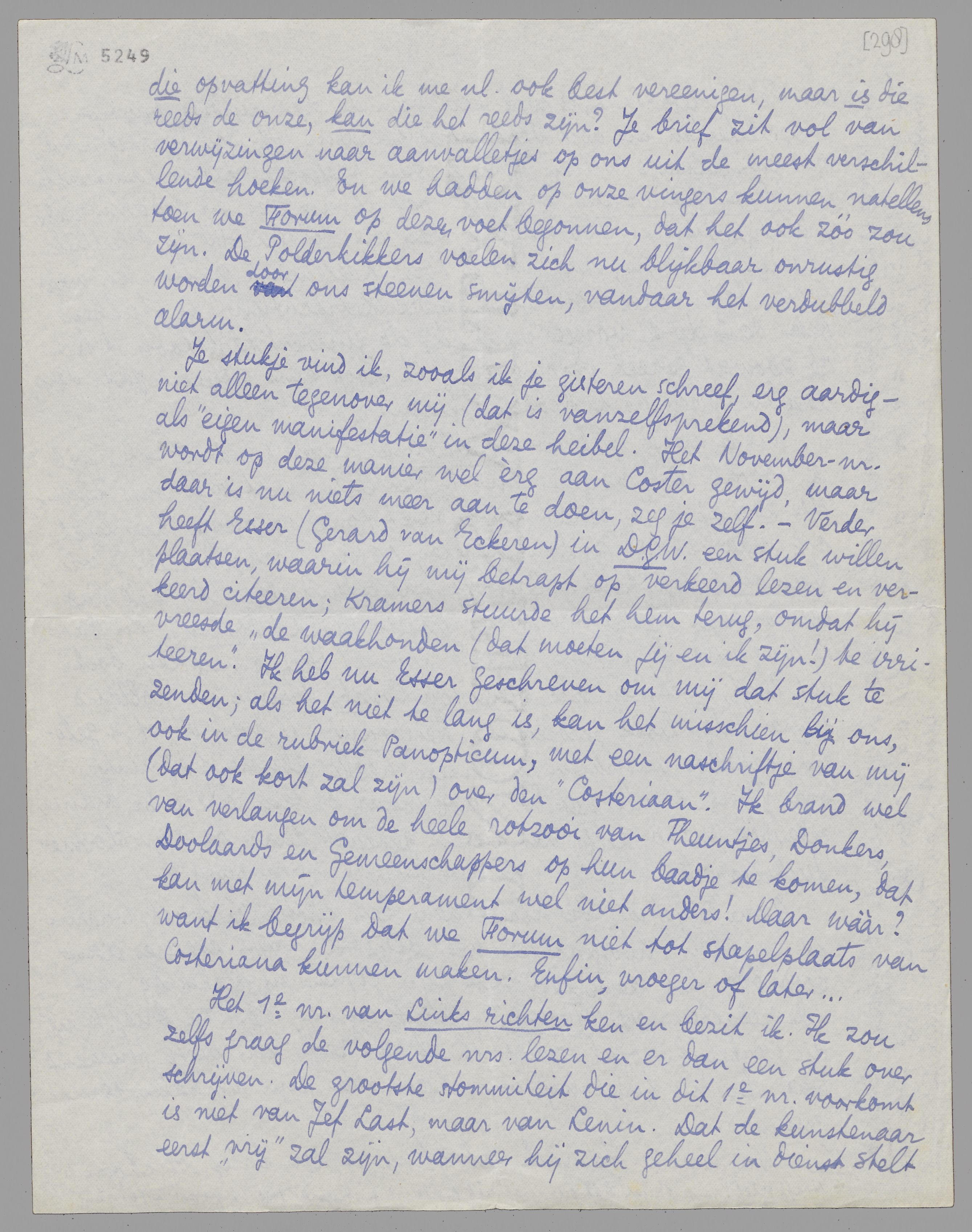 Je stukje vind ik, zooals ik je gisteren schreef, erg aardig - niet alleen tegenover mij (dat is vanzelfsprekend), maar als ‘eigen manifestatie’ in deze heibel. Het November-nr. wordt op deze manier wel èrg aan Coster gewijd, maar daar is nu niets meer aan te doen, zeg je zelf. - Verder heeft Esser (Gerard van Eckeren) in D.G.W. een stuk willen plaatsen, waarin hij mij betrapt op verkeerd lezen en verkeerd citeeren; Kramers stuurde het hem terug, omdat hij vreesde ‘de waakhonden (dat moeten jij en ik zijn!) te irriteeren’. Ik heb nu Esser geschreven om mij dat stuk te zenden; als het niet te lang is, kan het misschien bij ons, ook in de rubriek Panopticum, met een naschriftje van mij (dat ook kort zal zijn) over den ‘Costeriaan’. Ik brand wel van verlangen om de heele rotzooi van Theuntjes, Donkers, Doolaards en Gemeenschappers op hun baadje te komen, dat kan met mijn temperament wel niet anders! Maar wààr? want ik begrijp dat we Forum niet tot stapelplaats van Costeriana kunnen maken. Enfin, vroeger of later...