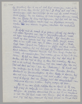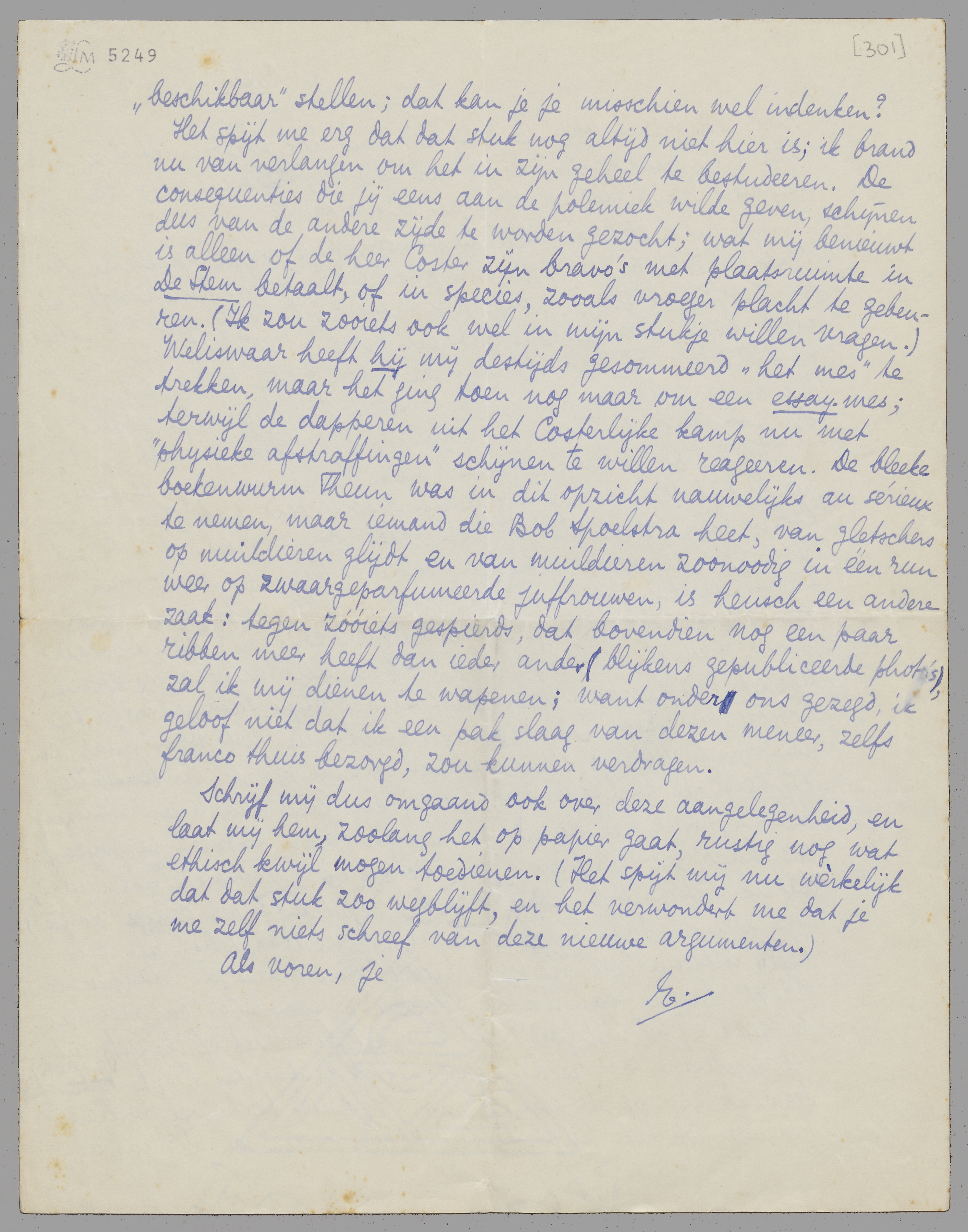 Het spijt me erg dat dat stuk nog altijd niet hier is; ik brand nu van verlangen om het in zijn geheel te bestudeeren. De consequenties die jij eens aan de polemiek wilde geven, schijnen dus van de andere zijde te worden gezocht; wat mij benieuwt is alleen of de heer Coster zijn bravo's met plaatsruimte in de Stem betaalt, of in species, zooals vroeger placht te gebeuren. (Ik zou zooiets ook wel in mijn stukje willen vragen.) Weliswaar heeft hij mij destijds gesommeerd ‘het mes’ te trekken, maar het ging toen nog maar om een essay-mes; terwijl de dapperen uit het Costerlijke kamp nu met ‘physieke afstraffingen’ schijnen te willen reageeren. De bleeke boekenwurm Theun was in dit opzicht nauwelijks au sérieux te nemen, maar iemand die Bob Spoelstra heet, van gletschers op muildieren glijdt en van muildieren zoonoodig in één run weer op zwaargeparfumeerde juffrouwen, is heusch een andere zaak: tegen zóóiets gespierds, dat bovendien nog een paar ribben meer heeft dan ieder ander (blijkens gepubliceerde photo's), zal ik mij dienen te wapenen; want onder ons gezegd, ik geloof niet dat ik een pak slaag van dezen meneer, zelfs franco thuis bezorgd, zou kunnen verdragen.