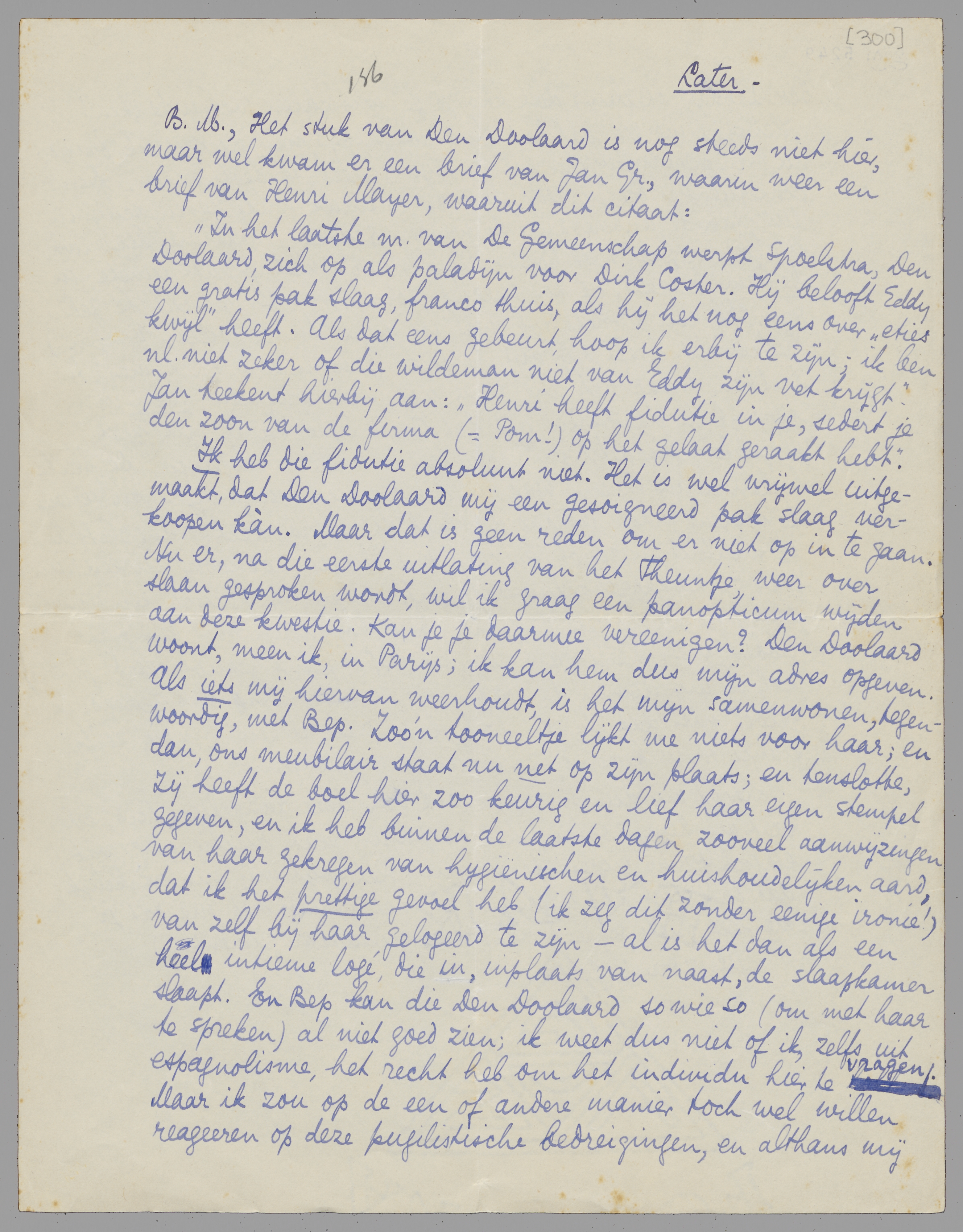 ‘In het laatste nr. van De Gemeenschap werpt Spoelstra, Den Doolaard, zich op als paladijn voor Dirk Coster. Hij belooft Eddy een gratis pak slaag, franco thuis, als hij het nog eens over ‘eties kwijl’ heeft. Als dat eens gebeurt, hoop ik erbij te zijn; ik ben n.l. niet zeker of die wildeman niet van Eddy zijn vet krijgt.’ Jan teekent hierbij aan: ‘Henri heeft fidutie in je, sedert je den zoon van de firma (= Pom!) op het gelaat geraakt hebt’. Ik heb die fidutie absoluut niet. Het is vrijwel uitgemaakt, dat Den Doolaard mij een gesoigneerd pak slaag verkoopen kàn. Maar dat is geen reden om er niet op in te gaan. Nu er, na die eerste uitlating van het Theuntje, weer over slaan gesproken wordt, wil ik graag een panopticum wijden aan deze kwestie. Kan je je daarmee vereenigen? Den Doolaard woont, meen ik, in Parijs; ik kan hem dus mijn adres opgeven. Als iets mij hiervan weerhoudt, is het mijn samenwonen, tegenwoordig, met Bep. Zoo'n tooneeltje lijkt me niets voor haar; en dan, ons meubilair staat nu net op zijn plaats; en tenslotte, zij heeft de boel hier zoo keurig en lief haar eigen stempel gegeven, en ik heb binnen de laatste dagen zooveel aanwijzingen van haar gekregen van hygiënischen en huishoudelijken aard, dat ik het prettige gevoel heb (ik zeg dit zonder eenige ironie!) van zelf bij haar gelogeerd te zijn - al is het dan als een heel intieme logé, die in, inplaats van naast, de slaapkamer slaapt. En Bep kan die den Doolaard so wie so (om met haar te spreken) al niet goed zien; ik weet dus niet of ik, zelfs uit espagnolisme, het recht heb om het individu hier te vragen. Maar ik zou op de een of andere manier toch wel willen reageeren op deze pugilistische bedreigingen, en althans mij ‘beschikbaar’ stellen; dat kan je je misschien wel indenken?