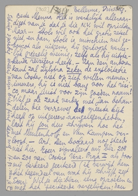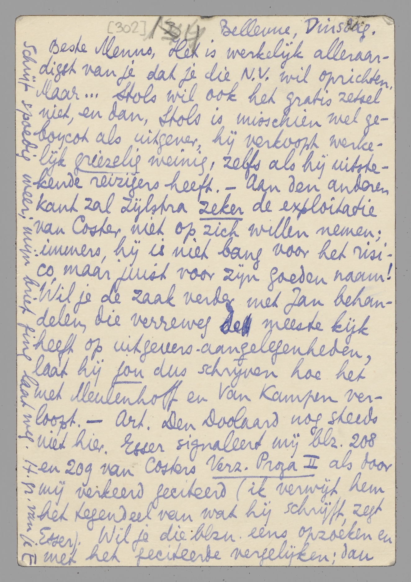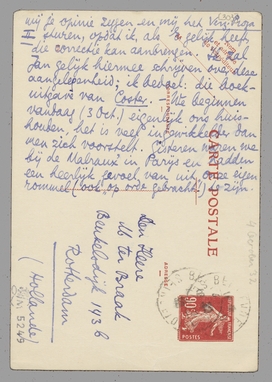 Het is werkelijk alleraardigst van je dat je die N.V. wil oprichten. Maar... Stols wil ook het gratis zetsel niet, en dan, Stols is misschien wel geboycot als uitgever, hij verkoopt werkelijk griezelig weinig, zelfs als hij uitstekende reizigers heeft. - Aan den anderen kant zal Zijlstra zeker de exploitatie van Coster niet op zich willen nemen; immers, hij is niet bang voor het risico, maar juist voor zijn goeden naam! Wil je de zaak verder met Jan behandelen, die verreweg de meeste kijk heeft op uitgevers-aangelegenheden, laat hij jou dus schrijven hoe het met Meulenhoff en van Kampen verloopt. - Art. Den Doolaard nog steeds niet hier. Esser signaleert mij blz. 208 en 209 van Costers Verz. Proza II als door mij verkeerd geciteerd (ik verwijt hem het tegendeel van wat hij schrijft, zegt Esser). Wil je die blzn. eens opzoeken en met het geciteerde vergelijken; dan mij je opinie zeggen en mij het Verz. Proza II sturen, opdat ik, als E. gelijk heeft, die correctie kan aanbrengen. Ik zal Jan gelijk hiermee schrijven over deze aangelegenheid; ik bedoel: die boek-uitgave van Coster. - We beginnen vandaag (3 Oct.) eigenlijk ons huishouden, het is veel ingewikkelder dan men zich voorstelt. Gisteren waren we bij de Malraux' in Parijs en hadden een heerlijk gevoel van uit onze eigen rommel (ook ‘op orde gebracht’!) te zijn. Schrijf spoedig weer; mijn brief ging laat weg. H. gr. van je