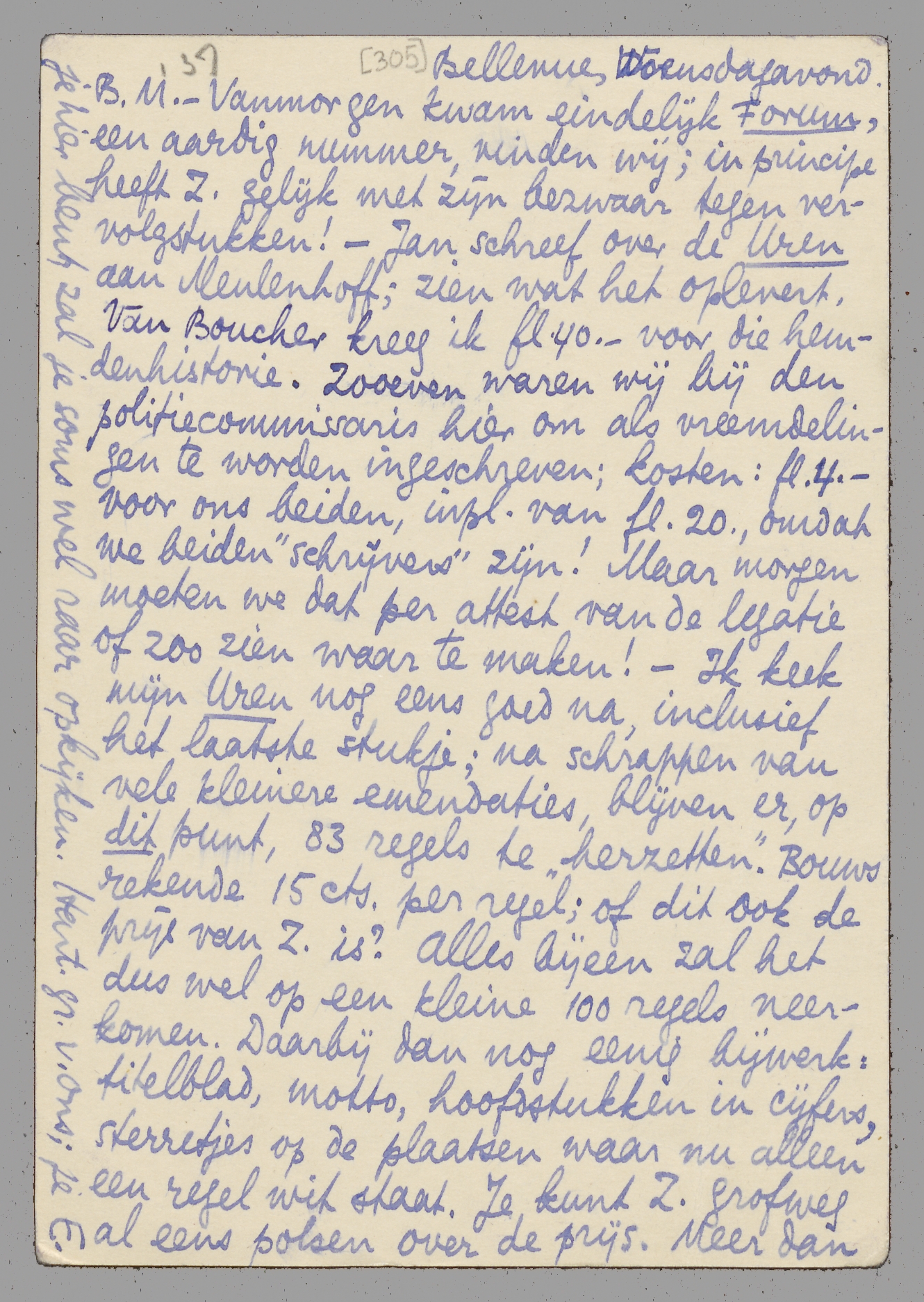 - Vanmorgen kwam eindelijk Forum, een aardig nummer, vinden wij; in principe heeft Z. gelijk met zijn bezwaar tegen vervolgstukken! - Jan schreef over de Uren aan Meulenhoff; zien wat het oplevert. Van Boucher kreeg ik f 40.- voor die hemdenhistorie. Zooeven waren wij bij den politiecommissaris hier om als vreemdelingen te worden ingeschreven; kosten f 4.- voor ons beiden, inpl. van f 20.-, omdat we beiden ‘schrijvers’ zijn! Maar morgen moeten we dat per attest van de legatie of zoo zien waar te maken! - Ik keek mijn Uren nog eens goed na, inclusief het laatste stukje; na schrappen van vele kleinere emendaties, blijven er, op dit punt, 83 regels te ‘herzetten’. Bouws rekende 15 cts. per regel; of dit ook de prijs van Z. is? Alles bijeen zal het dus wel op een kleine 100 regels neerkomen. Daarbij dan nog eenig bijwerk: titelblad, motto, hoofdstukken in cijfers, sterretjes op de plaatsen waar nu alleen een regel wit staat. Je kunt Z. grofweg al eens polsen over de prijs. Meer dan 400 exx. hoeven er toch niet te worden gedrukt - desnoods minder, maar zeker toch wel 250 minimum, omdat ‘je kan nooit weten’. Ik krijg nog antwoord van je op 1 of 2 brieven, dus dit gaat maar als voorloopige inlichting. De teekening van Coster, die misschien in Forum komt, had ik er ook wel graag bij; dat kan niet duur zijn, want het is een lijncliché. - Ik ga probeeren aan verschillende dingen tegelijk te werken, Bep spant zich hevig in om een huisvrouw te zijn, ‘the poor dear’. Als je hier bent, zal je soms wel raar opkijken. Hart. gr. v. ons; je