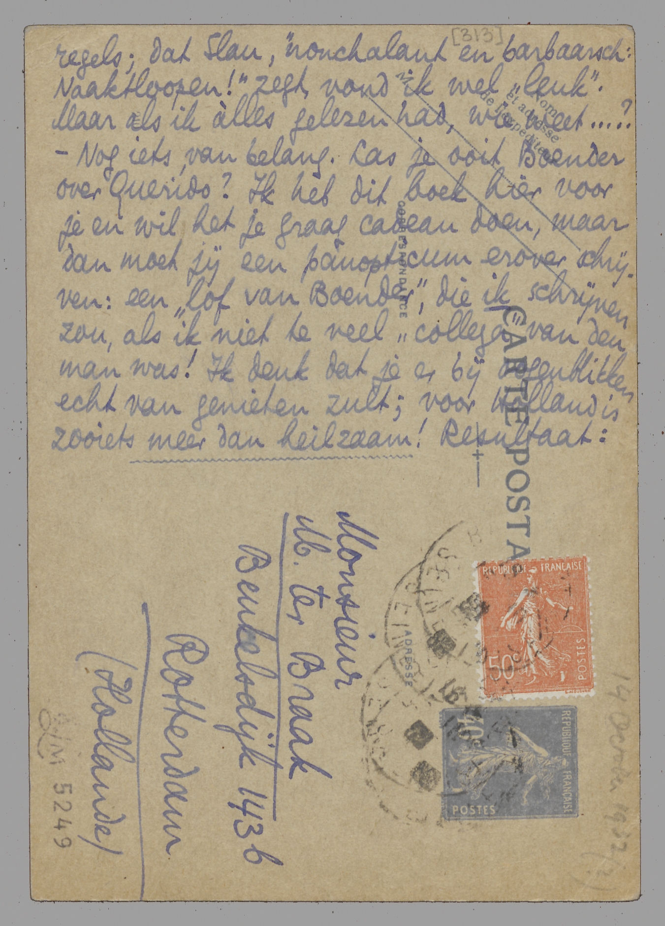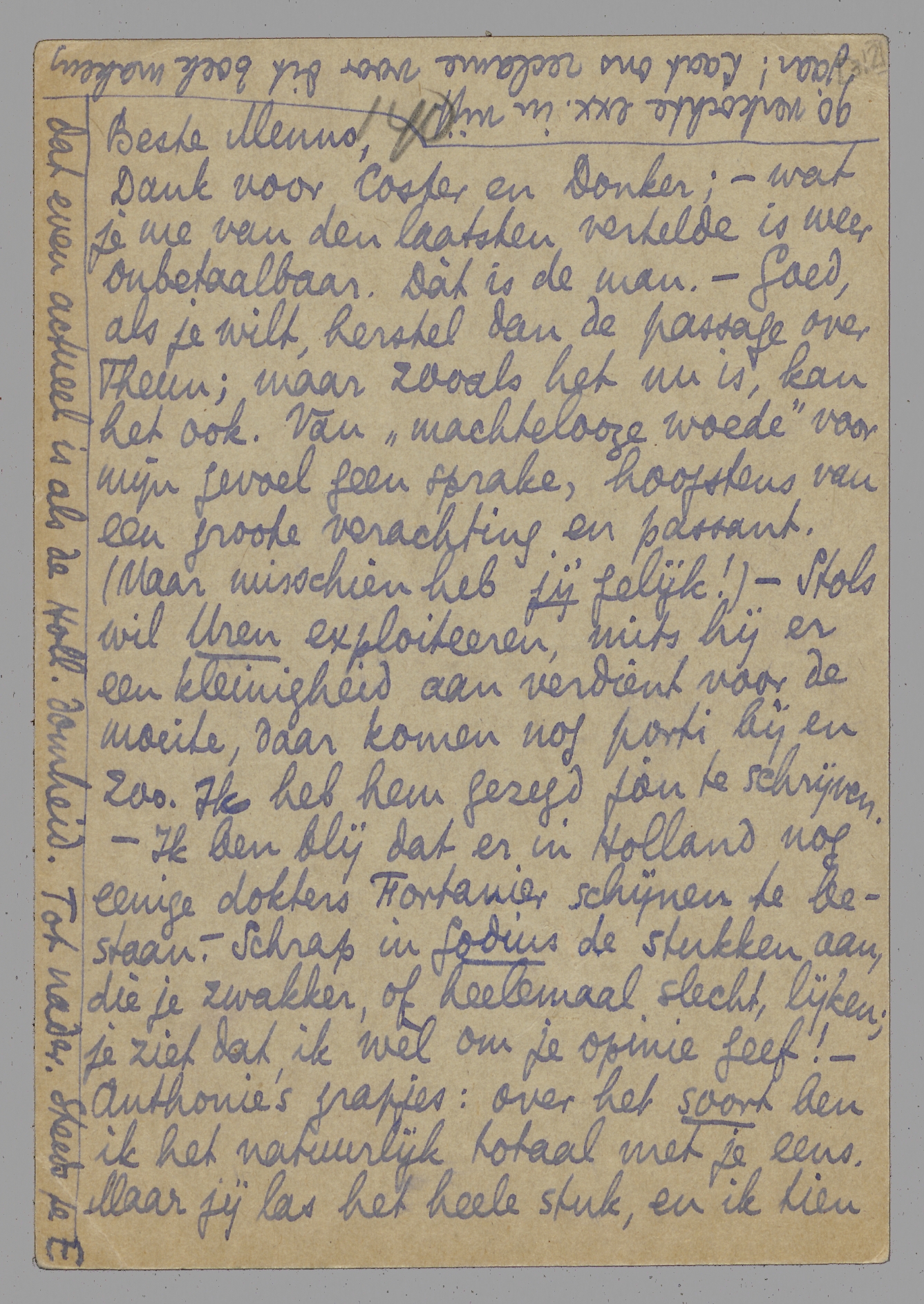 Dank voor Coster en Donker; - wat je me van den laatsten vertelde is weer onbetaalbaar. Dàt is de man. - Goed, als je wilt, herstel dan de passage over Theun; maar zooals het nu is, kan het ook. Van ‘machtelooze woede’ voor mijn gevoel geen sprake, hoogstens van een groote verachting en passant. (Maar misschien heb jij gelijk!) - Stols wil Uren exploiteeren, mits hij er een kleinigheid aan verdient voor de moeite, daar komen nog porti bij en zoo. Ik heb hem gezegd jou te schrijven. - Ik ben blij dat er in Holland nog eenige dokters Fortanier schijnen te bestaan. - Schrap in Godius de stukken aan, die je zwakker, of heelemaal slecht, lijken; je ziet dat ik wèl om je opinie geef! - Anthonie's grapjes: over het soort ben ik het natuurlijk totaal met je eens. Maar jij las het heele stuk, en ik tien regels; dat Slau, ‘nonchalant en barbaarsch: Naaktloopen!’ zegt, vond ik wel ‘leuk’. Maar als ik àlles gelezen had, wie weet...? - Nog iets van belang. Las je ooit Boender over Querido? Ik heb dit boek hier voor je en wil het je graag cadeau doen, maar dan moet jij een panopticum erover schrijven: een ‘lof van Boender’, die ik schrijven zou, als ik niet te veel ‘collega’ van den man was! Ik denk dat je er bij oogenblikken echt van genieten zult; voor Holland is zooiets meer dan heilzaam! Resultaat: 90 verkochte exx. in vijf jaar! Laat ons reclame voor dit boek maken, dat even actueel is als de Holl. domheid. Tot nader. Steeds je