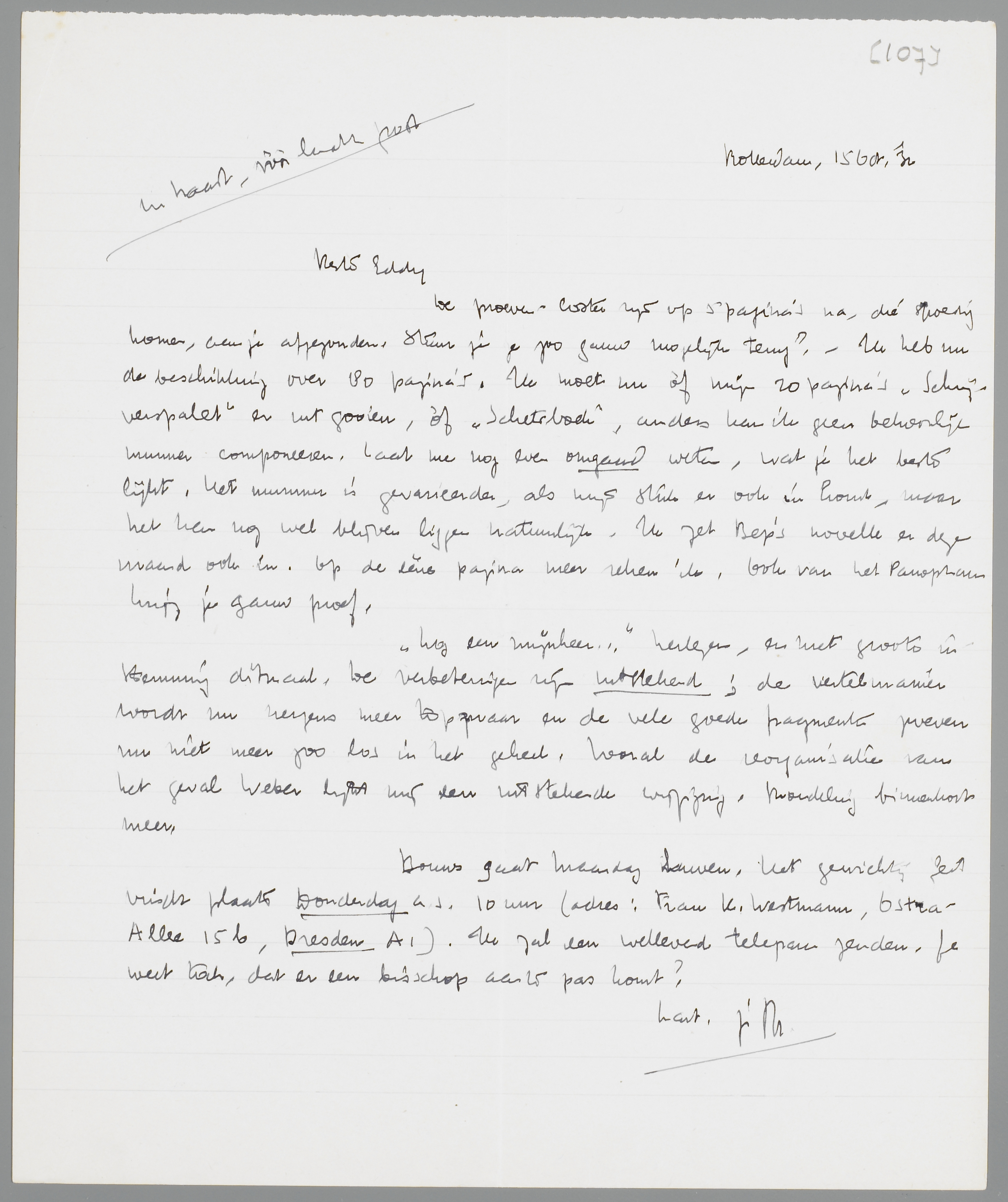 Bouws gaat Maandag [huwen]. Het gewichtig feit vindt plaats Donderdag a.s. 10 uur (adres: Frau K. Westmann, Ostra-Allee 15b, Dresden A1). Ik zal een wellevend telegram zenden. Je weet toch, dat er een bisschop aan te pas komt?