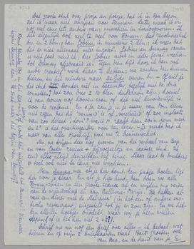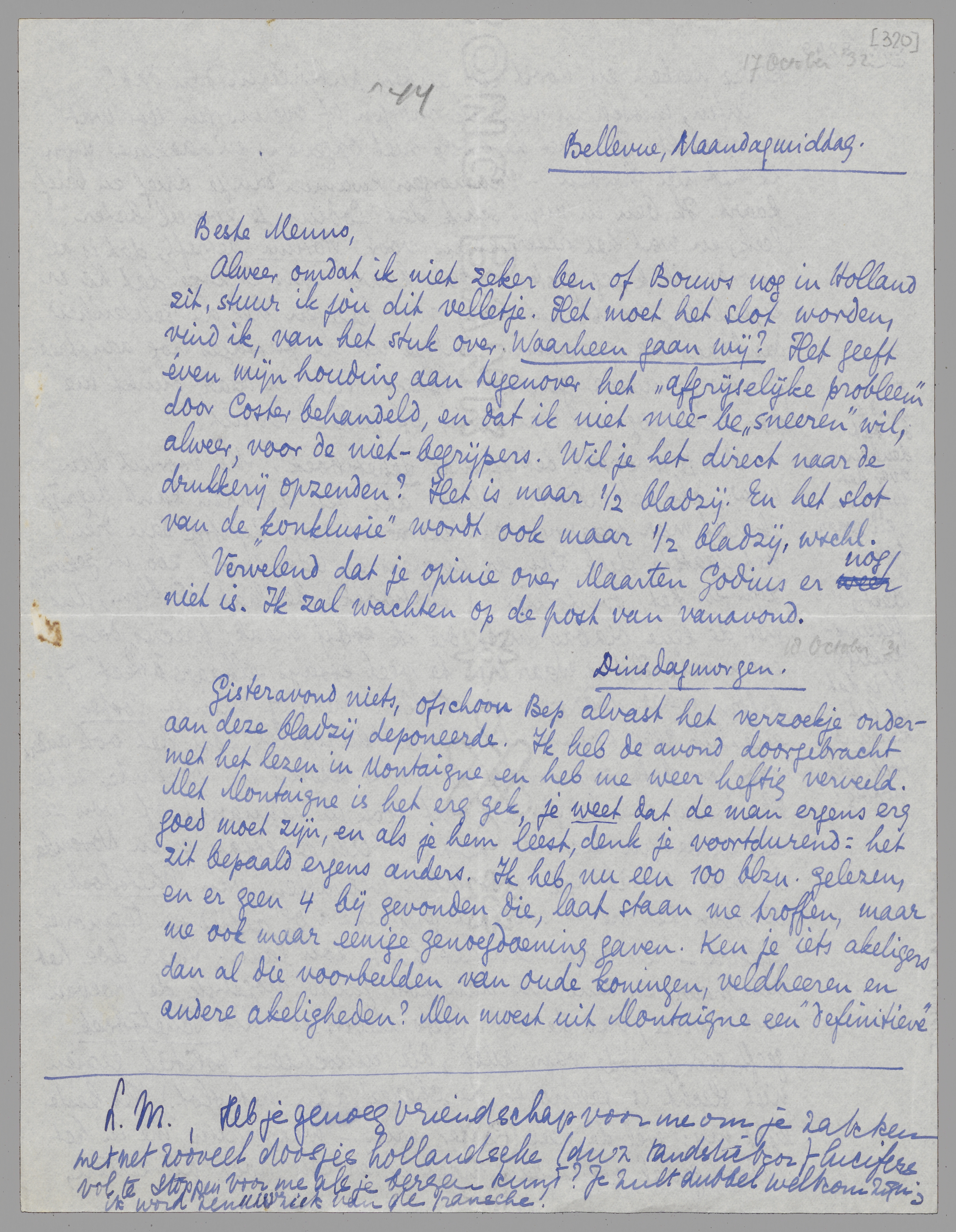 Dat groote stuk over proza en poëzie, dat ik in Spa begon, zal ik maar niet schrijven voor Januari. Later maak ik er nog wel eens iets anders van; misschien in dialoogvorm. Ik heb eigenlijk ook veel te veel voor Forum. Dat revolutiestuk bv. in 2 dln.; dan Godius, in minstens 2 dln.; ik vrees dat het er niet allemaal meer ingaat. Godius en Dumay samen is niet goed, vind ik; dus Godius moet in ieder geval wachten tot Dumay afgedraaid is... Tegen dien tijd hoop ik dan ook ander ‘creatief’ werk klaar te hebben; we zouden dan kunnen kiezen, en het mindere naar De Gids sturen bv. - Of wil je het stuk over Donker wèl in December, tegelijk met de drie sonnetten? dat zou dus ± 10 blzn. du Perron zijn, hoewel ik van Bouws nog hooren wou of dit wel bevorderlijk is voor de reclame. En o ja, zou je, in je essay, van Pom liever niet zeggen dat hij ‘verward’ is, of ‘versluierd’ of zoo, inplaats van zoo direct ‘dom’? want 1o raakt hem zoo'n term meer en 2o is het overtuigender voor den lezer. - Je merkt dat ik maar van alles opschrijf, wat me te binnen schiet.