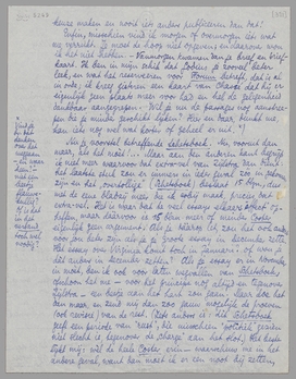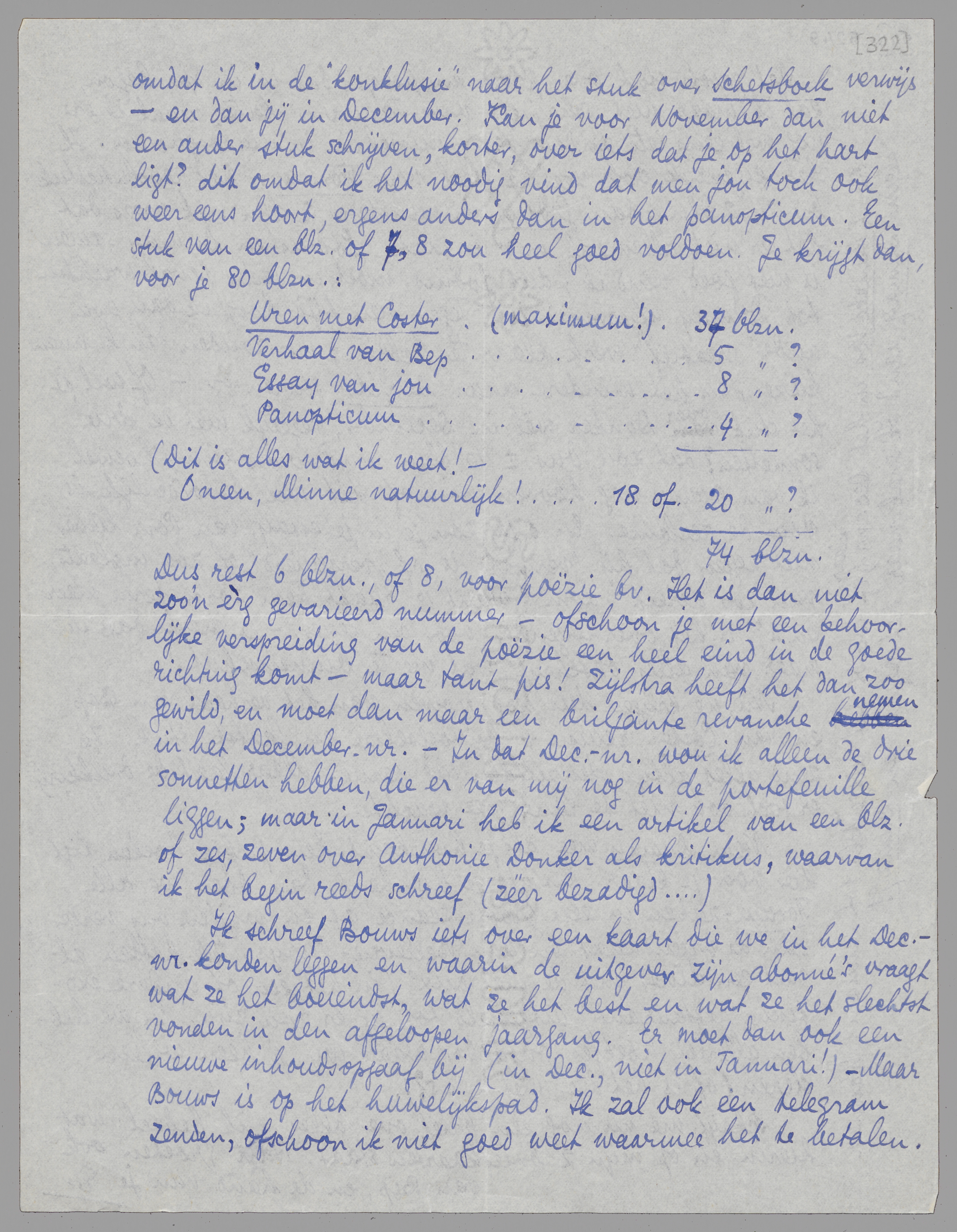 Nu je voorstel betreffende Schetsboek. Nu, vooruit dan maar, als het moèt!... Maar aan den anderen kant begrijp ik niet meer waarvoor dat extra-vel van Zijlstra dan dient: het laatste stuk zou er immers in ieder geval zóó in gekomen zijn en het ‘overtollige’ (Schetsboek) beslaat 15 blzn., dus met de eene bladzij meer die ik erbij maak, precies dat extra-vel. Het is waar dat te veel essays elkaars ‘effect’ opheffen, maar dààrvoor is 15 blzn. meer of minder Coster eigenlijk geen argument. Als je dààrop let, zou het ook anders voor jou beter zijn als je je groote essay in December zette. Het essay over Virginia komt toch in Januari? Of wou je dàt anders in December zetten? Als je essay er in November in moèt, ben ik ook voor laten wegvallen van Schetsboek, ofschoon het me - voor het principe nog altijd en tegenover Zijlstra - een beetje aan het hart zou gaan. Maar doe het dan maar, en zend mij dan zoo gauw mogelijk de proeven (ook revisie) van de rest. (Iets anders is: dit Schetsboek geeft een periode van ‘rust’, die misschien ‘politiek’ gezien niet slecht is, tegenover de ‘charge’ aan het slot.) Het beste lijkt mij: wèl de heele Coster erin - waarschuw me in het andere geval, want dan moet ik er een noot bij zetten, omdat ik in de ‘konklusie’ naar het stuk over Schetsboek verwijs - en dan jij in December. Kan je voor November dan niet een ander stuk schrijven, korter, over iets dat je op het hart ligt? dit omdat ik het noodig vind dat men jou toch ook weer eens hoort, ergens anders dan in het panopticum. Een stuk van een blz. of 7, 8 zou heel goed voldoen. Je krijgt dan, voor je 80 blzn.: